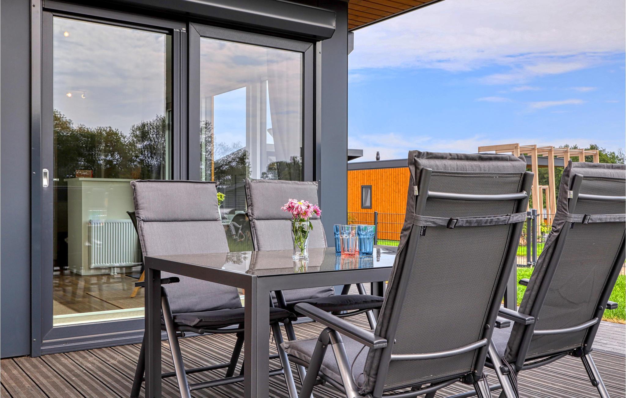 Auf der großen und zusätzlich überdachten Terrasse finden Sie eine komplette Gartenmöbel-Garnitur inklusive Stuhlauflagen. Von dort aus genießen Sie einen tollen Ausblick, da sich das Chalet auf einer leichten Anhöhe befindet.