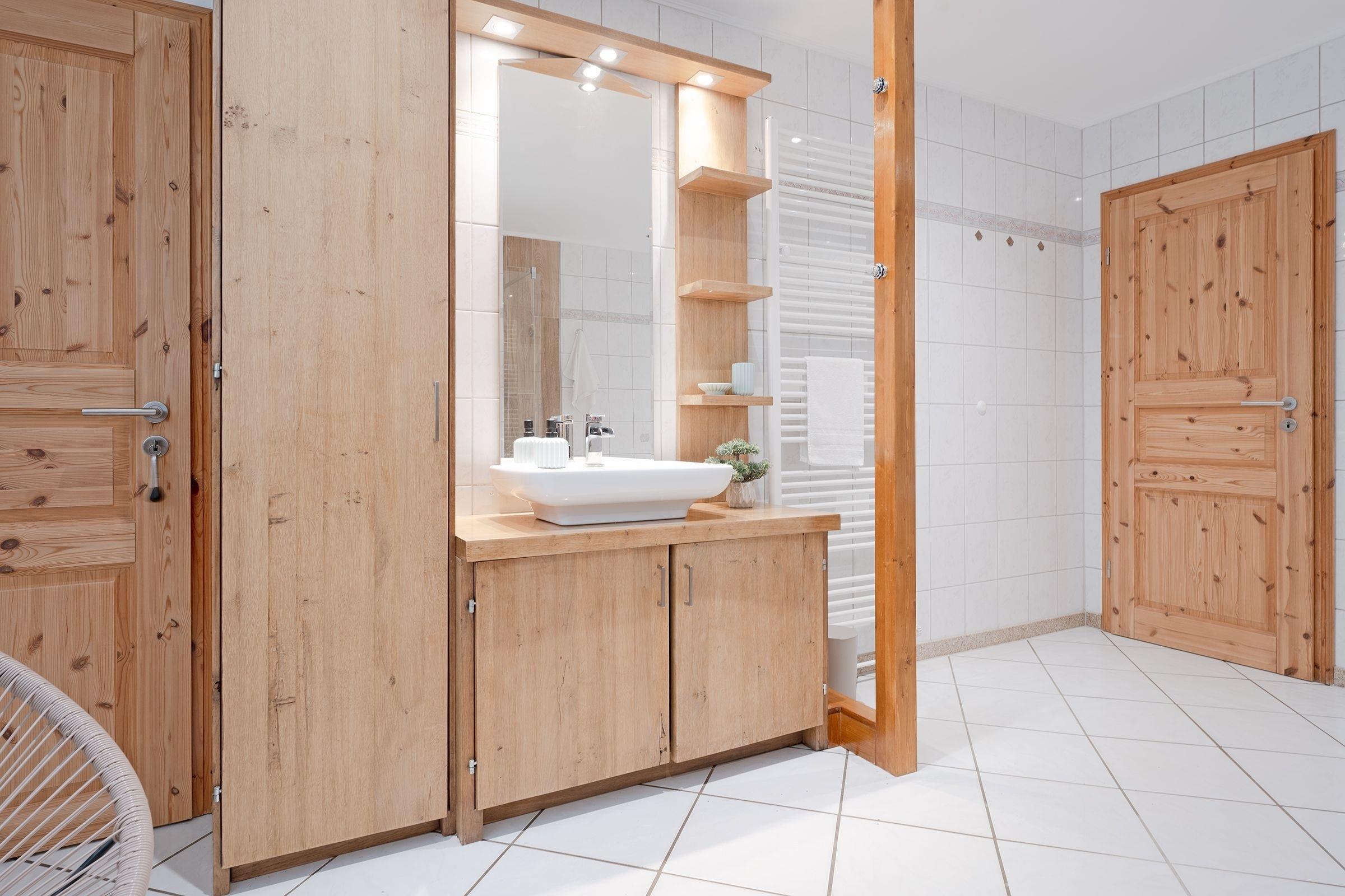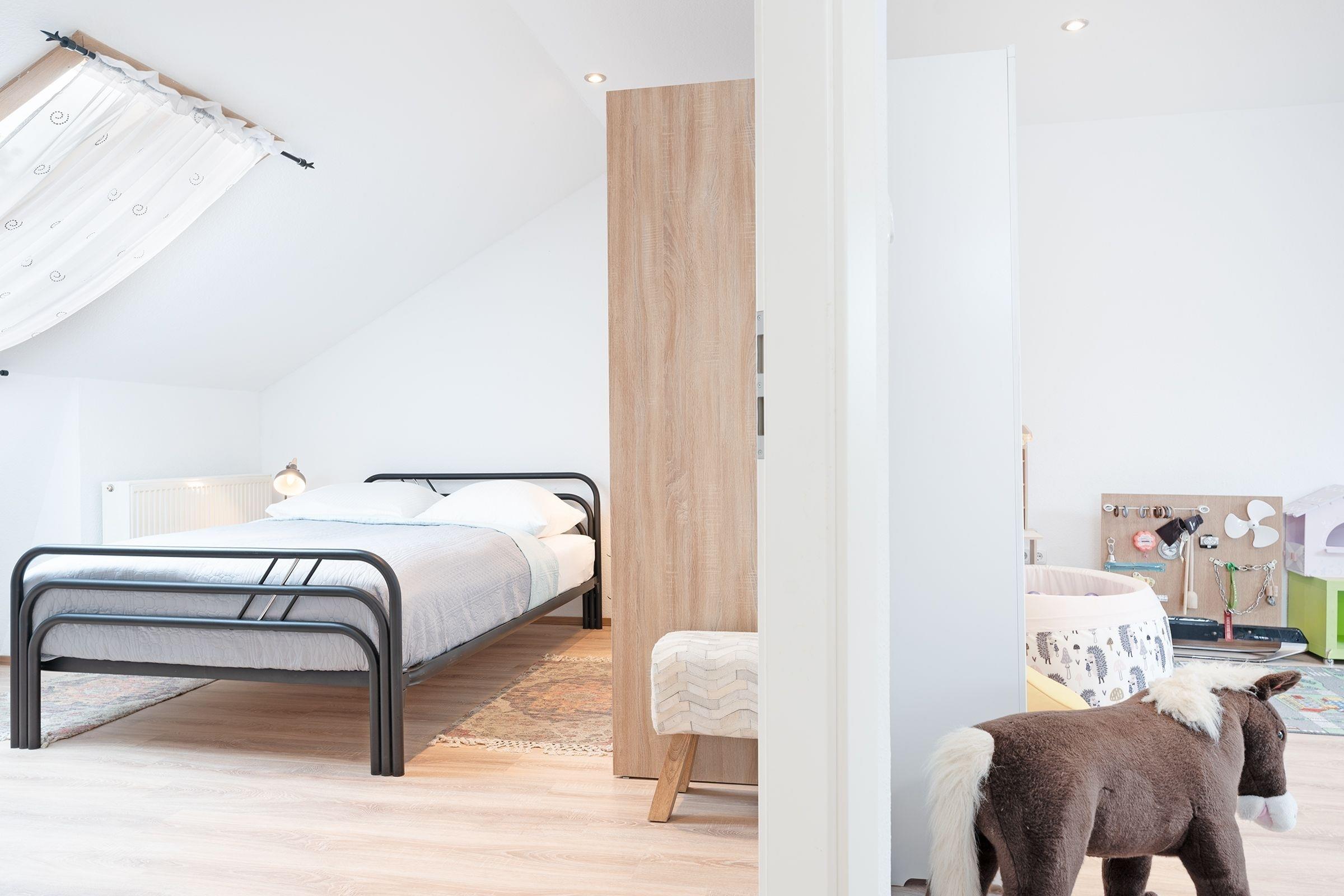 Der offene Galeriebereich im Oberschoss mit Zugang zum Südbalkon ist ein perfekter Bereich zum Verweilen - die kleinen Gäste freuen sich hier über ein Spielzimmer. Nebenan befindet sich das 4. Schlafzimmer mit Doppelbett (140x200 cm). Ein weiteres Badezimmer mit bodengleicher Dusche rundet das Angebot dieses Ferienhauses perfekt ab.