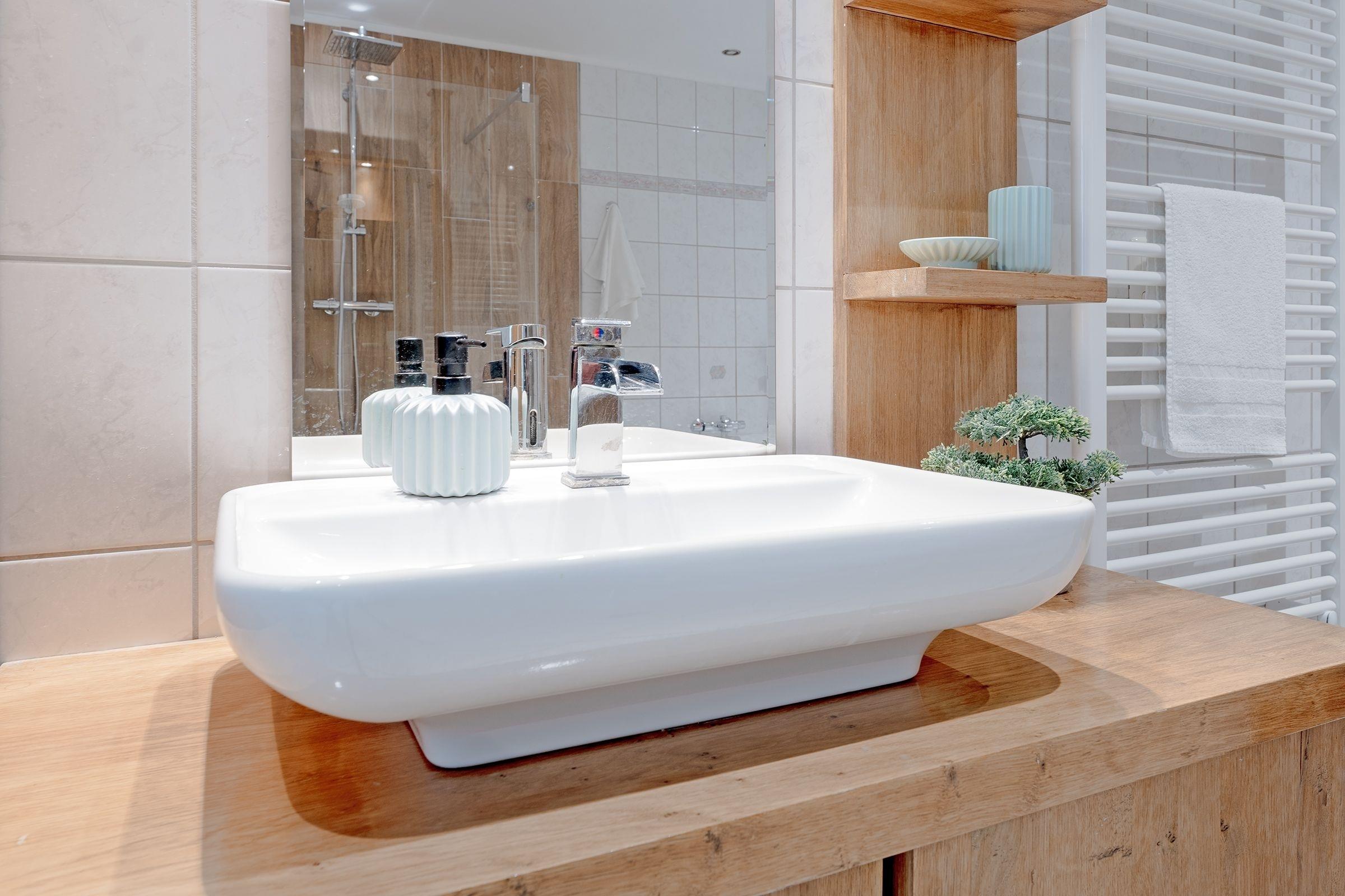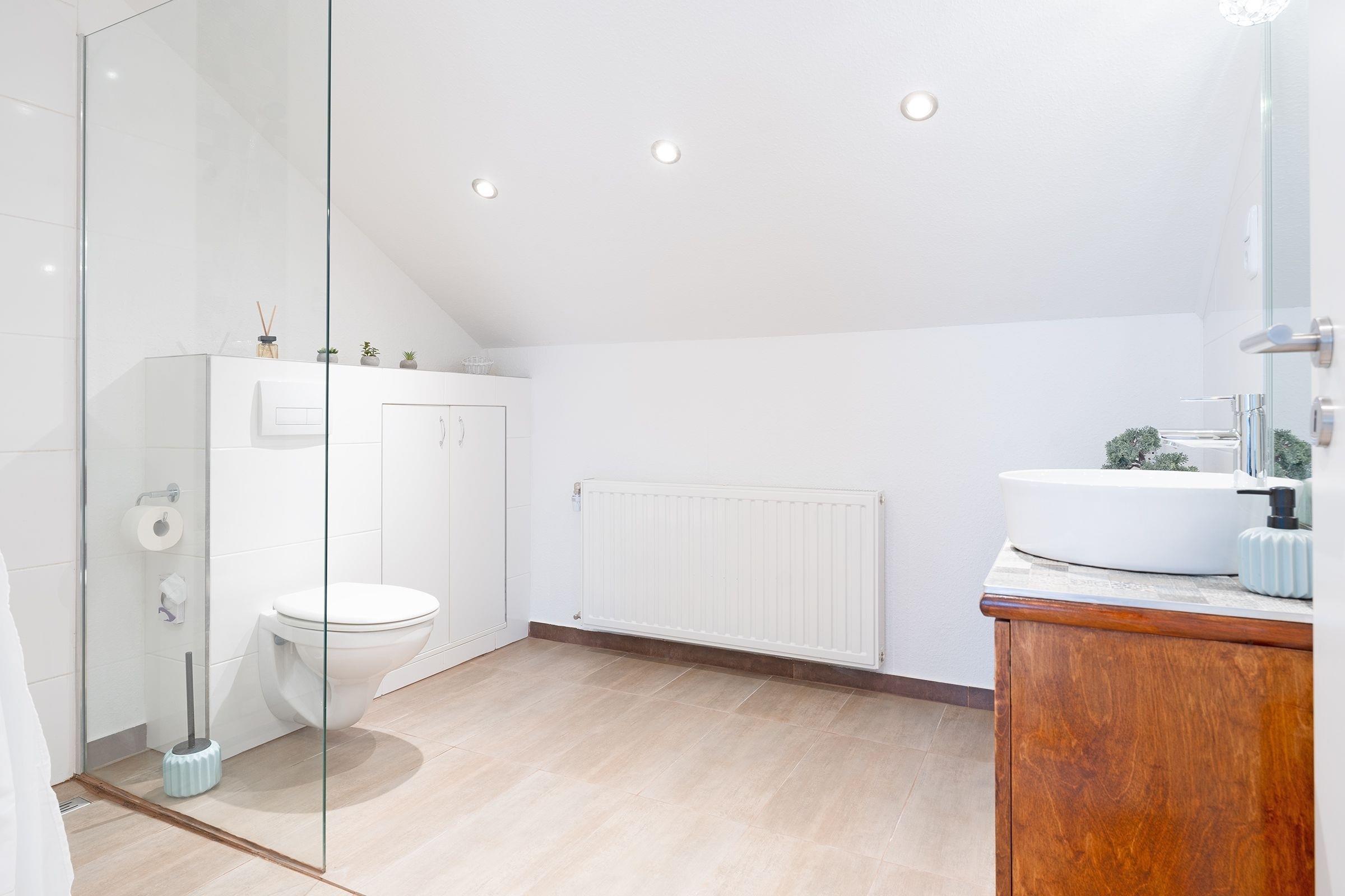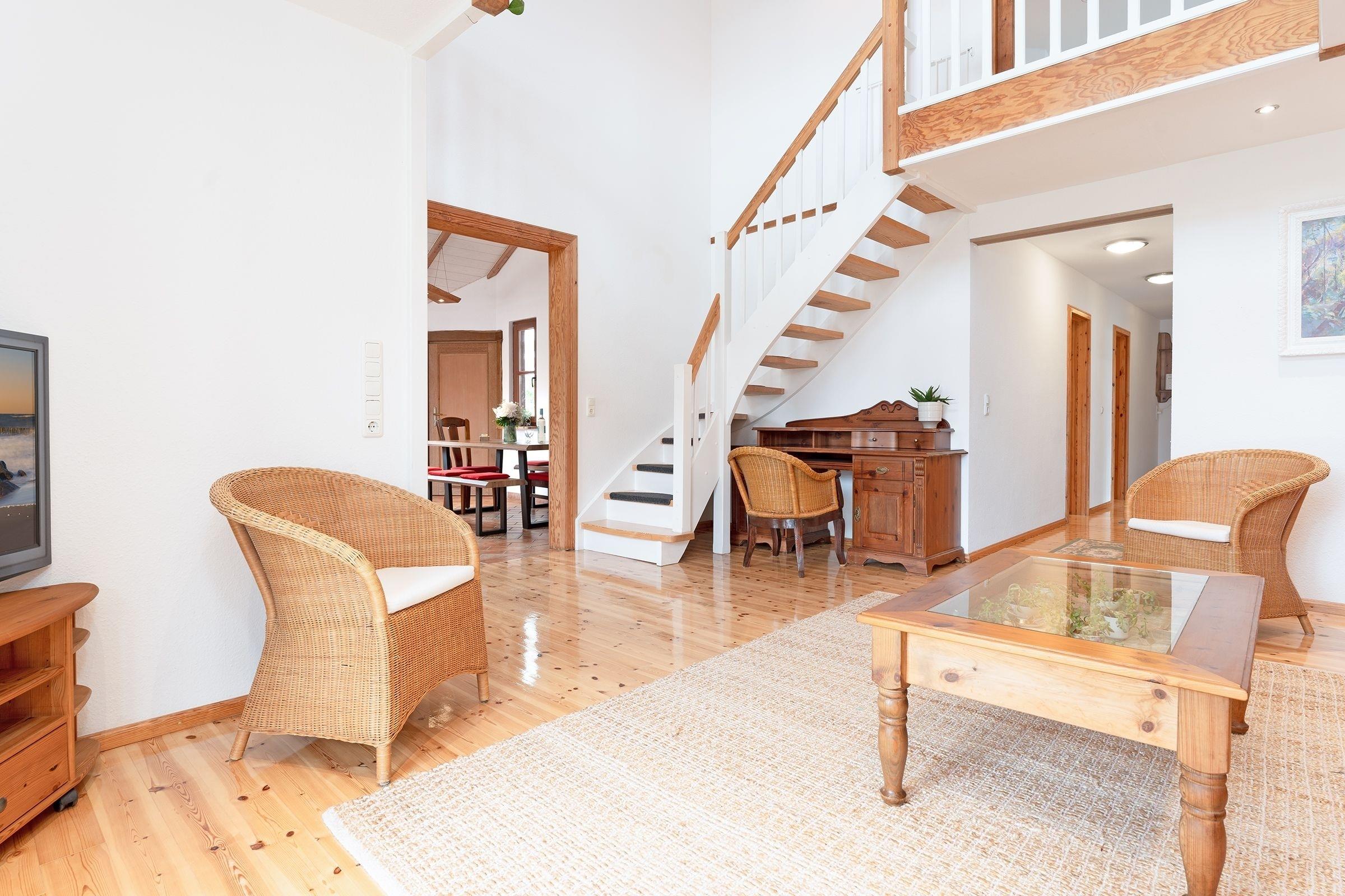 Im Erdgeschoss befindet sich ein Essplatz im großzügigen Entree, der in den offenen Küchenbereich übergeht. Das angrenzende Wohnzimmer lädt zu gemütlichen Stunden ein und bildet mit einem weiteren Zugang nach draußen das Zentrum des Hauses. Freuen Sie sich auf zahlreiche Sonnenstunden im Garten und gemütlichen Grillabenden auf der Terrasse. Drei Schlafzimmer befinden sich ebenfalls im Erdgeschoss und sind mit einem Doppelbett (2x 90x200 cm) bzw. mit jeweils 2 Einzelbetten (je 90x200 cm) ausgestattet. Das Badezimmer im Erdgeschoss erreichen Sie vom Flur und einem der Schlafzimmer. Es ist geräumig und mit einer Eckbadewanne, sowie einer großen Dusche und WC ausgestattet.