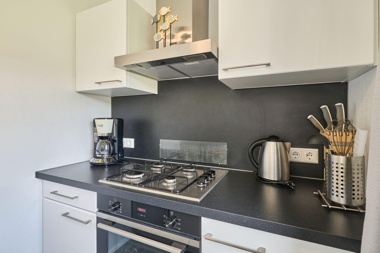 Das Wohnzimmer präsentiert sich mit einem großzügigen Sofa sowie einem Esstisch und geht direkt in die offene, voll ausgestattete Küche über. Hier stehen Ihnen ein Gasherd, Backofen, Kühlschrank mit Gefrierfach, Spülmaschine, Kaffeemaschine, Wasserkocher, Toaster sowie sämtliche erforderlichen Küchenutensilien, Geschirr und Besteck zur Verfügung. Für den täglichen Komfort sind zudem Staubsauger, Abfalleimer, Geschirrhandtücher, Bettwäsche und Handtücher im Haus vorhanden.