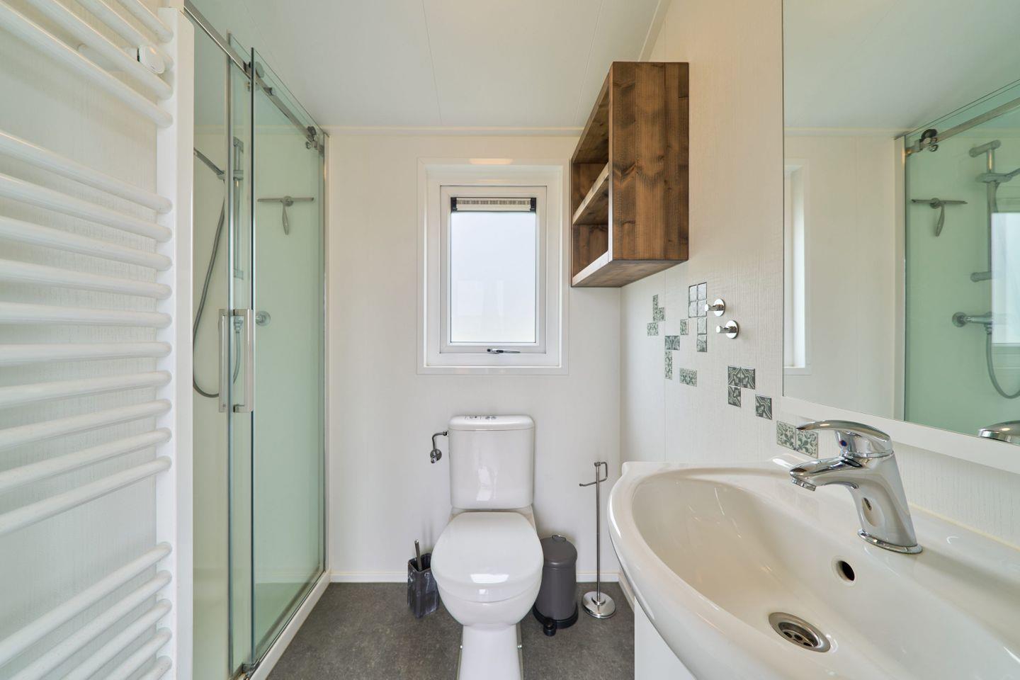 Das Badezimmer verfügt über eine Dusche, WC, Waschbecken und Spiegel – alles, was Sie für einen angenehmen Start in den Tag benötigen. Die gemeinschaftliche Nutzung von Waschmaschine und Trockner in der Ferienanlage bietet zusätzliche Flexibilität für längere Aufenthalte.