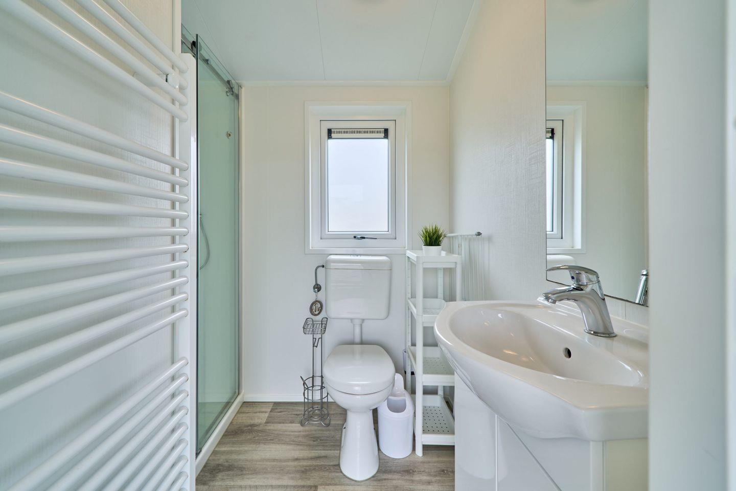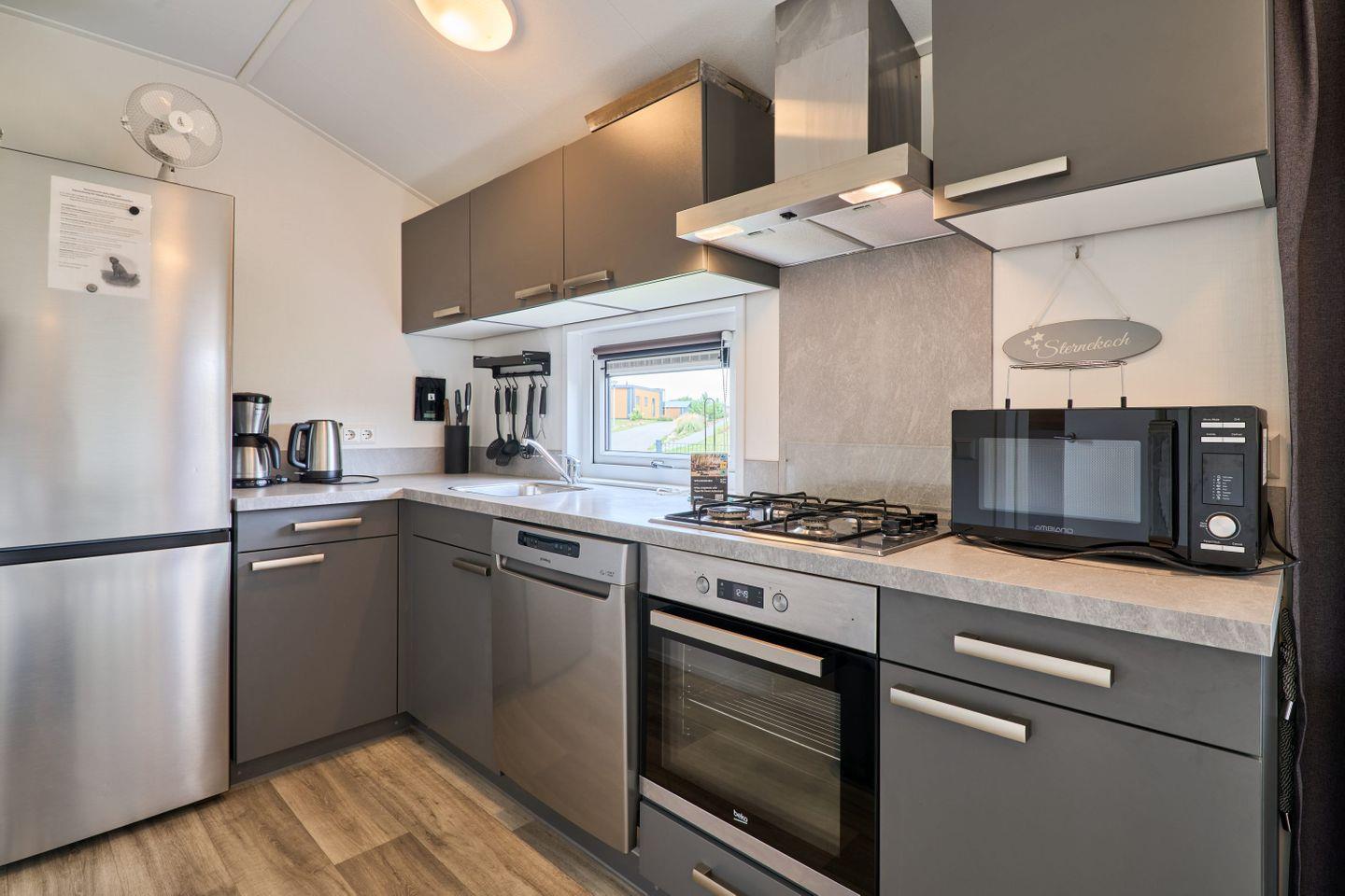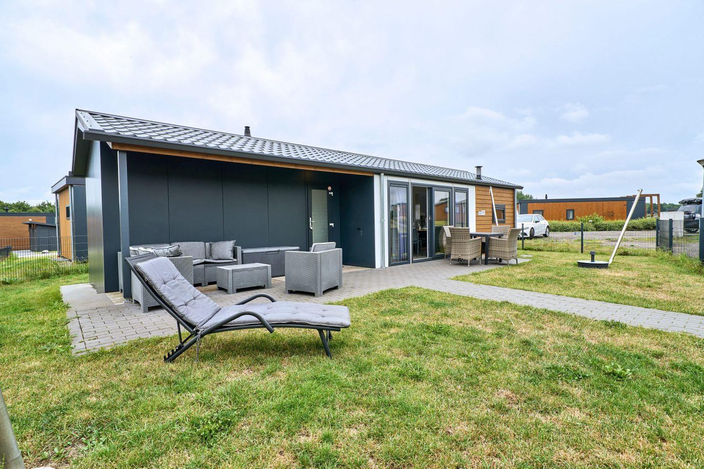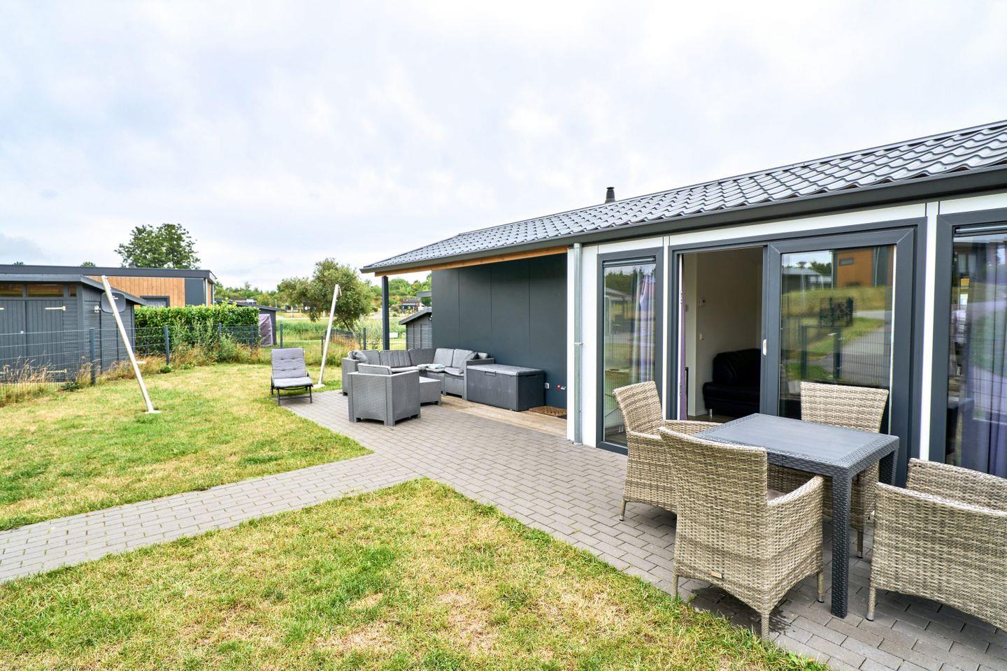 Zur weiteren Austattung des Ferienhauses gehören Gartenmöbel auf der eigenen Terrasse, die zum Verweilen im Freien einlädt. Für Fahrzeuge steht ein kostenfreier Parkplatz bereit, außerdem befindet sich auf dem Gelände eine Ladestation für Elektroautos. Waschmaschine und Trockner stehen zur gemeinschaftlichen Nutzung innerhalb der Ferienanlage zur Verfügung.