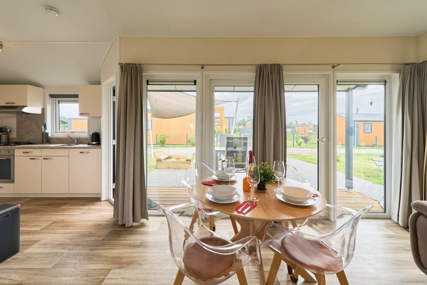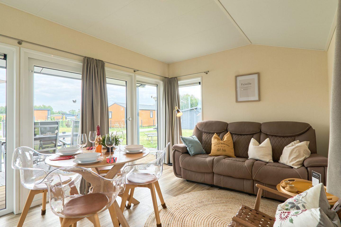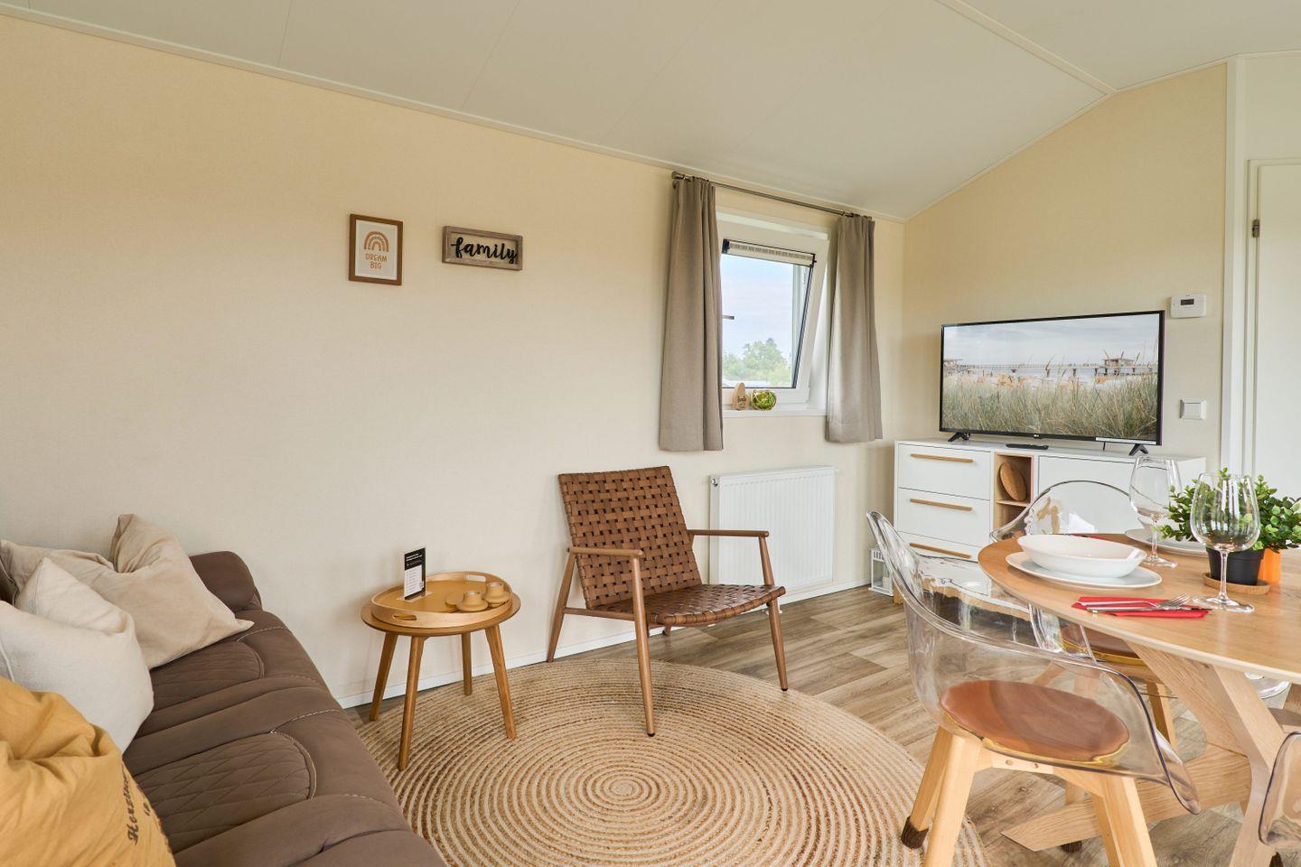 Das rund 40 Quadratmeter große Ferienhaus zeichnet sich durch seine moderne und praktische Ausstattung aus. Im offen zum Wohnzimmer gestalteten Küchenbereich finden Sie neben Kühlschrank mit Gefrierfach, Backofen, Herd, Geschirrspüler auch Kaffeemaschine, Toaster, Wasserkocher sowie umfangreiche Küchenutensilien, Geschirr und Besteck. Ein Esstisch steht für gemeinsame Mahlzeiten bereit. Das gemütliche Wohnzimmer ist mit einem Sofa und einem Fernseher ausgestattet.