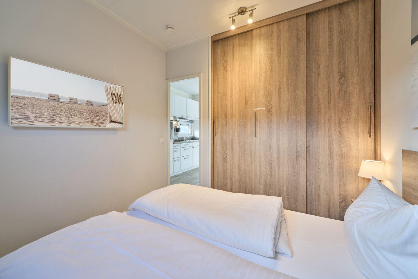 Das freistehende Ferienhaus befindet sich im Parterre, sodass ein ebenerdiger Zugang gewährleistet ist. Es verfügt über insgesamt drei Zimmer, darunter zwei separate Schlafzimmer mit Laminatboden, die insgesamt vier Schlafplätze bieten. Damit eignet sich die Unterkunft besonders für Familien, aber auch für Paare oder kleine Reisegruppen. Kinder und Babys sind willkommen, und das Haus sowie die gesamte Anlage sind familienfreundlich konzipiert. Für Sicherheit und Komfort sorgt ein Rauchmelder in der Unterkunft, und alle Fenster verfügen über einen Sichtschutz.
