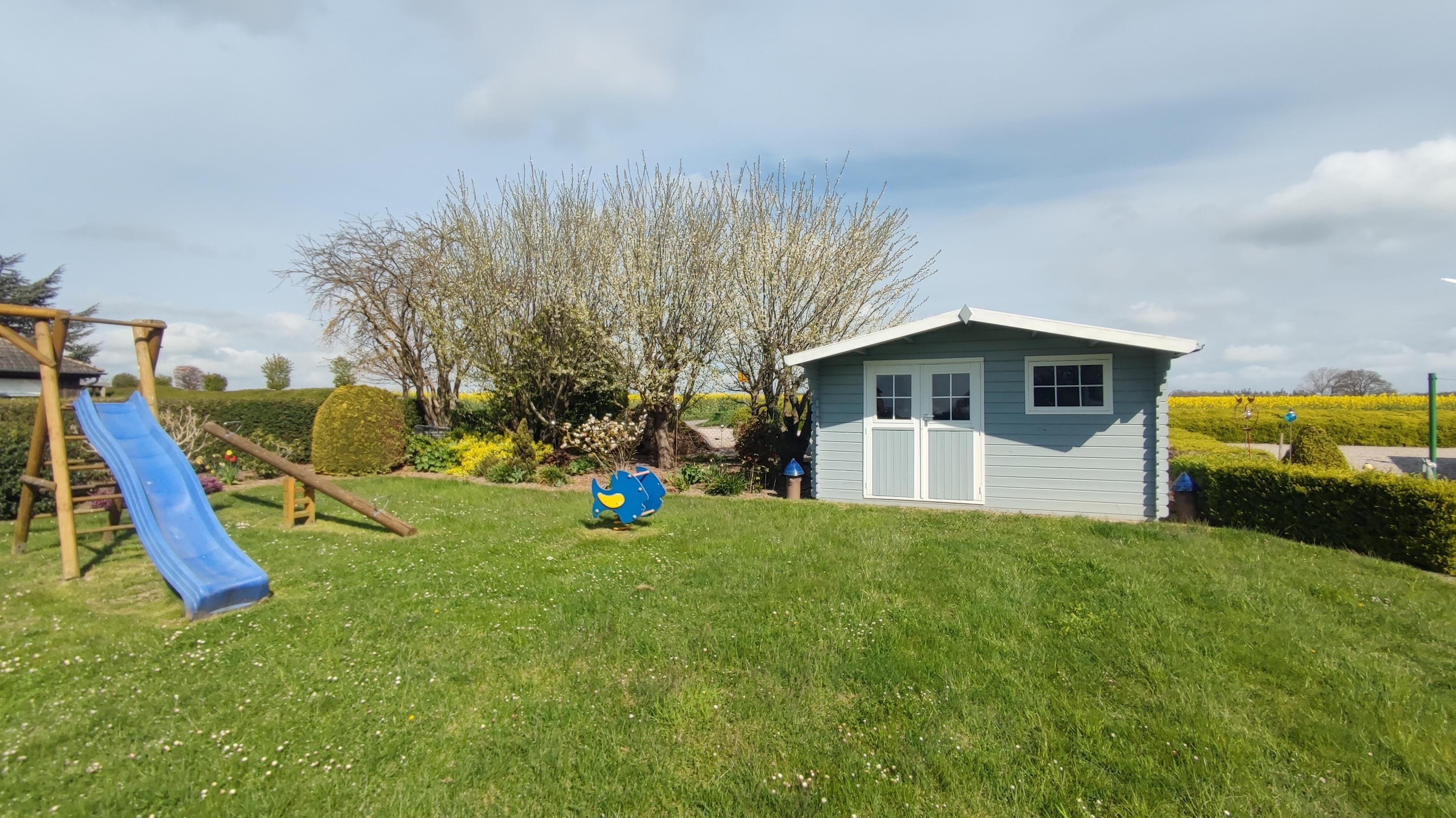 Die eigene und geschützte Terrasse befindet sich direkt an der Wohnung. Hier können Sie die Sonne bei einem Gläschen Wein bis zum Sonnenuntergang genießen. Aber auch zu allen anderen Gelegenheiten lässt man sich hier gern nieder. So hat man seine lieben Kleinen auch immer gut im Blick. Denn direkt vor der Haustür befindet sich die riesige Rasenfläche, umgeben von schönen Anpflanzungen, mit verschiedenen Spielgeräten. Ein Gartenhaus mit Gartenmöbeln, Sitzauflagen, Liegen, Sonnenschirm und einem Grill steht Ihnen auch zur Verfügung.