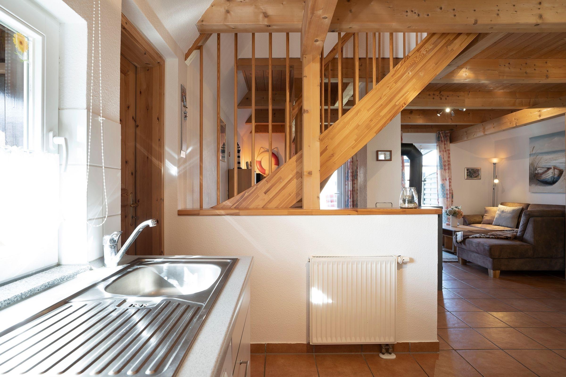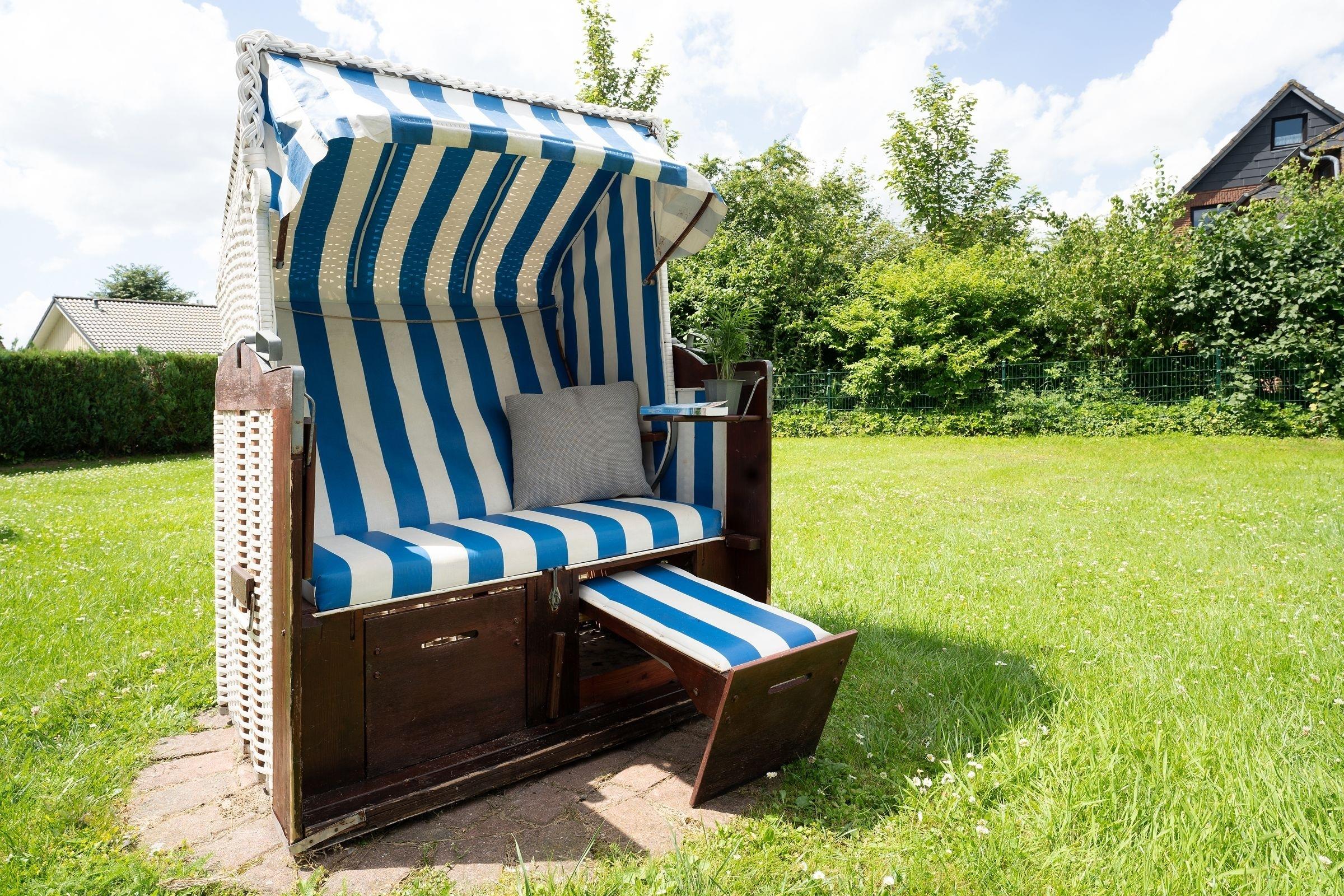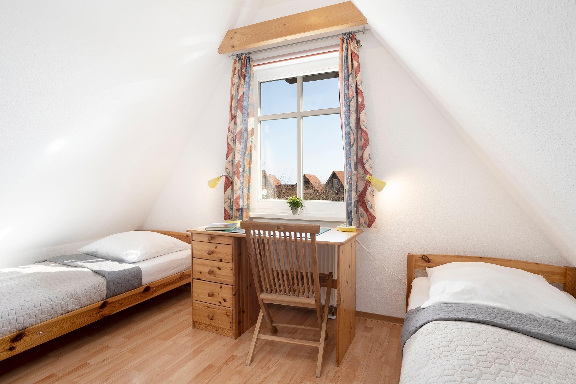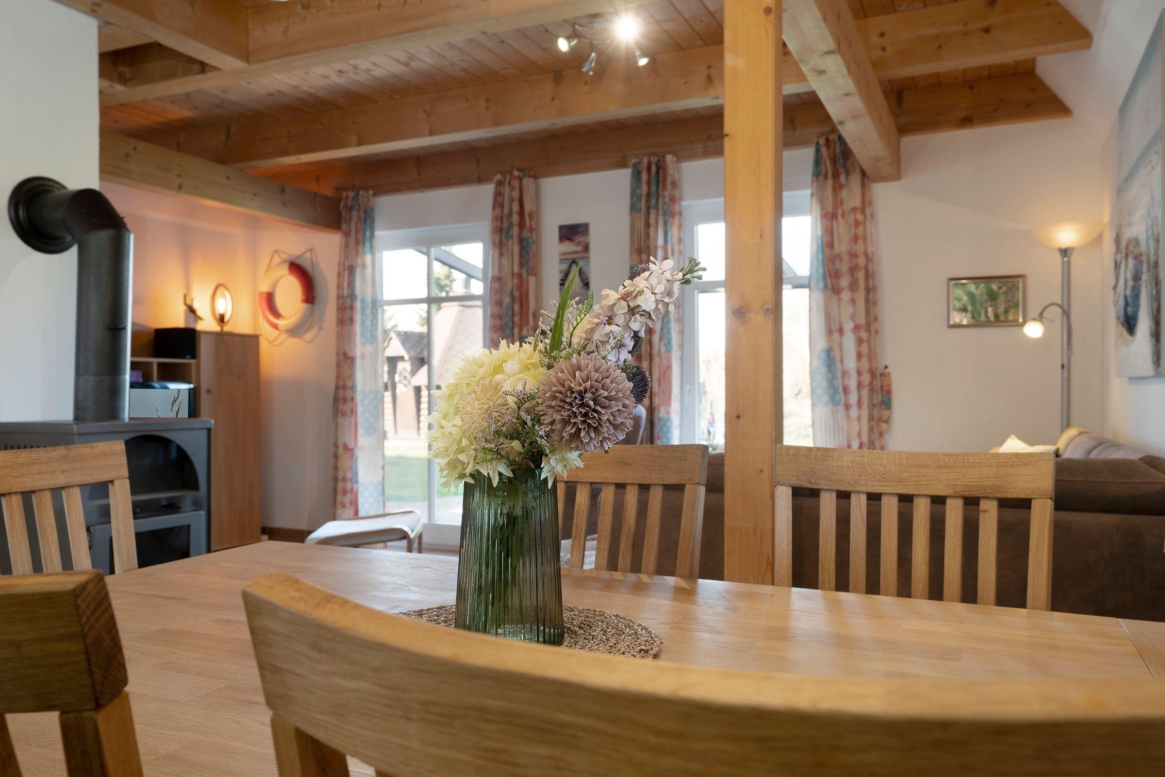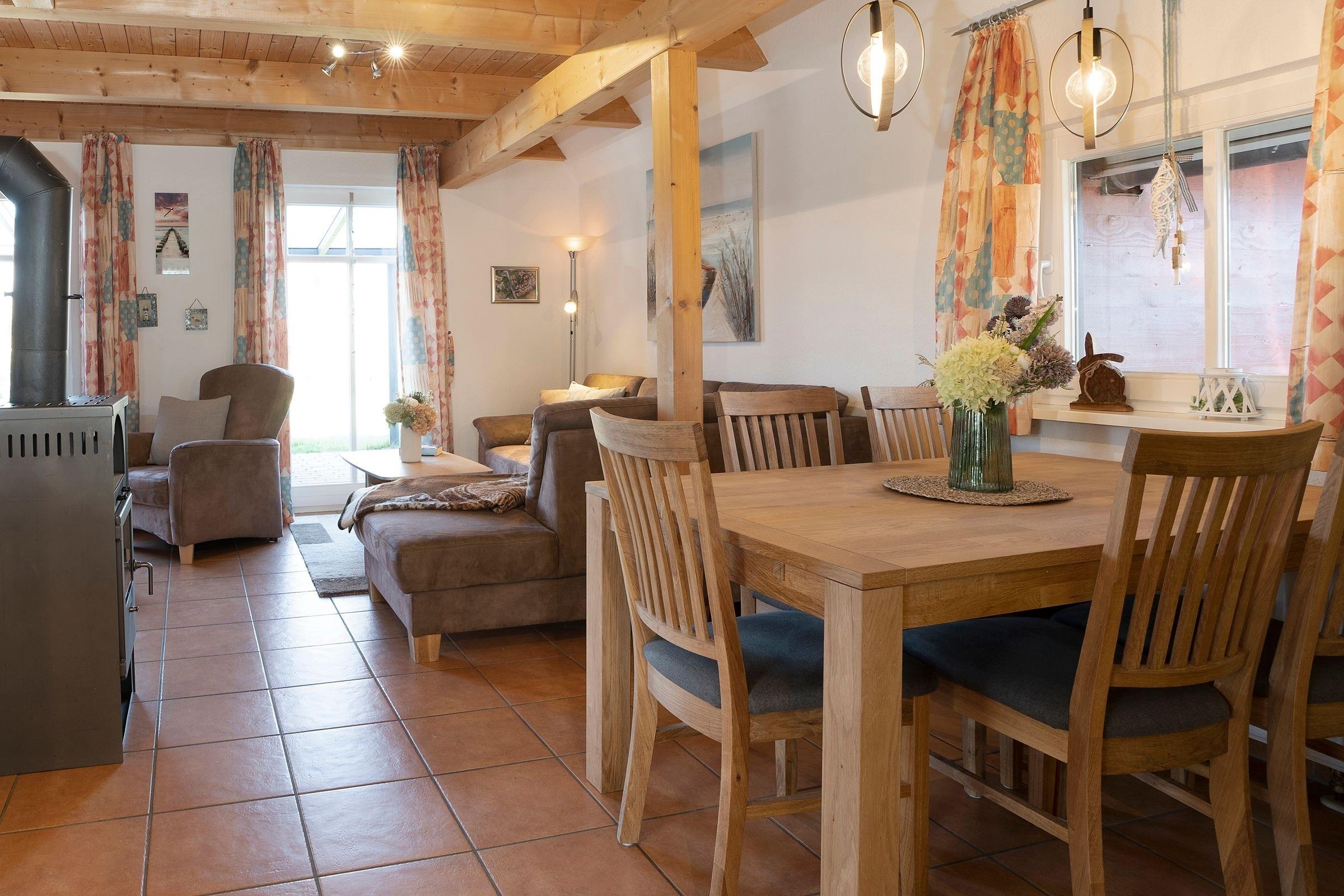 Im Erdgeschoss befindet sich der offene, großzügig geschnittene Wohn- und Essbereich mit direktem Zugang auf die möblierte Terrasse. Der Wohnbereich ist mit einem bequemen Ecksofa und einem Sessel ausgestattet. Der Esstisch befindet sich direkt am Fenster und bietet ausreichend Platz für 6 Personen. Ein Highlight ist der gusseiserne Kaminofen, der für eine behagliche Atmosphäre sorgt. Für Unterhaltung im Urlaub sorgen der Blu-Ray-Player, der CD/DVD-Player und der Flachbildfernseher. Die Küche ist z. B. mit einem Backofen, einem Kühlschrank sowie einem Geschirrspüler gut ausgestattet. Beide Schlafzimmer, eines davon mit einem Doppelbett (2x 90x200 cm), das andere mit 2 Einzelbetten (je 90x200 cm), befinden sich in der 1. Etage. Die Schlafzimmer lassen sich mit Rollos und Gardinen verdunkeln. Neben vielen Extras stehen Ihnen auch eine Waschmaschine im Haus sowie ein Strandkorb im Garten zur Verfügung. Der WLAN-Anschluss ist selbstverständlich inklusive.