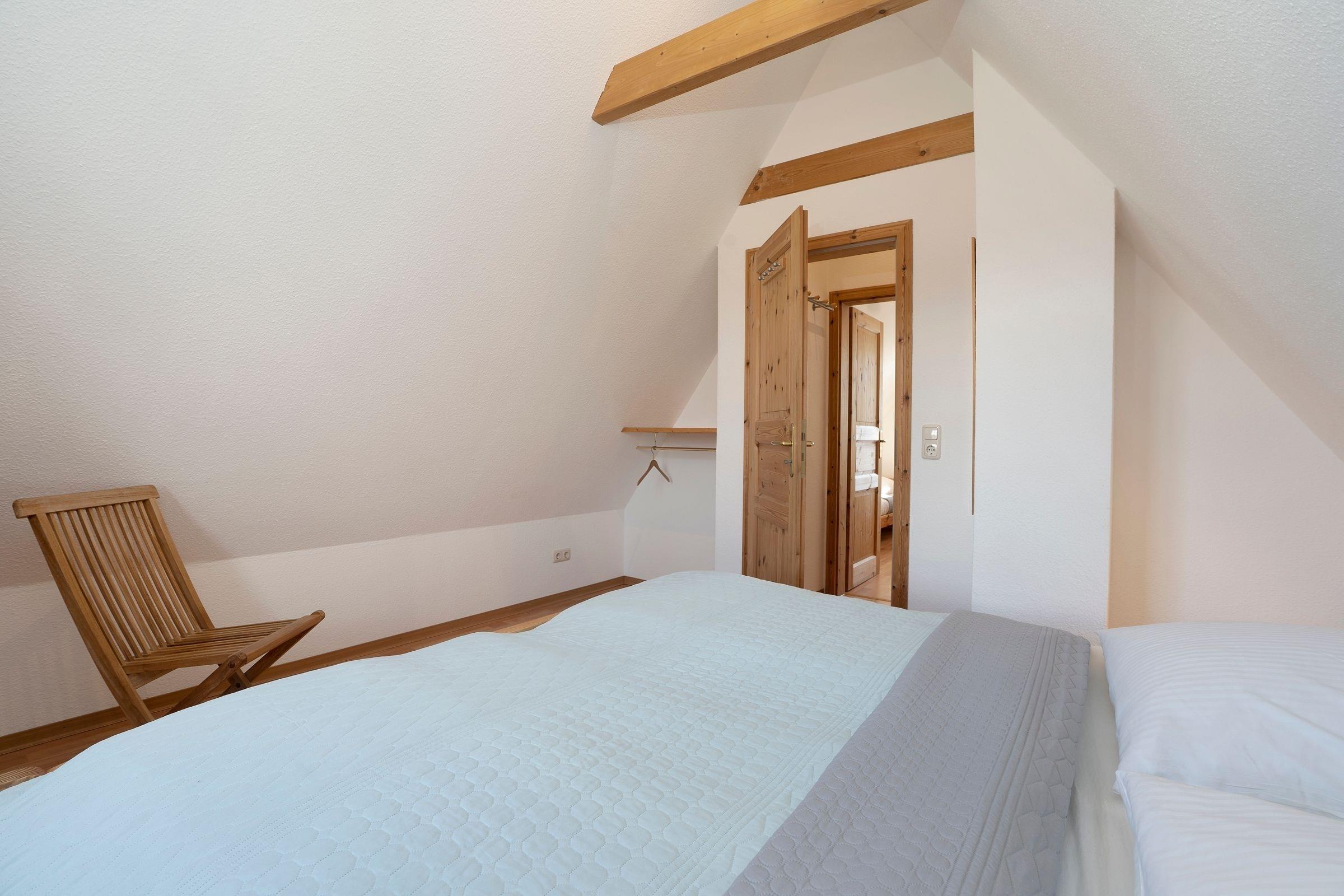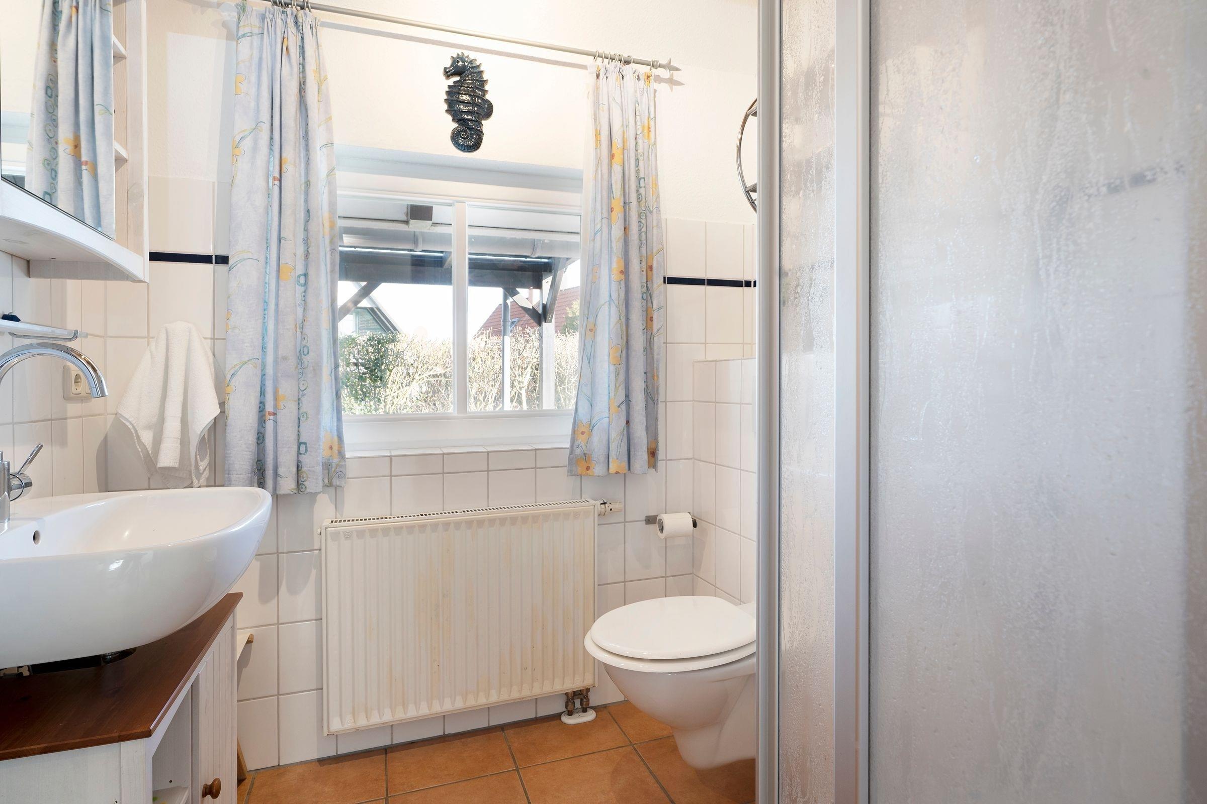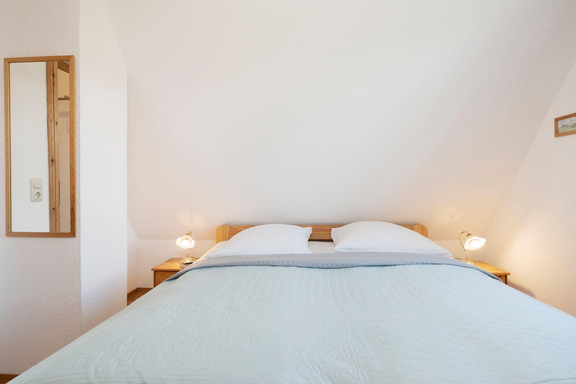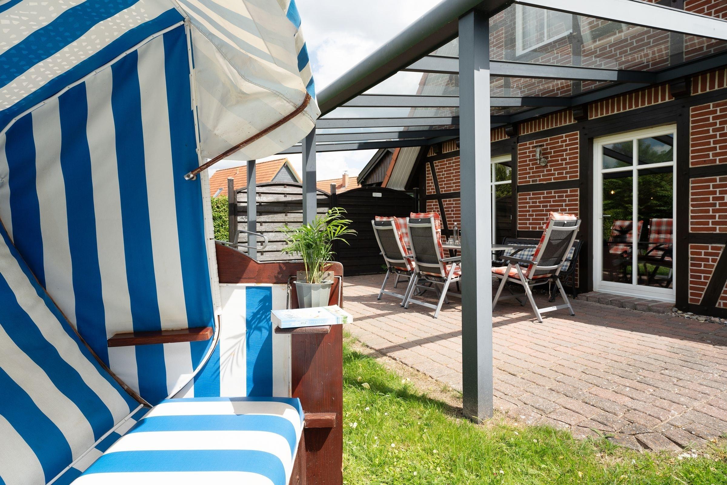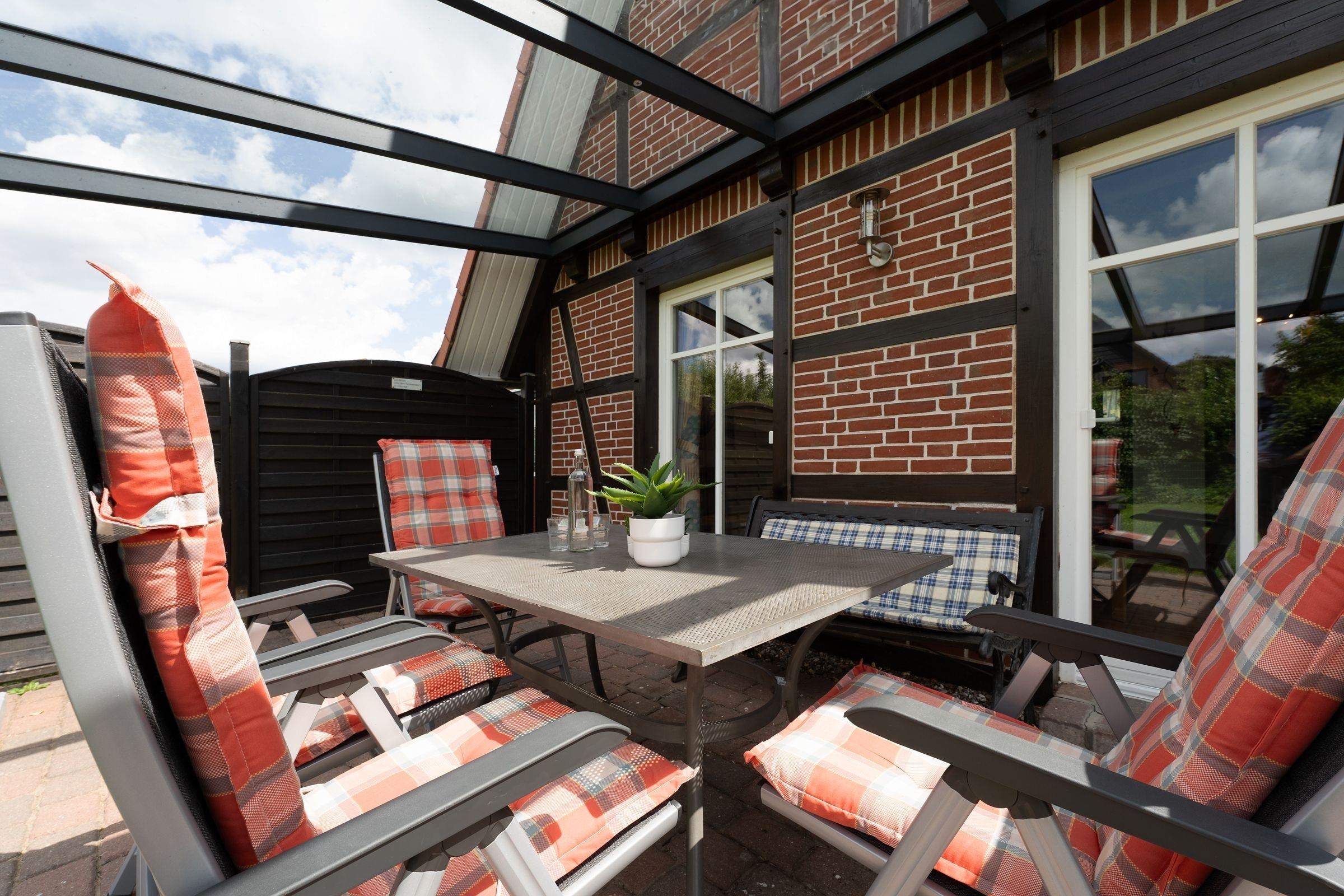Im Erdgeschoss befindet sich der offene, großzügig geschnittene Wohn- und Essbereich mit direktem Zugang auf die möblierte Terrasse. Der Wohnbereich ist mit einem bequemen Ecksofa und einem Sessel ausgestattet. Der Esstisch befindet sich direkt am Fenster und bietet ausreichend Platz für 6 Personen. Ein Highlight ist der gusseiserne Kaminofen, der für eine behagliche Atmosphäre sorgt. Für Unterhaltung im Urlaub sorgen der Blu-Ray-Player, der CD/DVD-Player und der Flachbildfernseher. Die Küche ist z. B. mit einem Backofen, einem Kühlschrank sowie einem Geschirrspüler gut ausgestattet. Beide Schlafzimmer, eines davon mit einem Doppelbett (2x 90x200 cm), das andere mit 2 Einzelbetten (je 90x200 cm), befinden sich in der 1. Etage. Die Schlafzimmer lassen sich mit Rollos und Gardinen verdunkeln. Neben vielen Extras stehen Ihnen auch eine Waschmaschine im Haus sowie ein Strandkorb im Garten zur Verfügung. Der WLAN-Anschluss ist selbstverständlich inklusive.