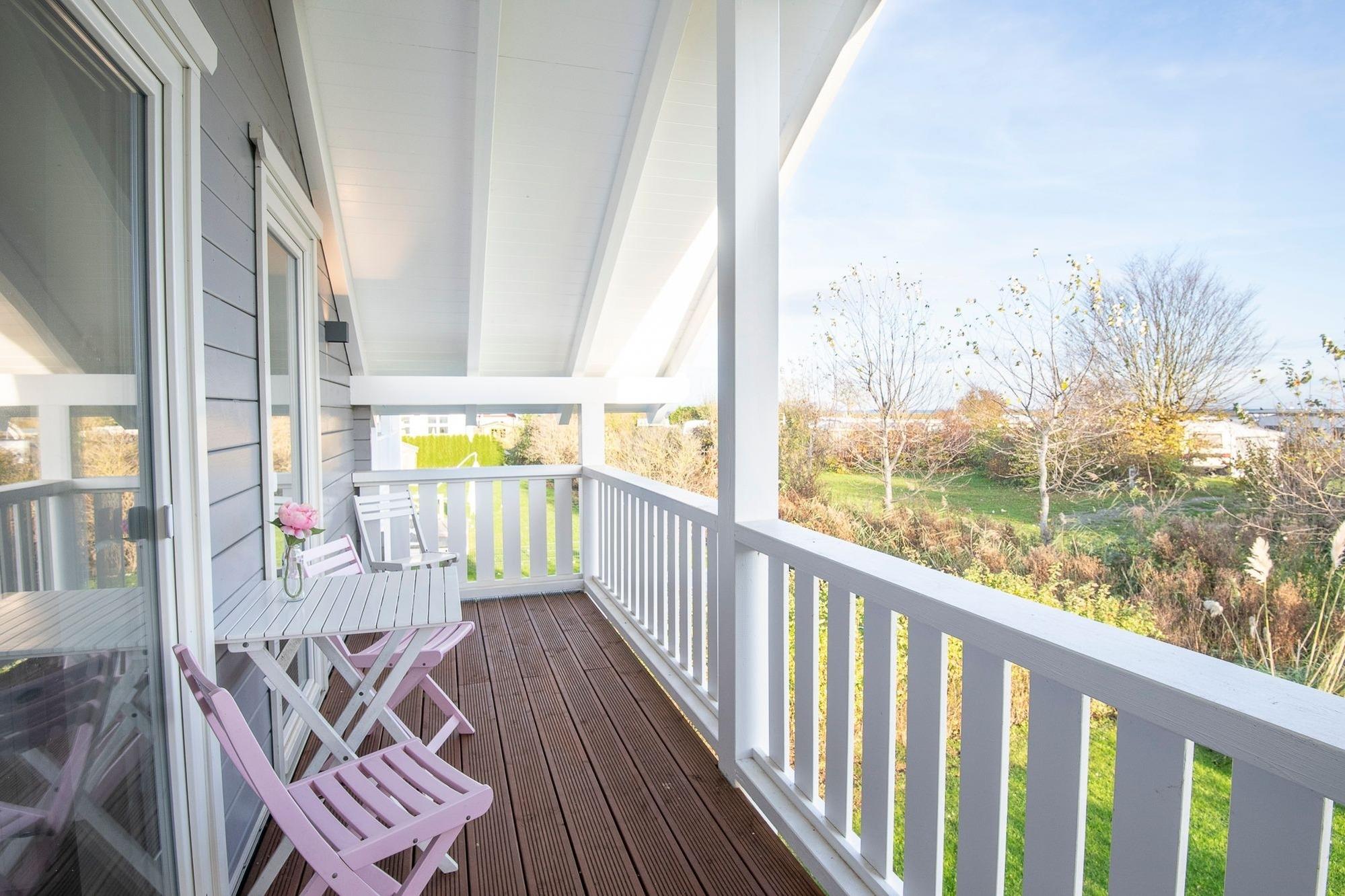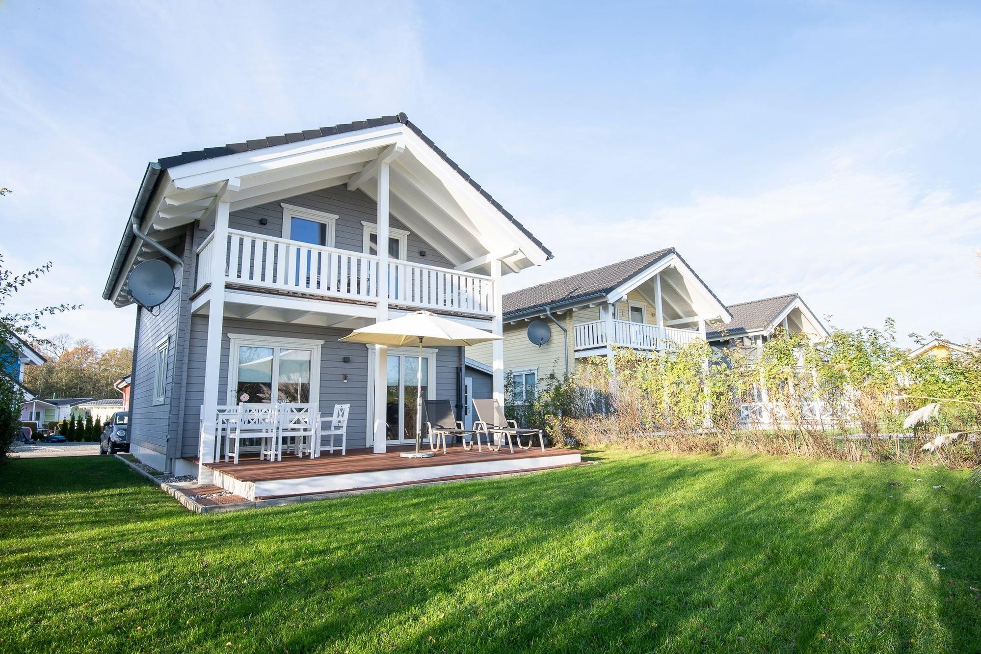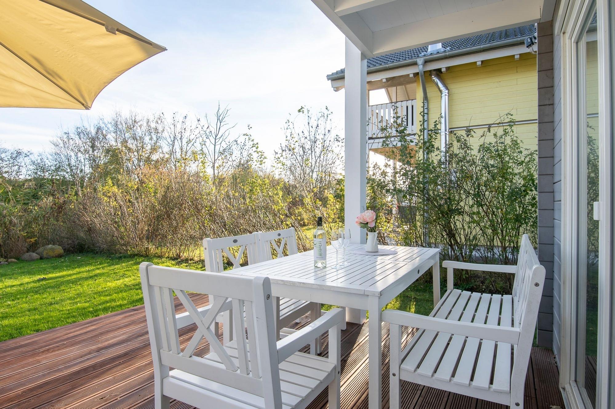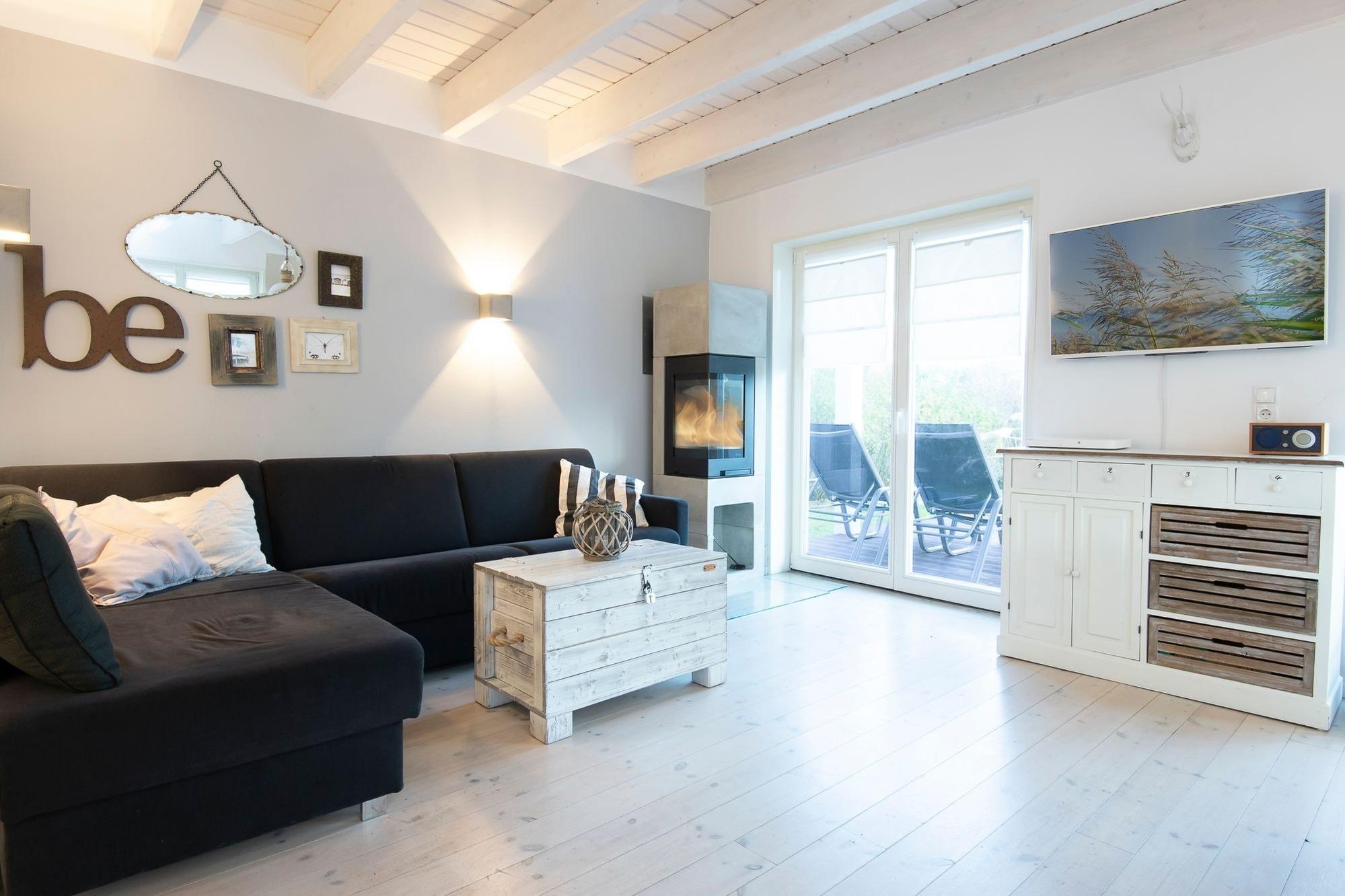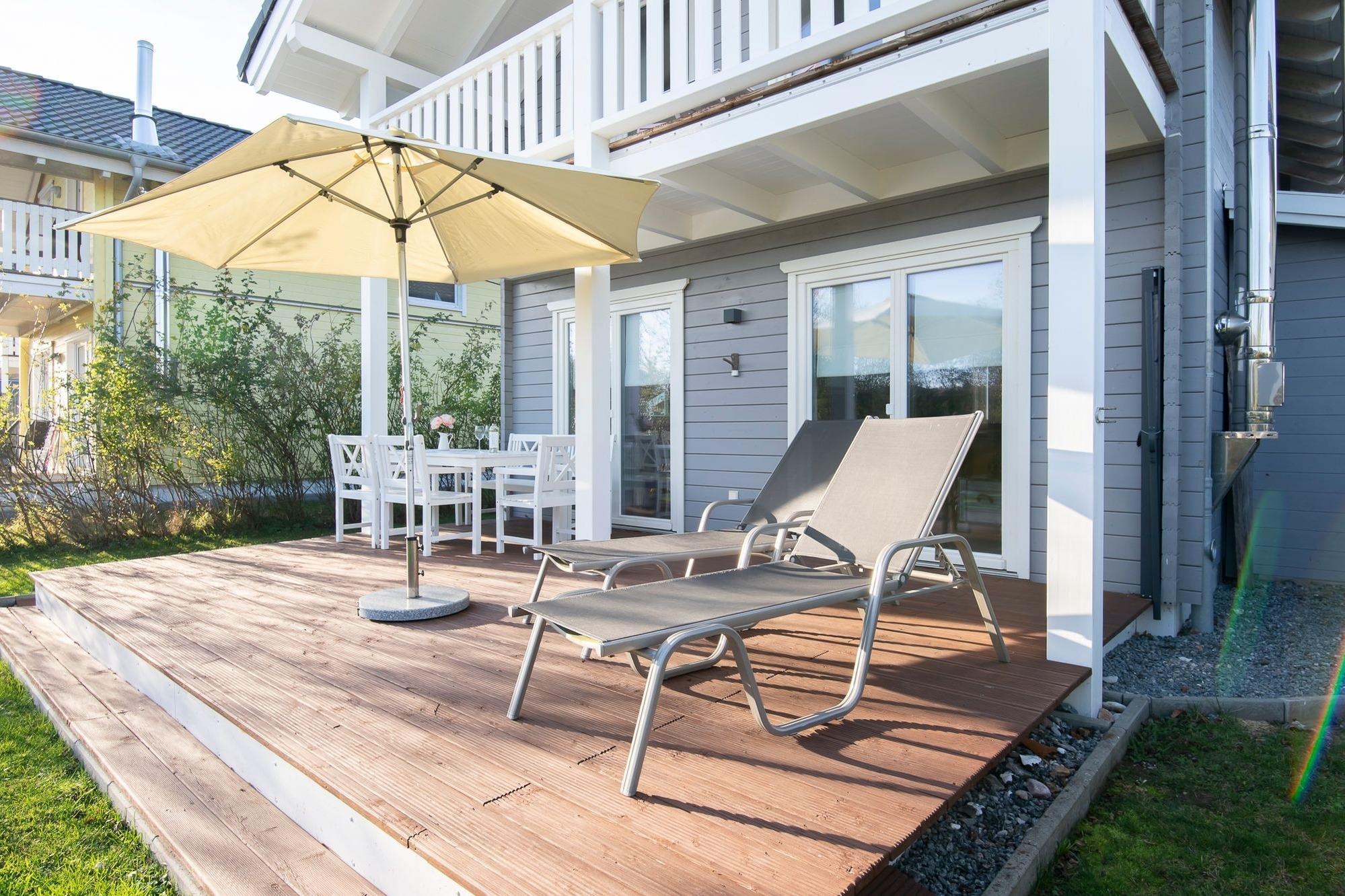 Kuscheln Sie sich nach langen Strandspaziergängen auf die gemütliche Sofaecke mit TV und DVD-Player. An kalten Tagen können Sie sich den Kamin anmachen, der für wohlige Wärme sorgt. Über einen kostenlosen WLAN-Anschluss bleiben Sie mit Ihren Lieben daheim in Verbindung. Kochen Sie in der voll ausgestatteten, hochwertigen Küche und versammeln Sie sich zum Essen mit der ganzen Familie am großzügigen, angrenzenden Esstisch. Durch die großen Terrassentüren gelangen Sie auf die teilüberdachte möblierte Terrasse. Auf den Sonnenliegen können Sie in Ihrer Reiselektüre schmökern, ein Sonnenschirm sorgt bei Bedarf für Schatten. Mit dem vorhanden Grill können Sie für Abwechslung auf Ihrem Speiseplan sorgen. Kleine Urlaubsgäste können im eigenen Garten toben und spielen oder auch den Spielplatz im Wohnpark nutzen. Zum Schlafen und Träumen können Sie sich dann in eines der drei Schlafzimmer zurückziehen. In Schlafzimmer 1 können Sie in einem komfortablen Doppelbett (2x 90x200 cm) entspannen. Dieser Raum verfügt außerdem über einen Kleiderschrank und einen eigenen Flat-TV. Ein weiteres Doppelbett (2x 90x200 cm) bereitet Ihnen in Schlafzimmer 2 erholsame Nächte. Für Ihre Urlaubgarderobe steht ein Kleiderschrank bereit. Im dritten Schlafzimmer, ebenfalls mit Kleiderschrank, können Sie in 2 Einzelbetten neue Energie tanken.