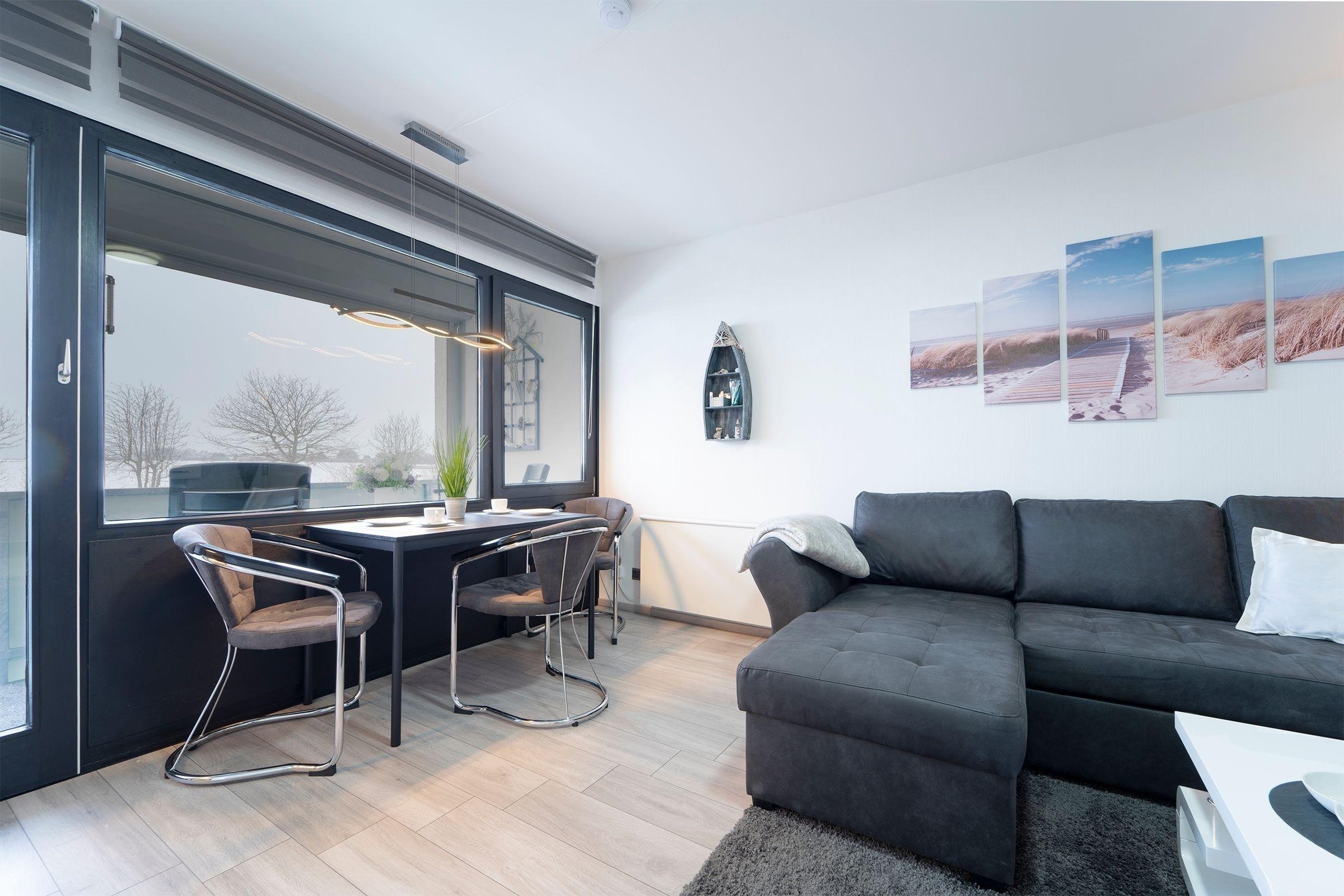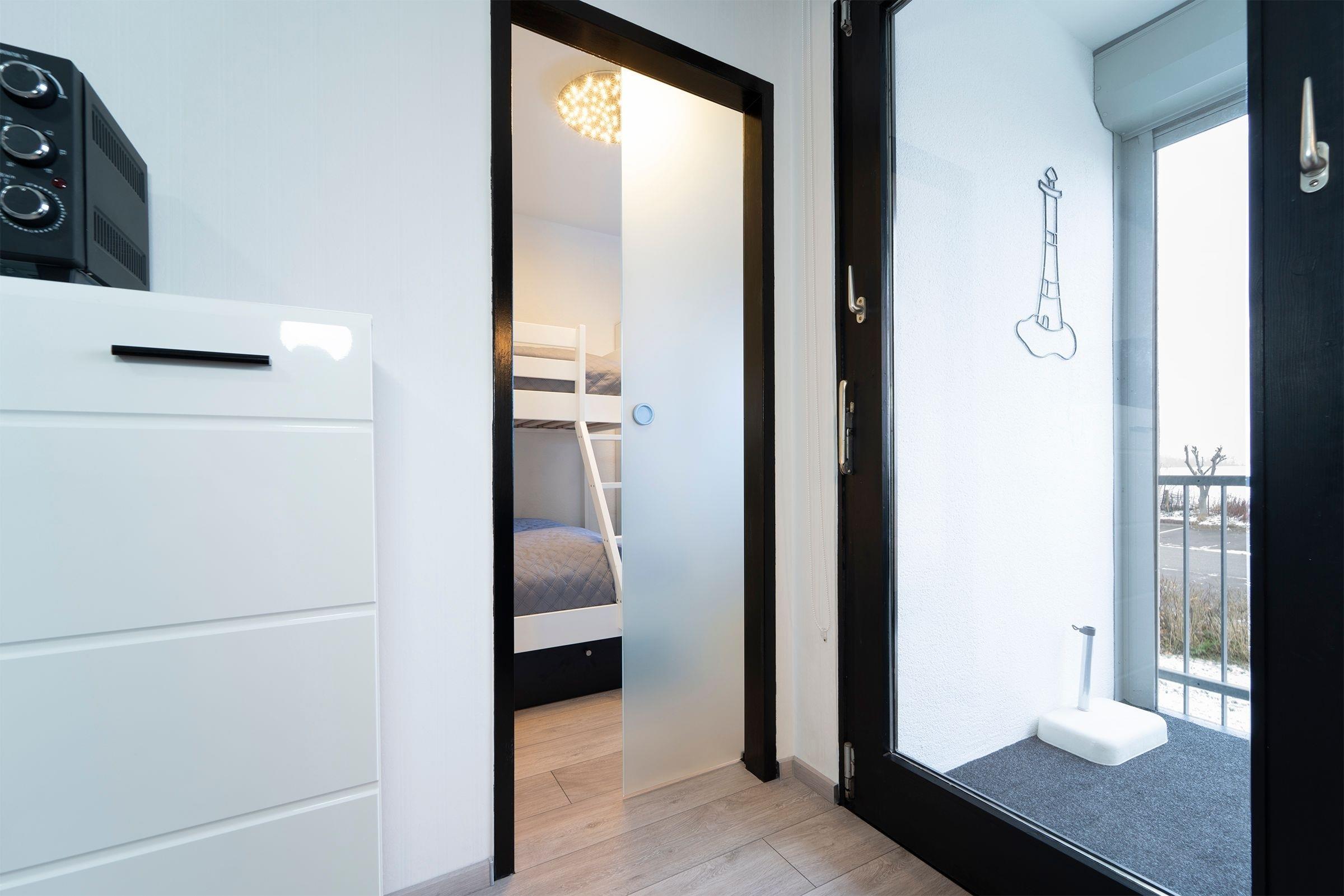 Das Zentrum dieser Wohnung bildet das offen gestaltete Wohnzimmer mit Schlafcouch (140x200 cm), Essbereich und Zugang zum überdachten Balkon mit Westausrichtung. Die praktische Küchenzeile bietet Ihnen alles, was Sie im Urlaub benötigen. Im nebenliegenden Schlafzimmer finden zwei weitere Gäste im Etagenbett (90x200 cm / 140x200 cm) ihre Nachtruhe. Im innenliegenden Vollbad bleiben mit Dusche, Haartrockner und Stauraum keine Wünsche offen.