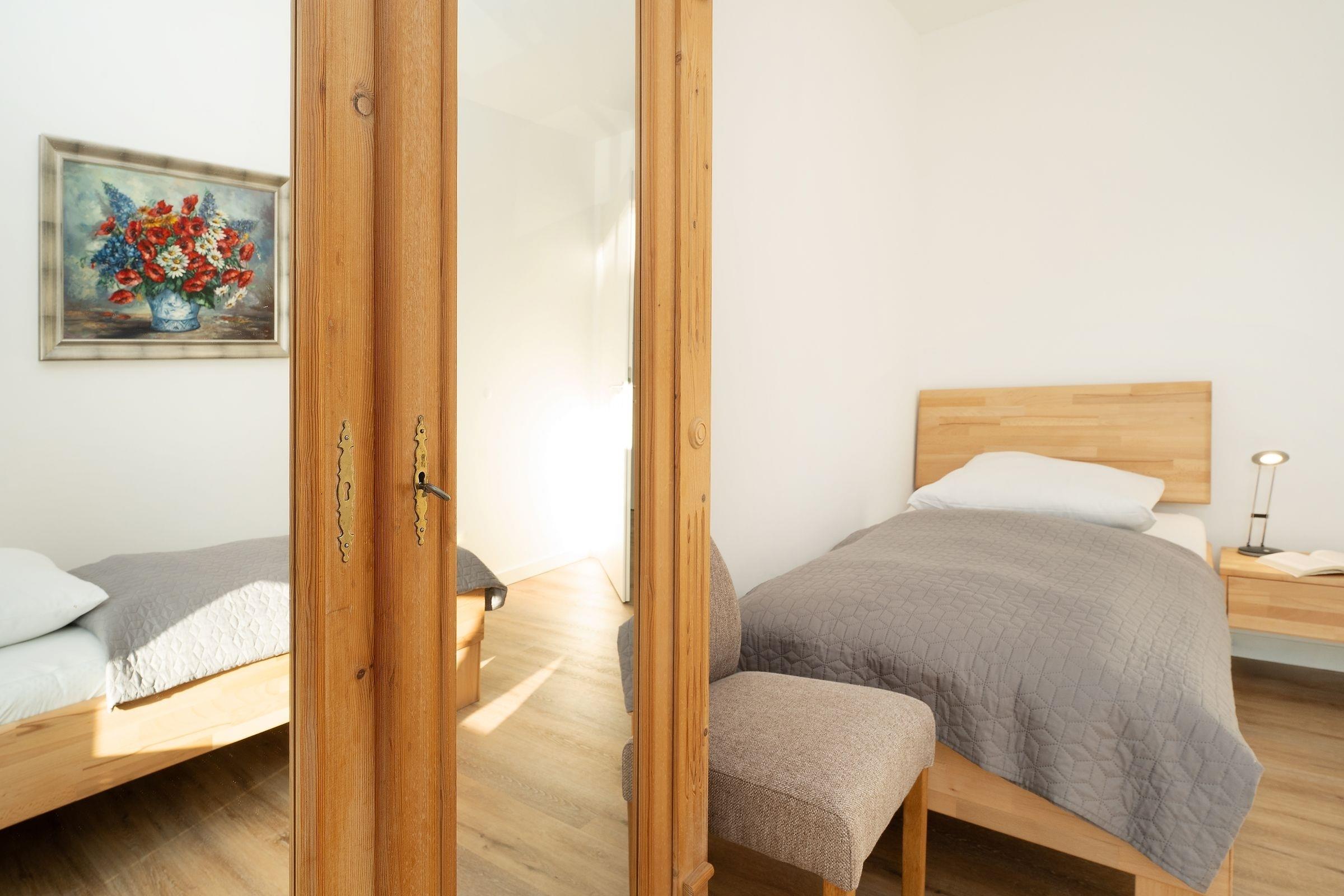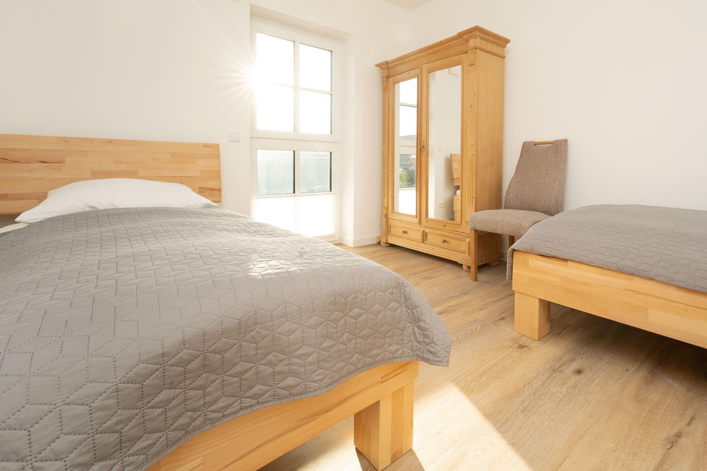 Schlafzimmer 2: 2 Einzelbetten (je 100x200 cm), Kleiderschrank, Verdunkelung: Außenrollladen, Platz für ein Babybett vorhanden