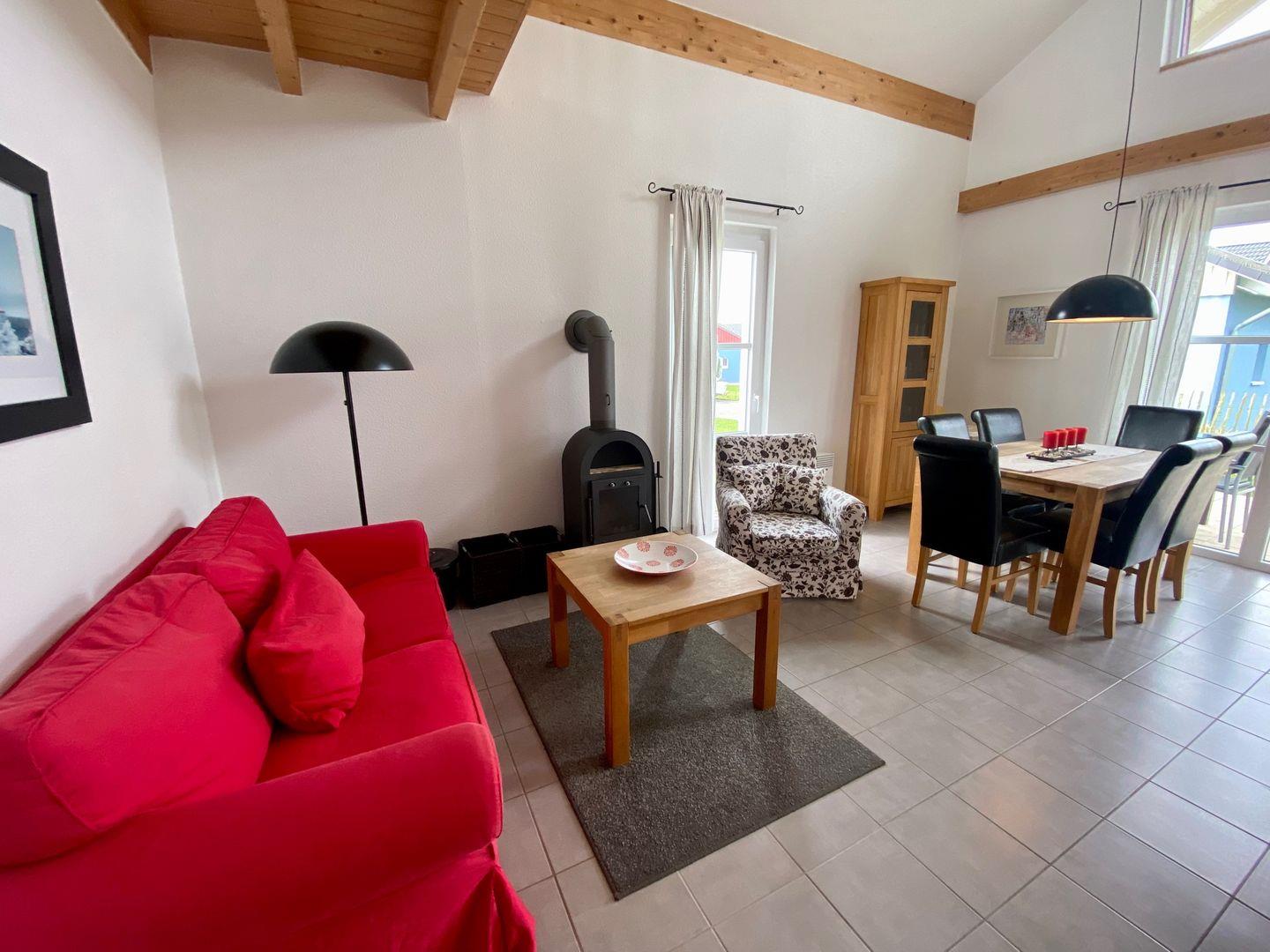 Neben einer komplett ausgestatteten Küche und einem gemütlichen Wohn- / Essbereich mit Kamin bietet das Haus 3 Schlafzimmer und 2 Badezimmer sowie eine Galerie mit weiteren Sitzgelegenheiten und zweitem TV-Gerät. Es gibt 6 Betten für Erwachsene, 4 befinden sich im EG, 2 weitere im OG. Im Haus verstaut befindet sich noch ein Hochstuhl und ein Zusatzbett mit Matratze für ein Kleinkind. Durch große bodentiefe Fenster wirkt das Haus besonders hell und freundlich. Alle Schlafräume können jedoch extra abgedunkelt werden, mit dem Ziel größtmöglicher Erholung.