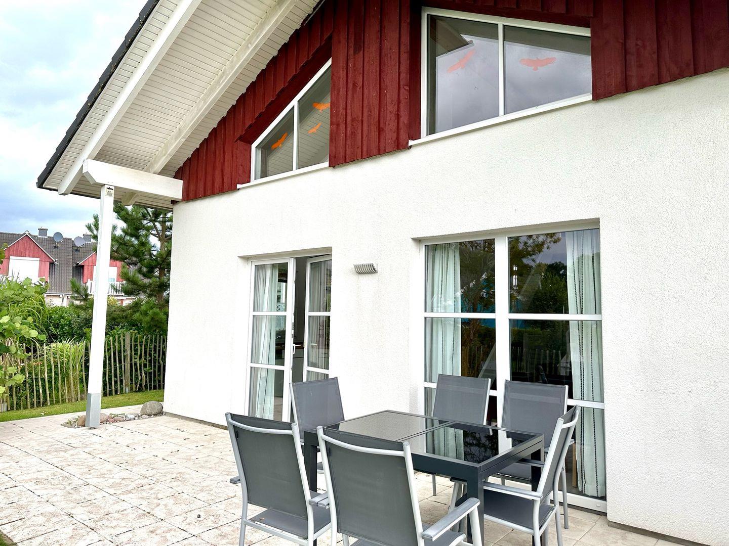 Das Haus verfügt zudem über eine große Terrasse mit Gartenmöbeln und mobilem Grill. Auch hier können Sie entspannen und gemeinsame Grillabende genießen.