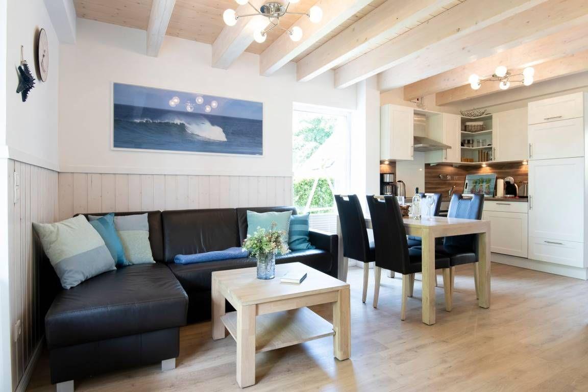 Im hellen, liebevoll eingerichteten Wohnzimmer erwartet Sie ein knisternder Kaminofen – ideal für gemütliche Abende, wenn draußen die Wellen rauschen. Die moderne Sofaecke und das Schlafsofa (140x200) bieten nicht nur Komfort, sondern schaffen einen Ort, an dem man sich sofort wohlfühlt. Ein Smart-TV, Radio und CD-Spieler runden das Entertainment-Angebot stilvoll ab.