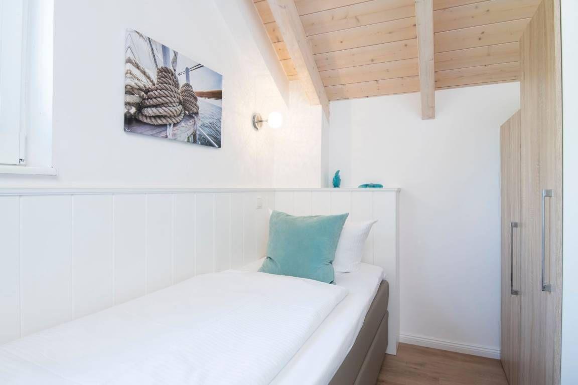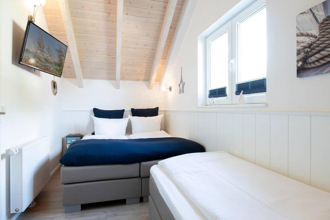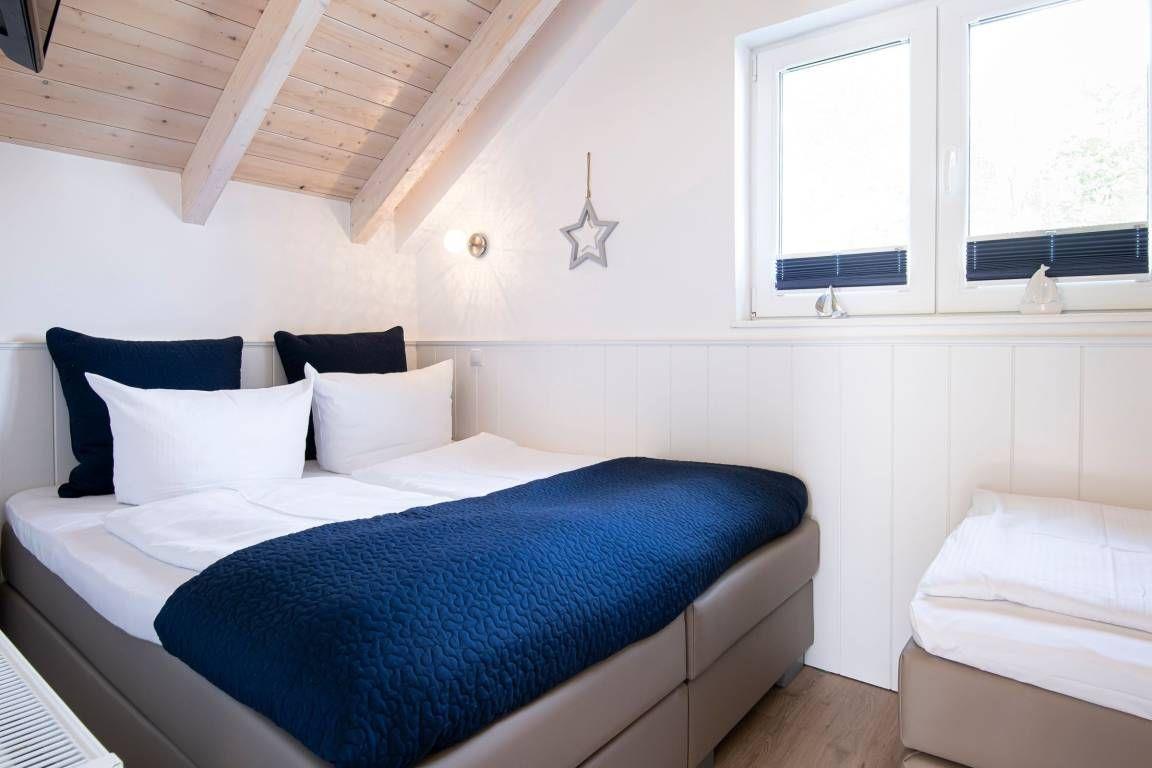 Freuen Sie sich auf zwei charmante Schlafzimmer mit hochwertigen Boxspringbetten (160x200 cm), Verdunkelungsplissees und eigenen Smart-TVs. Vom Balkon aus genießen Sie die frische Ostseeluft gleich nach dem Aufstehen. Ein Schlafzimmer bietet zusätzlich ein Einzelbett (80x200 cm). Treppengitter oben und unten sorgen für Sicherheit für Familien mit kleinen Kindern. Für Familien mit Kindern sorgen Treppengitter und ein durchdachtes Raumkonzept für zusätzliche Sicherheit und Entspannung.