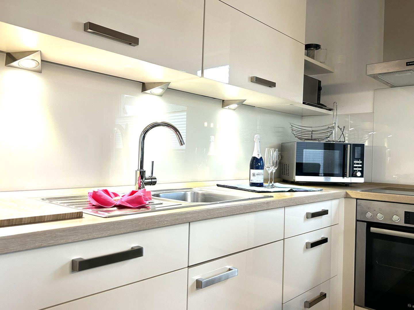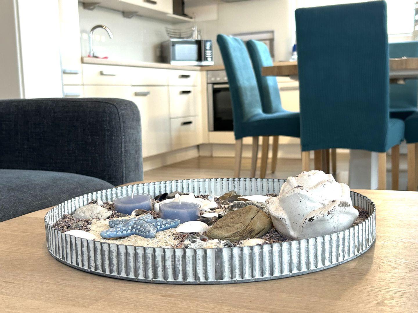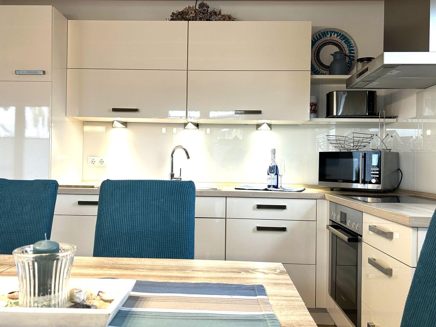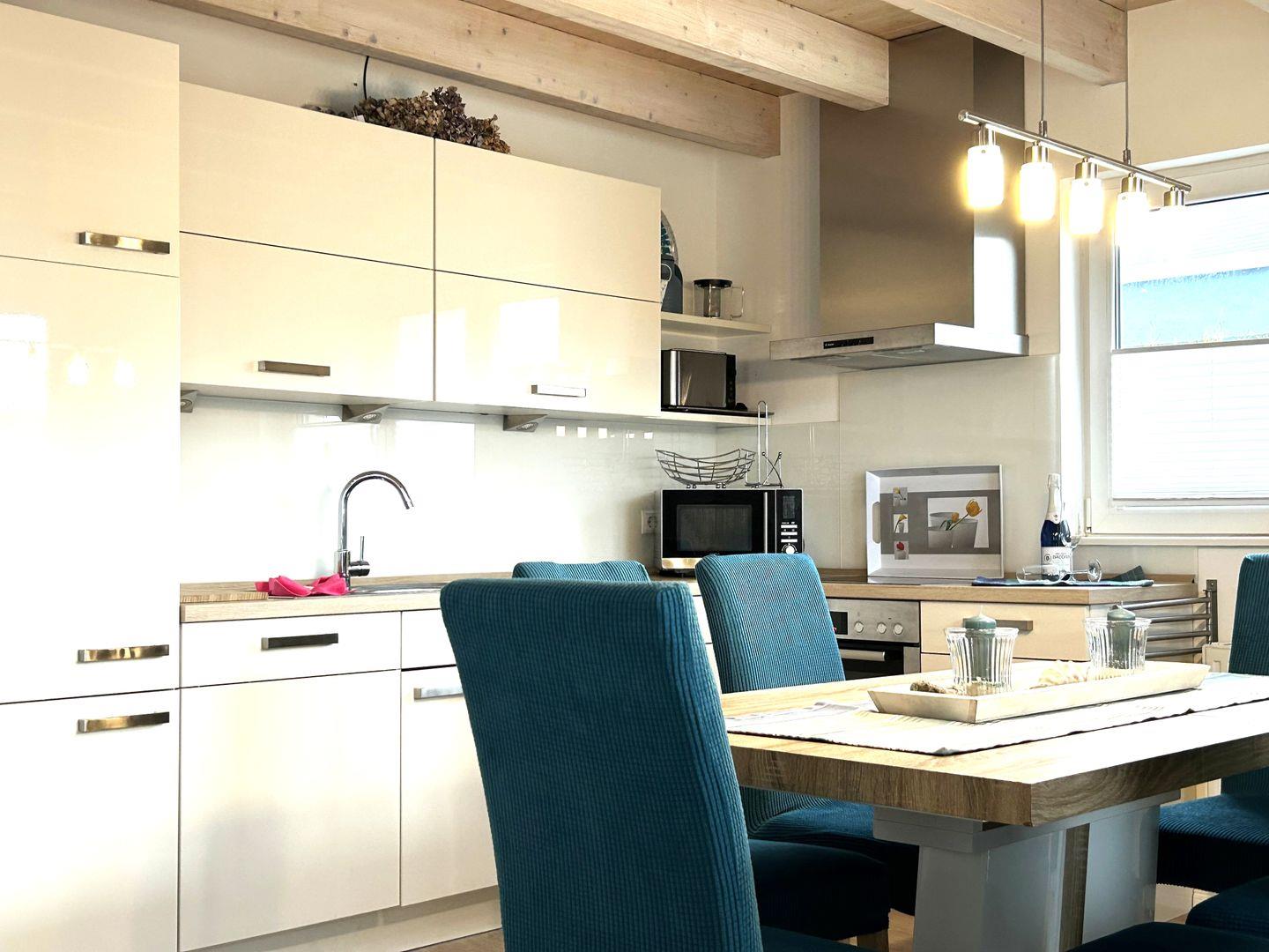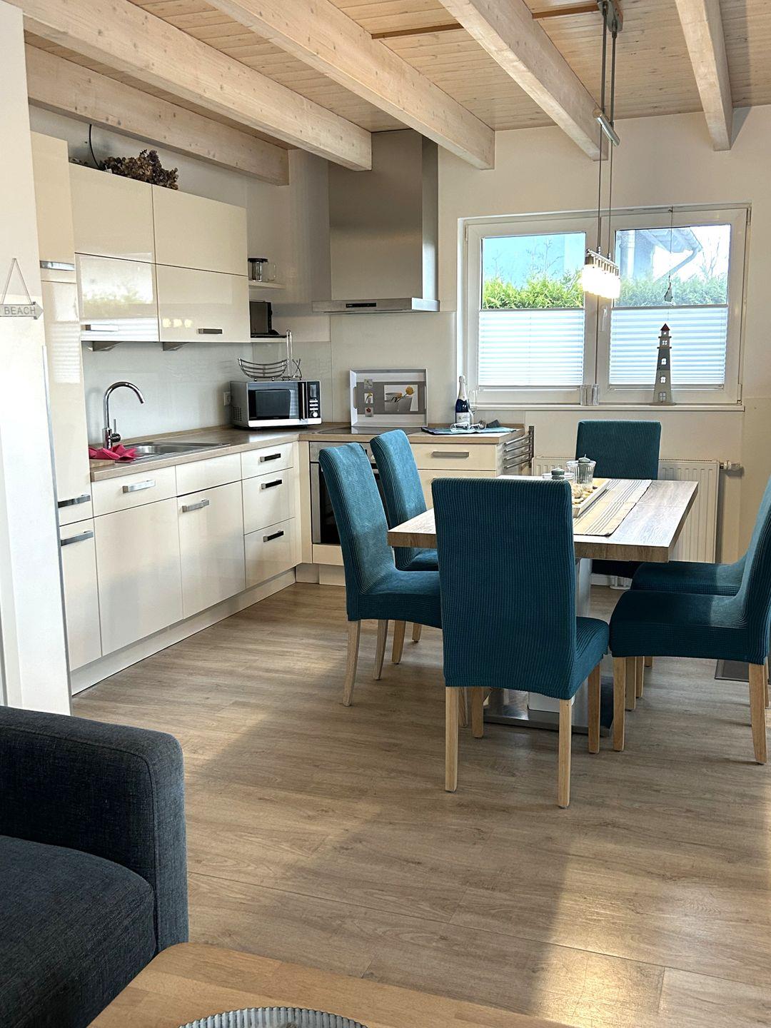 Die offene, zum Wohnzimmer hin gestaltete Küche ist umfassend ausgestattet mit Induktionskochfeld, Backofen, Mikrowelle, Kühlschrank mit Gefrierfach, Spülmaschine, Kaffeemaschine, Wasserkocher, Mixer, Toaster, Eierkocher sowie Geschirr und Besteck. Ein gemütlicher Essbereich mit Esstisch bietet ausreichend Platz für gemeinsame Mahlzeiten.