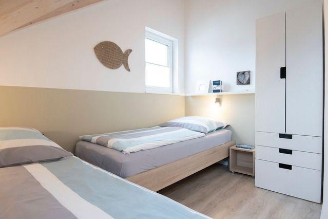 Das schöne Ferienhaus erstreckt sich über zwei Etagen und eignet sich bestens für bis zu sechs Personen. Insgesamt stehen Ihnen vier Zimmer, davon drei Schlafzimmer (SZ 1: 1 Doppelbett (durchgehender Topper 160x200 cm), Plissees (verdunkelnd), Kleiderschrank, TV, SZ 2: 1 Doppelbett (durchgehender Topper 160x200 cm), Plissees (verdunkelnd), Kleiderschrank, TV, SZ 3: 2 Einzelbetten (je 90x200 cm), Plissees (nicht verdunkelnd), Kleiderschrank, TV, sowie zwei Badezimmer und ein Gäste-WC zur Verfügung. Familien sind hier herzlich willkommen, ein Hund ( maximal) darf gegen Aufpreis gern mitreisen. Alle Kopfkissen verfügen über einen Milbenschutzbezug, die Matratzen haben ebenfalls einen kompletten Schonbezug.