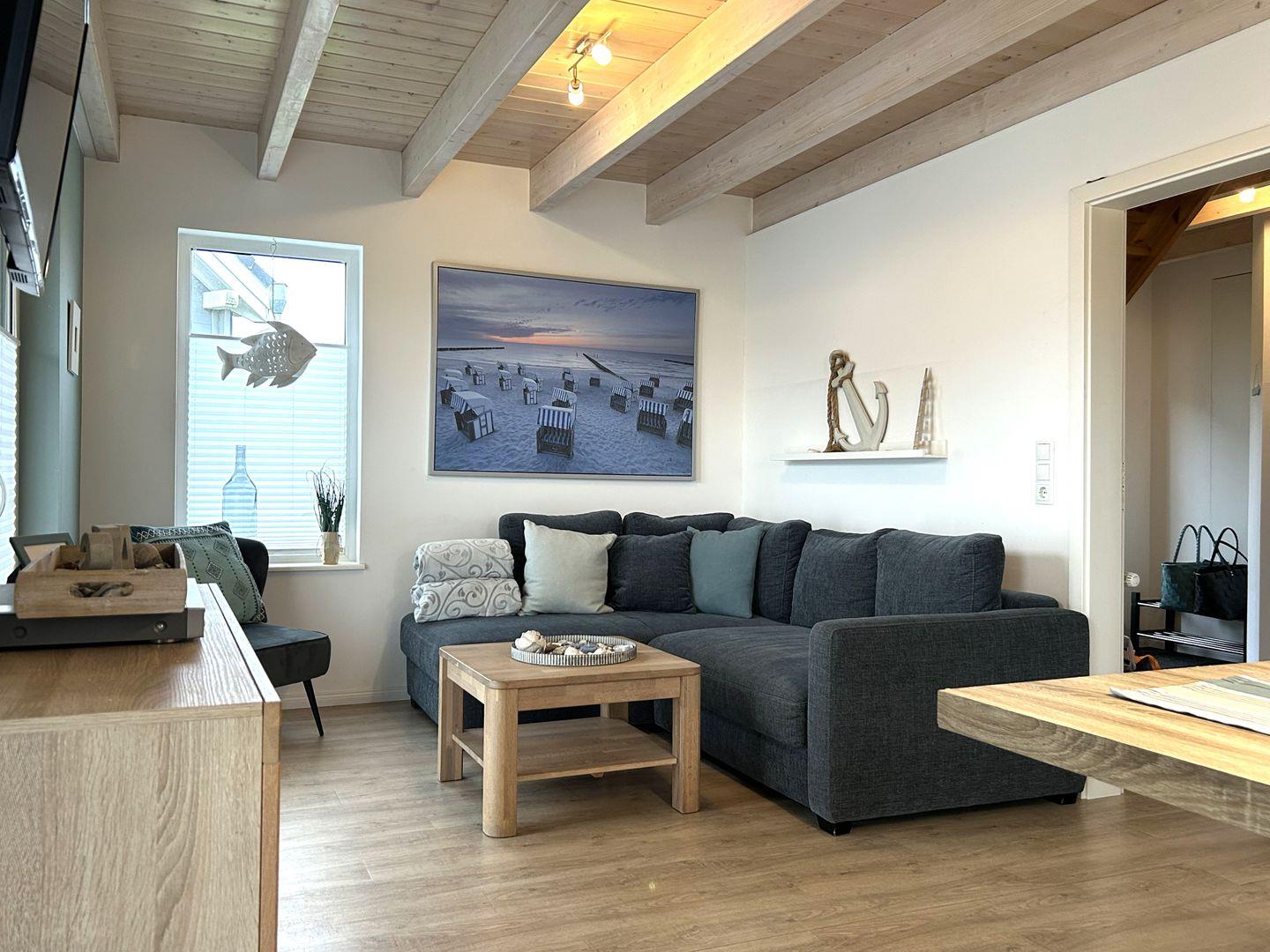 Im Wohnbereich erwartet Sie eine gemütliche Sofaecke, die mit TV-Gerät, WLAN, Radio, DVD- und Blu-ray-Player sowie CD-Spieler für Unterhaltung sorgt. In der kühleren Jahreszeit schafft ein Kaminofen eine behagliche Atmosphäre. Große Fenster unterstreichen die freundliche, helle Raumgestaltung.