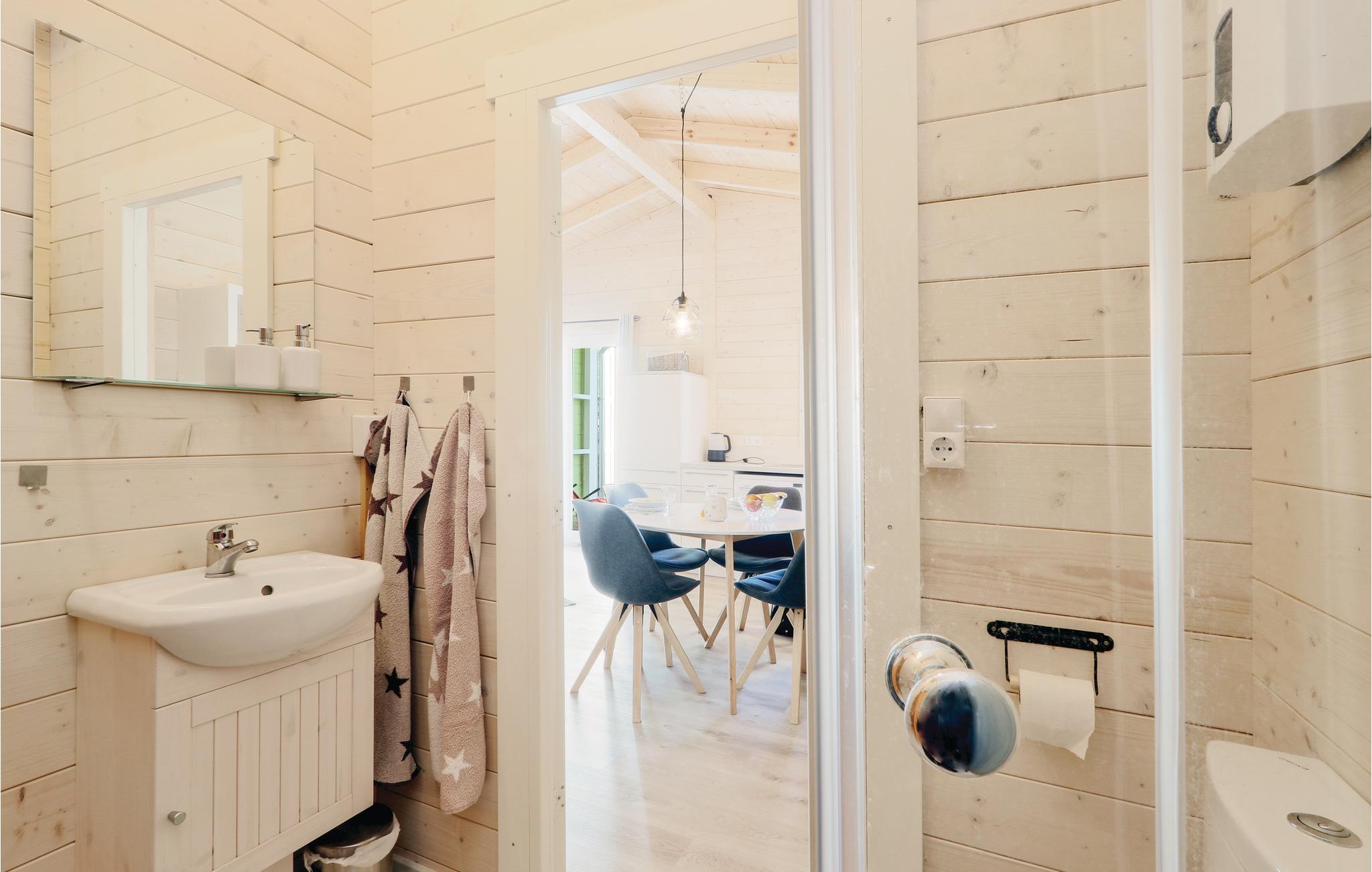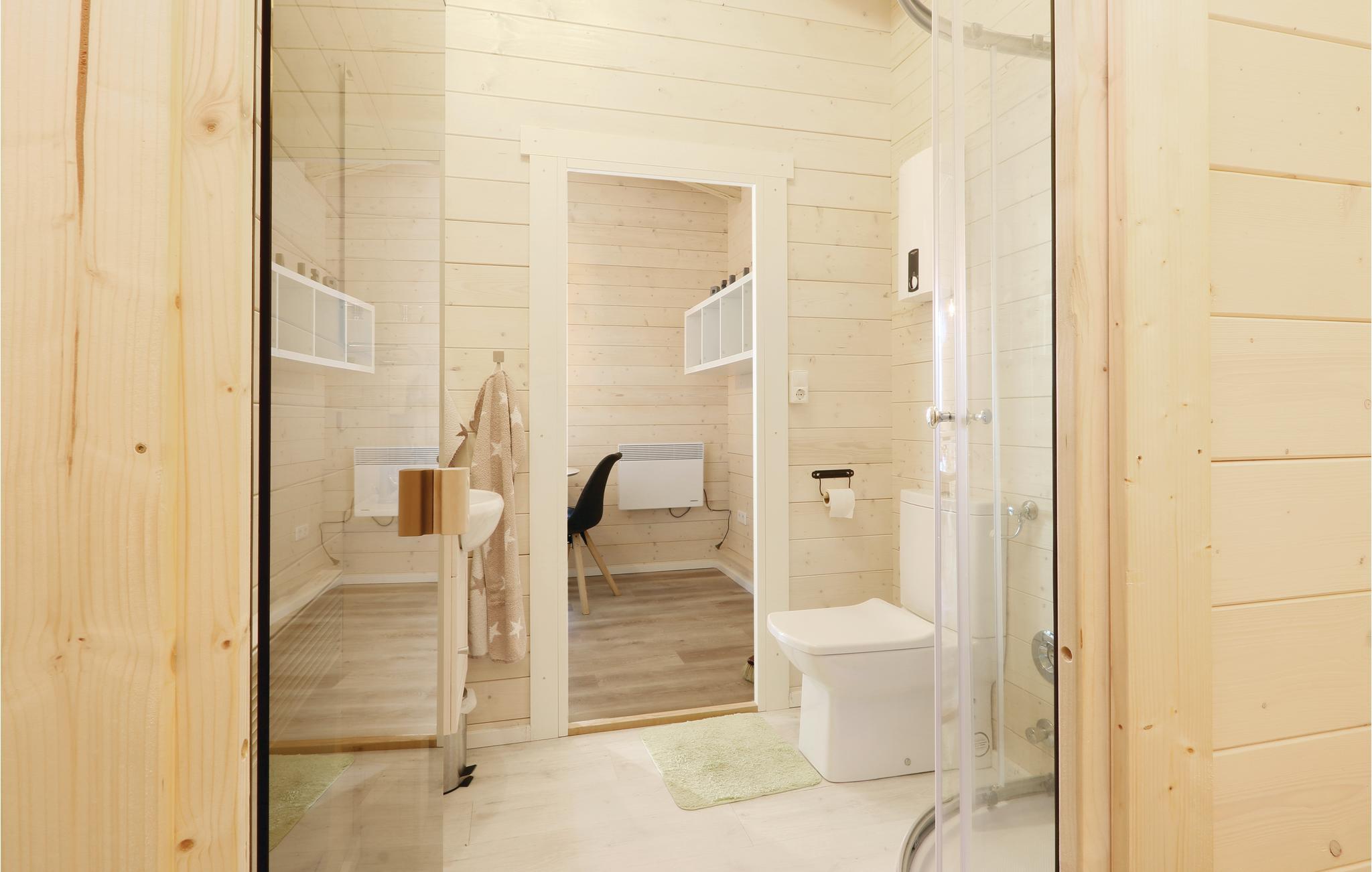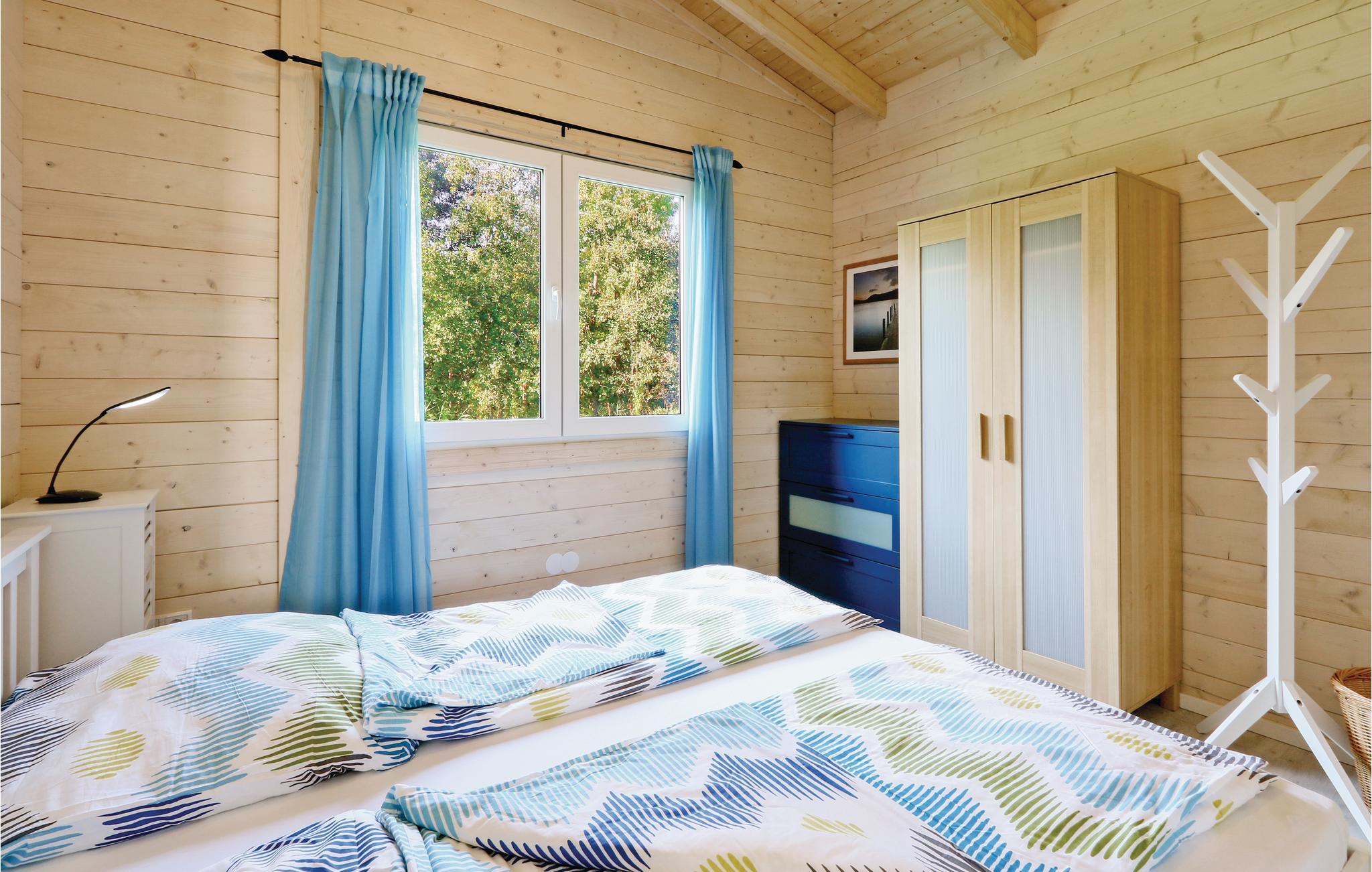Das Holzhaus ist gemütlich eingerichtet und verfügt über ein separates Schlafzimmer mit großzügigem Doppelbett sowie einem separaten Duschbad. Im kombinierten Wohn- und Essbereich befindet sich ebenfalls die gut ausgestattete Küchenzeile. Sonnige Stunden können Sie auf der offenen Terrasse verbringen. Der Platz vor dem Haus lädt zum entspannen oder zu Grillabenden ein. Gartenmöbel sowie ein Grill stehen Ihnen zur Verfügung.