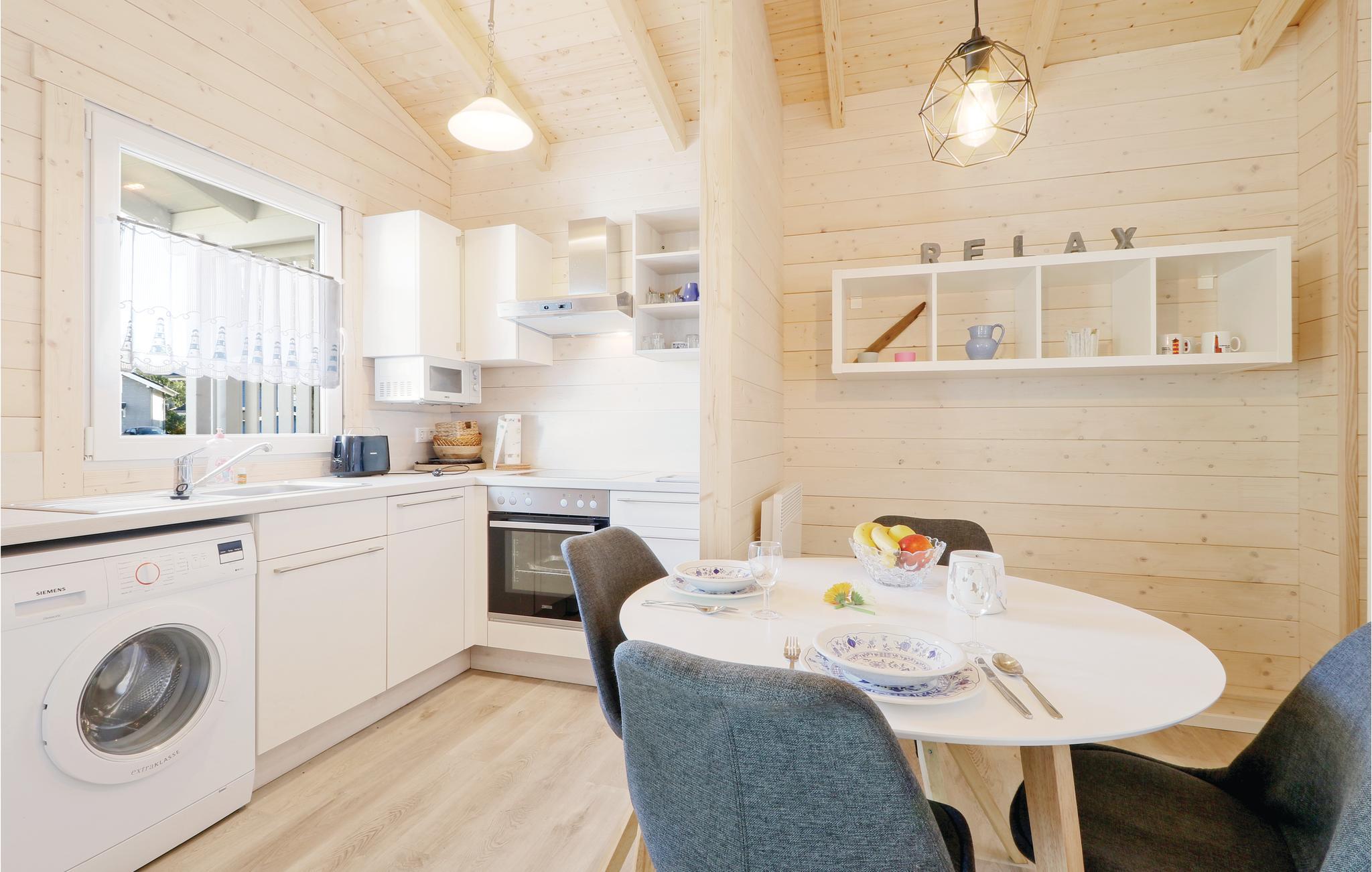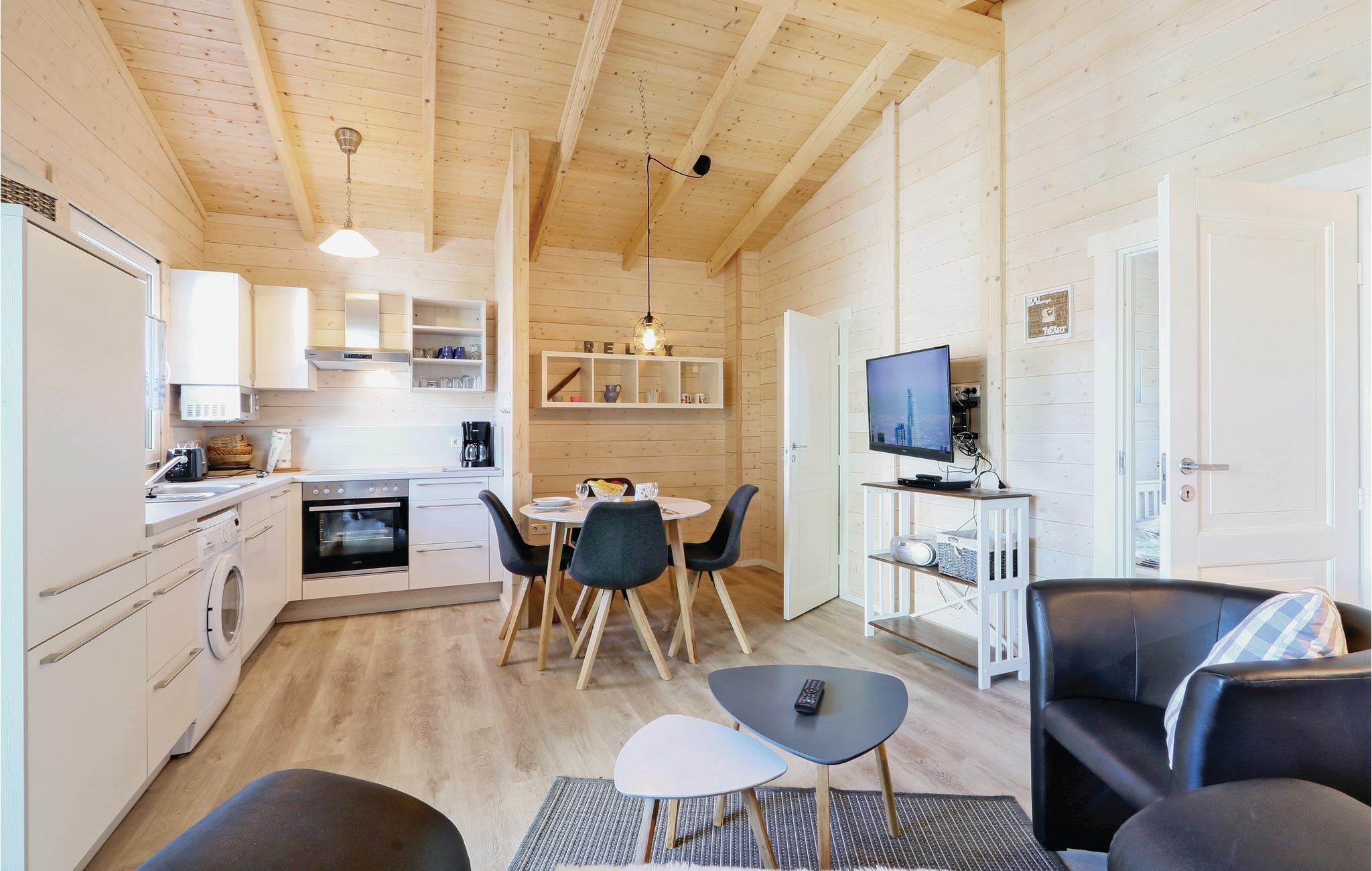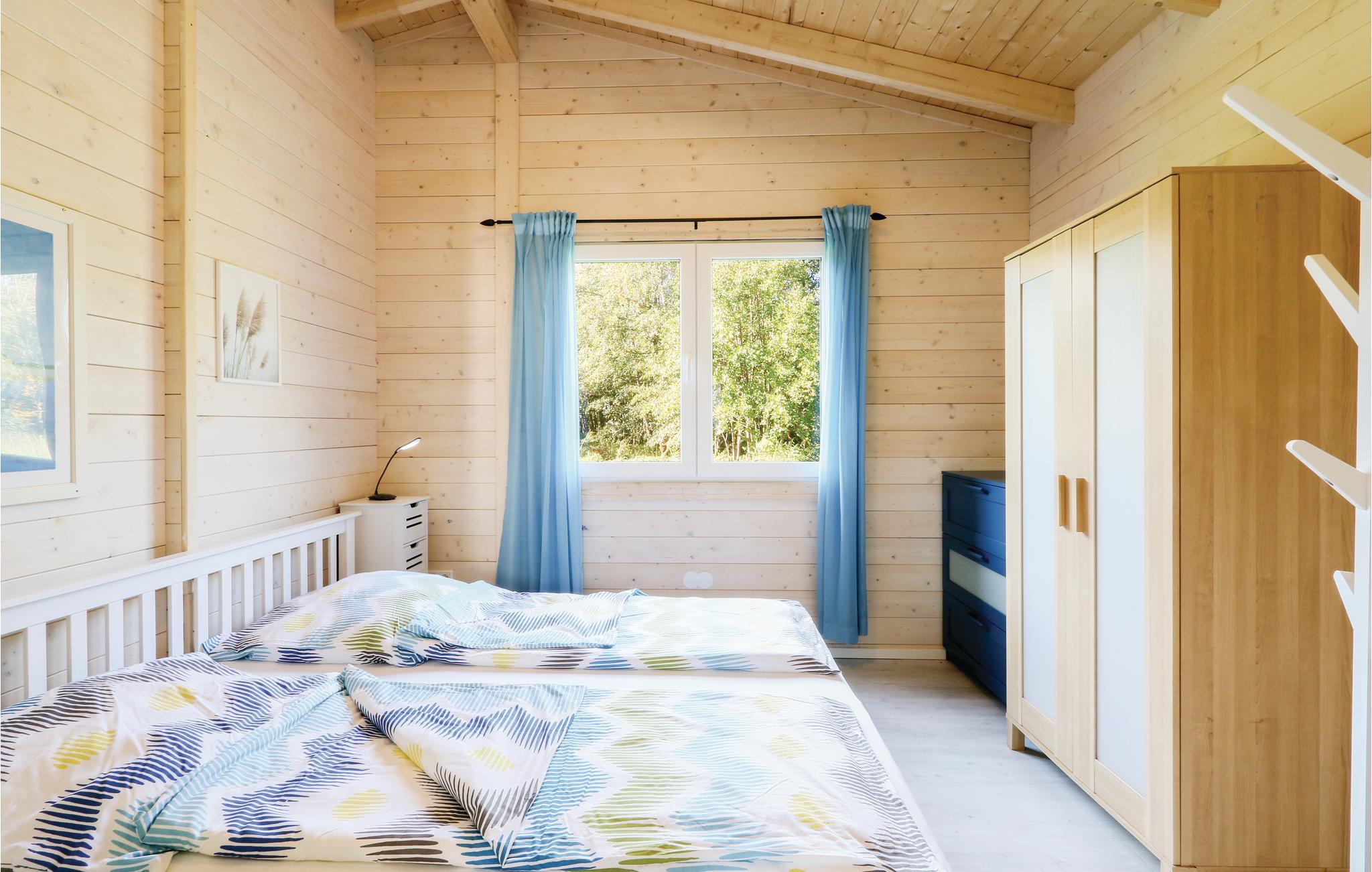 Das Holzhaus ist gemütlich eingerichtet und verfügt über ein separates Schlafzimmer mit großzügigem Doppelbett sowie einem separaten Duschbad. Im kombinierten Wohn- und Essbereich befindet sich ebenfalls die gut ausgestattete Küchenzeile. Sonnige Stunden können Sie auf der offenen Terrasse verbringen. Der Platz vor dem Haus lädt zum entspannen oder zu Grillabenden ein. Gartenmöbel sowie ein Grill stehen Ihnen zur Verfügung.
