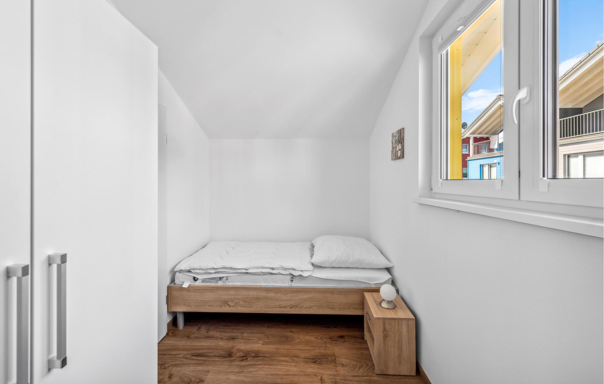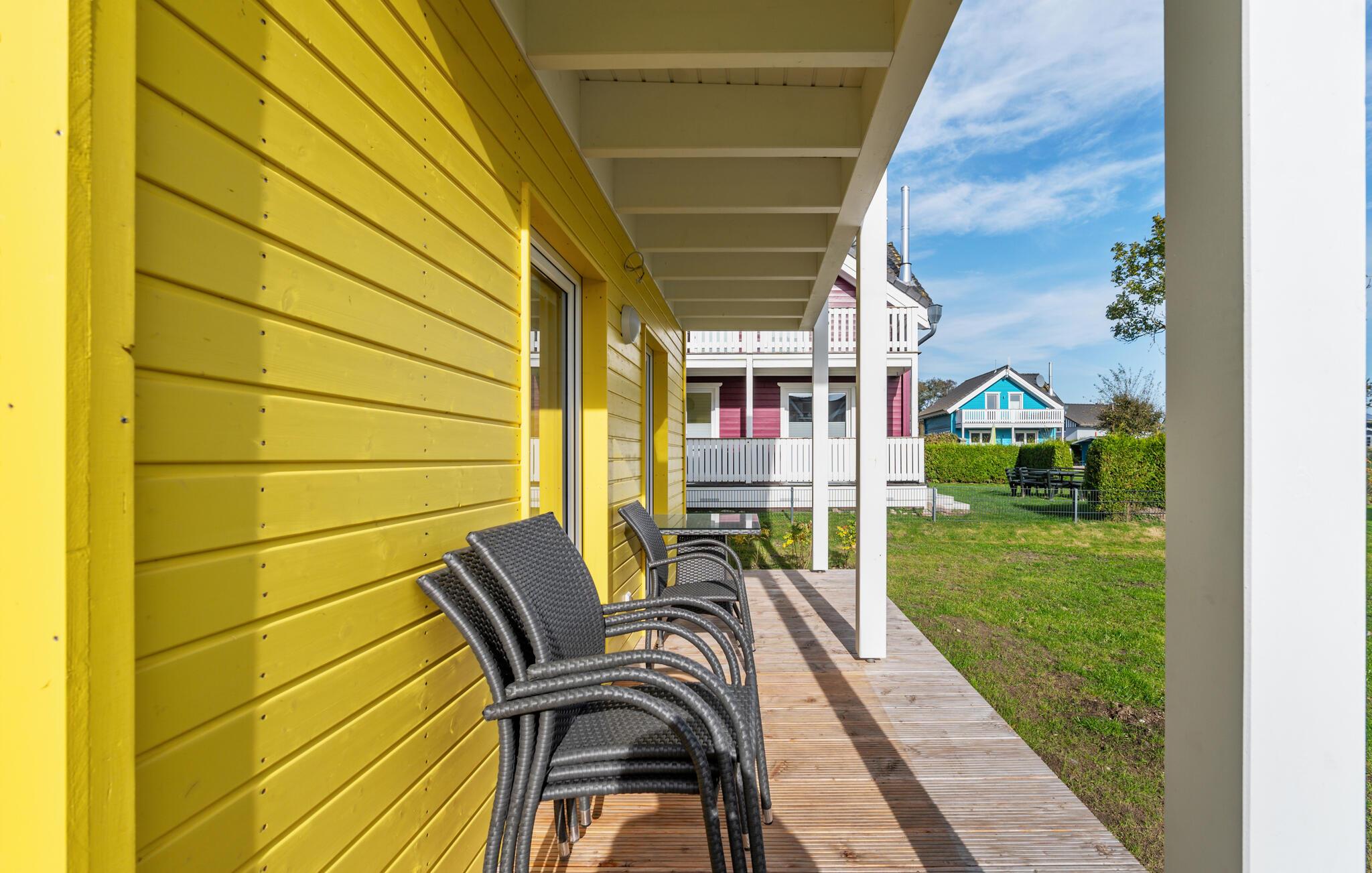 Ihr Haus erstreckt sich dort über zwei Etagen. Im Erdgeschoss befindet sich ein offener, gemütlicher Wohnbereich mit angrenzender Terrasse, eine moderne Einbauküche sowie ein Duschbad mit einer Sauna. Im ersten Stock lädt ein geräumiger Balkon zum Verweilen ein. Zudem befinden sich auf dieser Ebene zwei Schlafzimmer und ein Badezimmer. Hier können Sie die schöne Ostseeluft und einen tollen Blick auf das Feriendorf von dem Balkon genießen. Hochwertige Möbel und eine gelunge Raumaufteilung machen dieses Ferienhaus zu einem traumhaften Urlaubsdomizil in ruhiger Umgebung.