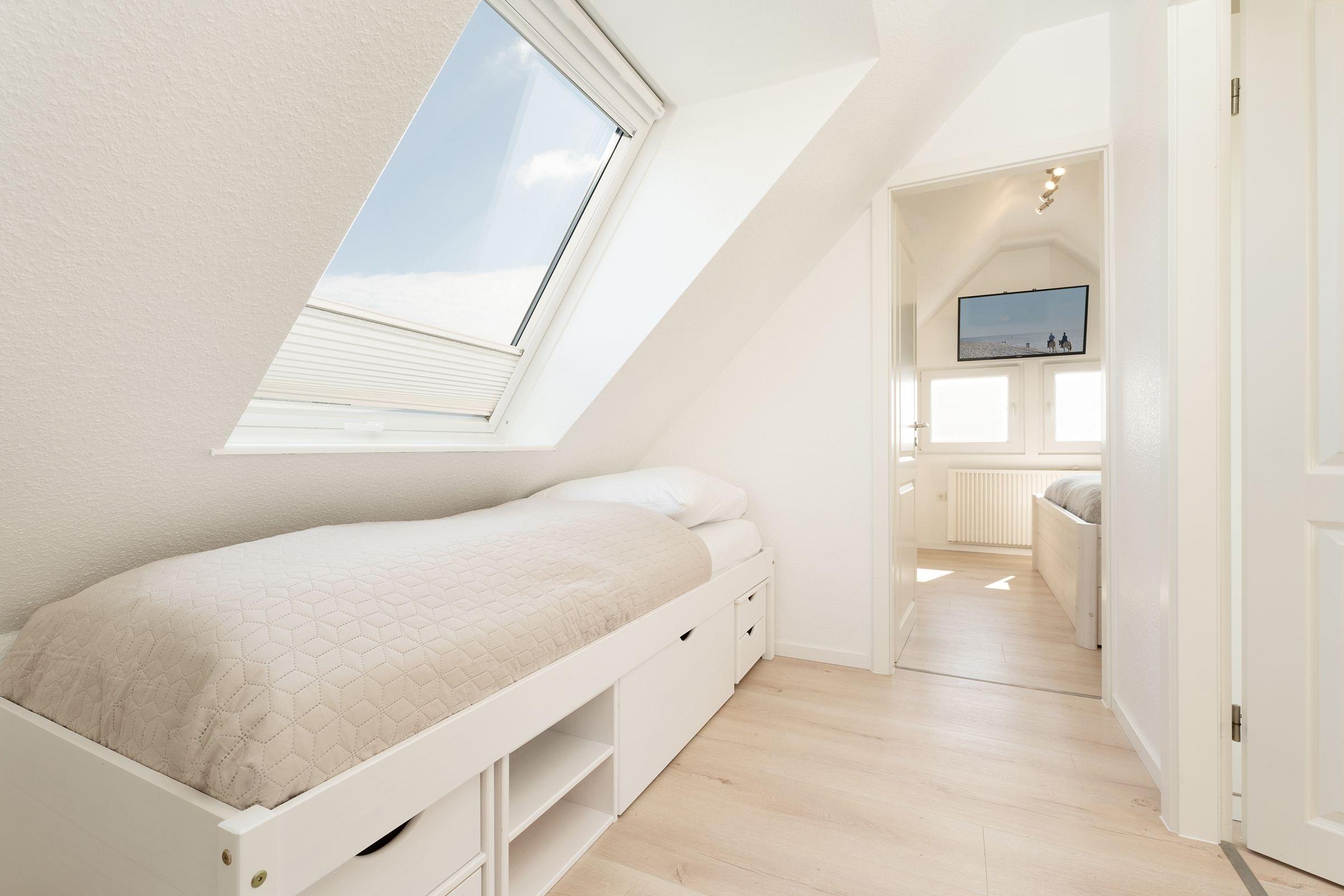 Lassen Sie den Tag auf der Terrasse mit eigenem Strandkorb entspannt ausklingen. Auch das Haus besticht durch seine durchdachte Ausstattung. Sowohl die gemütliche TV-Ecke im Wohnbereich als auch die offene, moderne Küche mit Induktionsherd wird Sie begeistern. Traumhafte Nächte verbringen Sie im Obergeschoss: Ein Schlafzimmer ist mit einem Doppelbett (2x 90x200 cm) und eins mit zwei stapelbaren Einzelbetten (je 80x200 cm) möbliert. Im gemütlichen Durchgangsbereich steht dazu ein Einzelbett (80x200 cm). Das Duschbad mit Tageslicht lässt Sie prima in den neuen Tag starten.