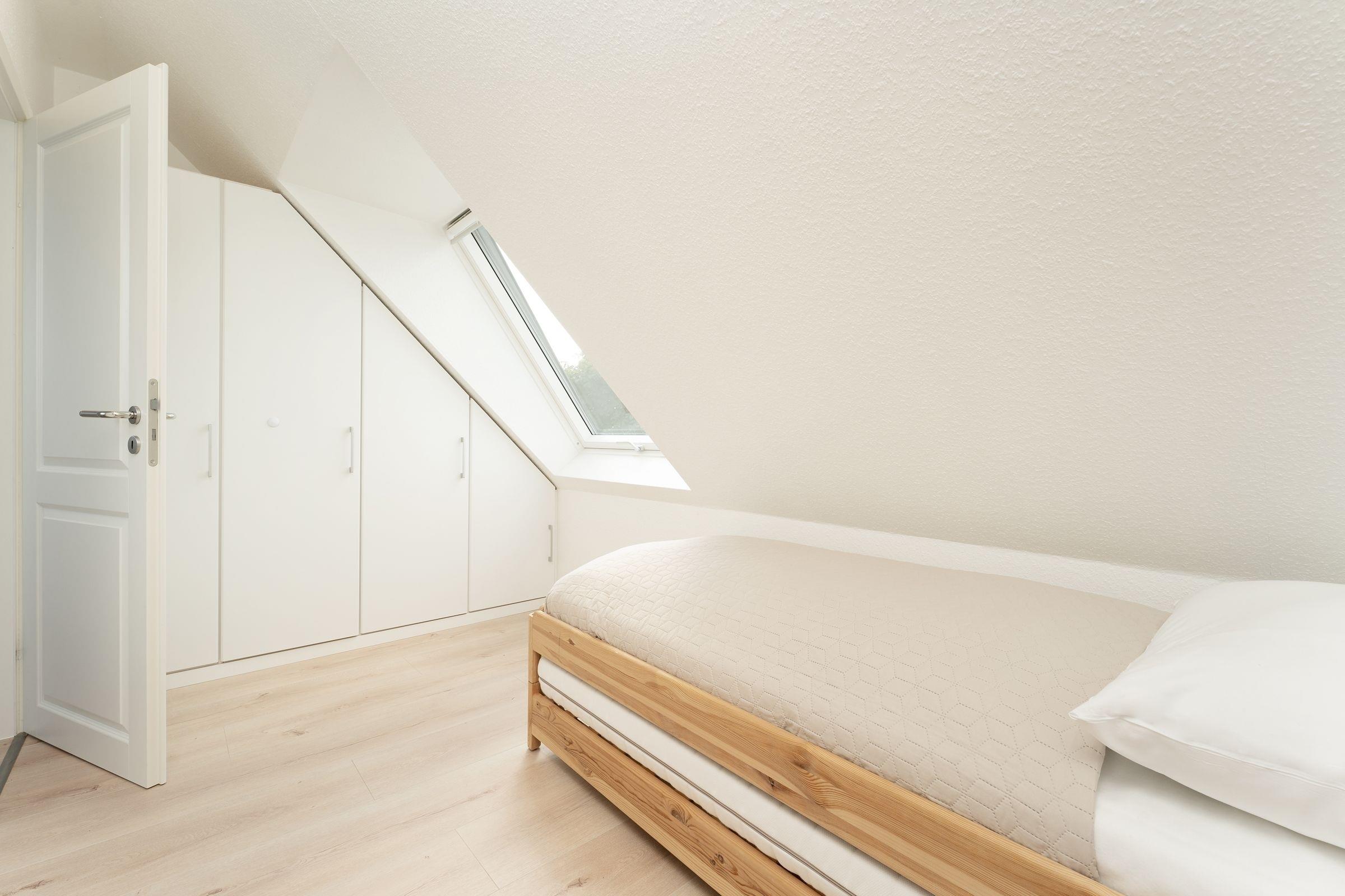 Schlafzimmer 2 (OG): 2 stapelbare Einzelbetten (je 80x200 cm), Kleiderschrank, Verdunkelung: Außenjalousien, kein Platz für Babybett vorhanden
