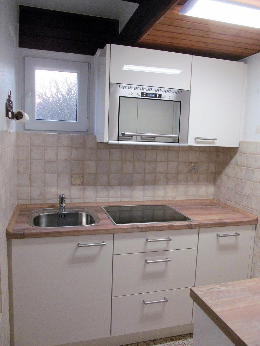 Die Küchenzeile ist neu eingebaut und verfügt über ein 4er-Ceranfeld sowie ein Kombigerät Mikrowelle/Heißluftofen und eine Geschirrspülmaschine.