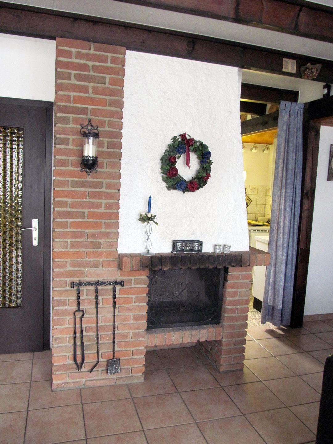 Der Wohnbereich ist gefliest und bietet gemütliche Sitzgelegenheiten zum Essen und zum Entspannen. Für eine besonders schöne Atmosphäre sorgt der eingebaute Kamin.