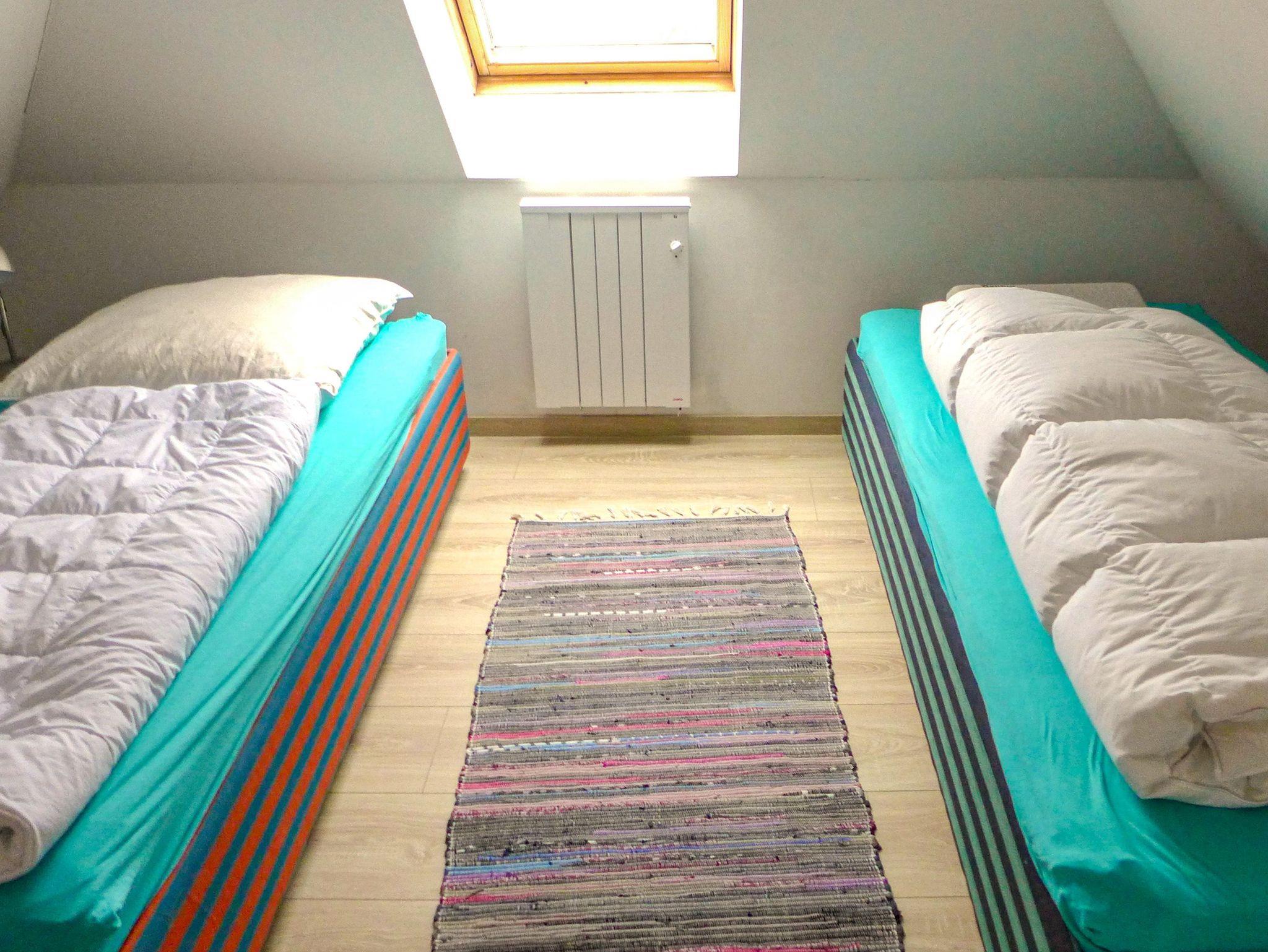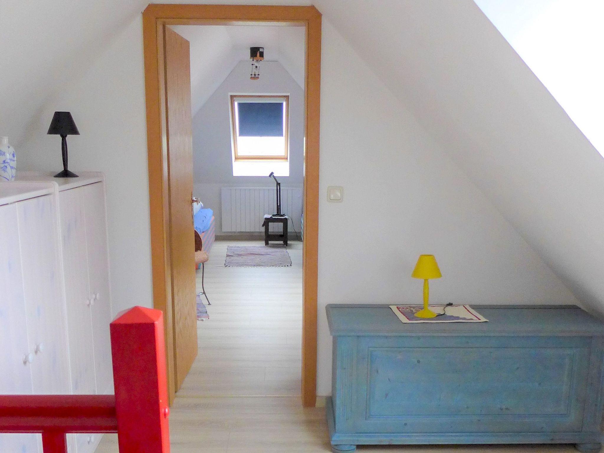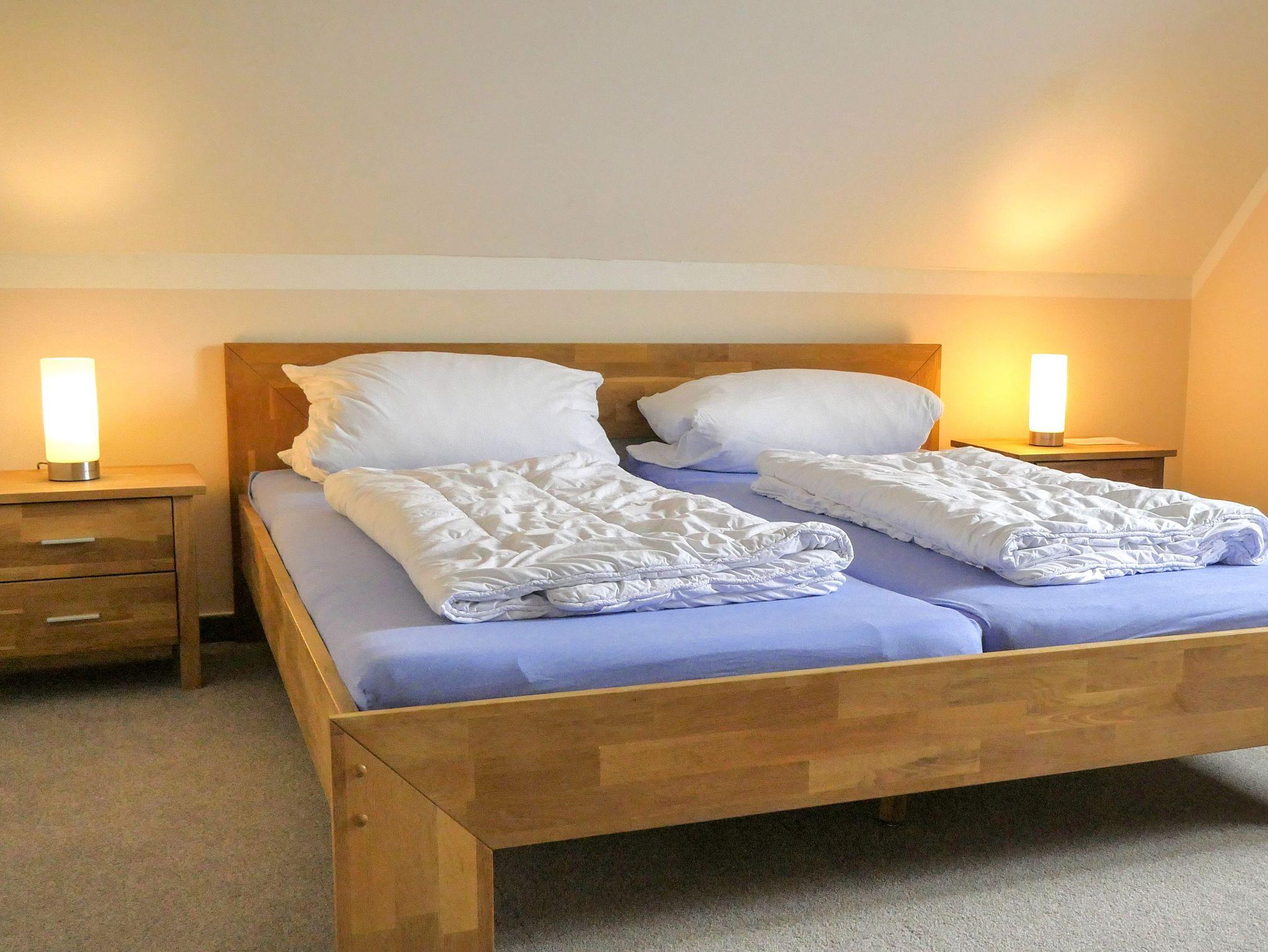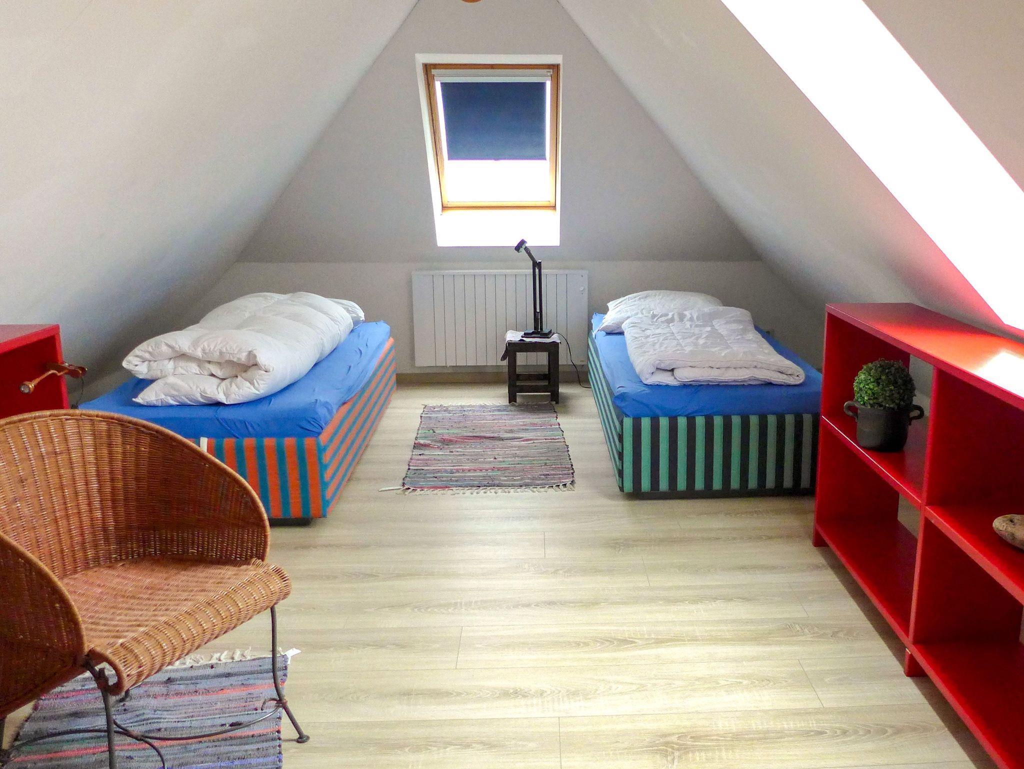 Über eine Raumspartreppe gelangst du in das Dachgeschoss, wo zwei weitere Schlafzimmer mit jeweils zwei Einzelbetten (80x200) auf dich warten. Diese Räume bieten viel Gemütlichkeit und sind ideal für Kinder oder Freunde, die einen eigenen Rückzugsort genießen möchten.