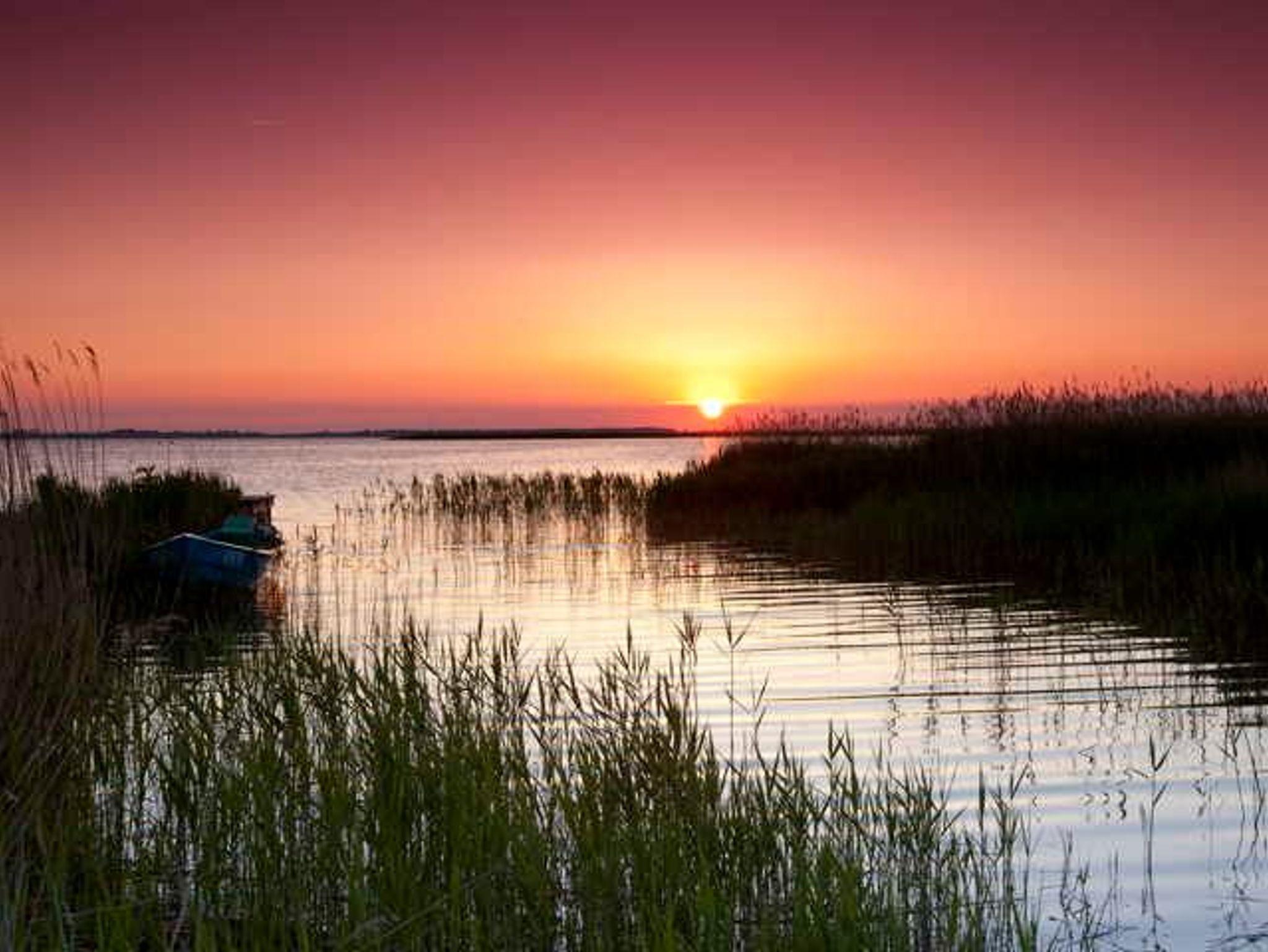 Vom Ferienhaus zum Bodden sind es nur 100 Meter. Hier gibt es einen Anlegesteg, von dem aus gesurft oder gebadet werden kann.