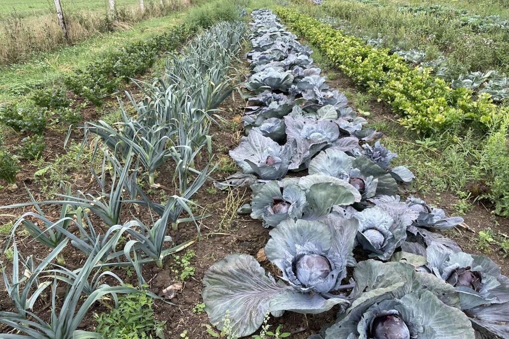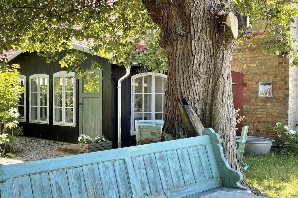 Idyllisches Atelierhaus auf Hof Jumne mit Blick über Apfelbäume und Felder, Veranda und vielseitigem Gartenbereich.
