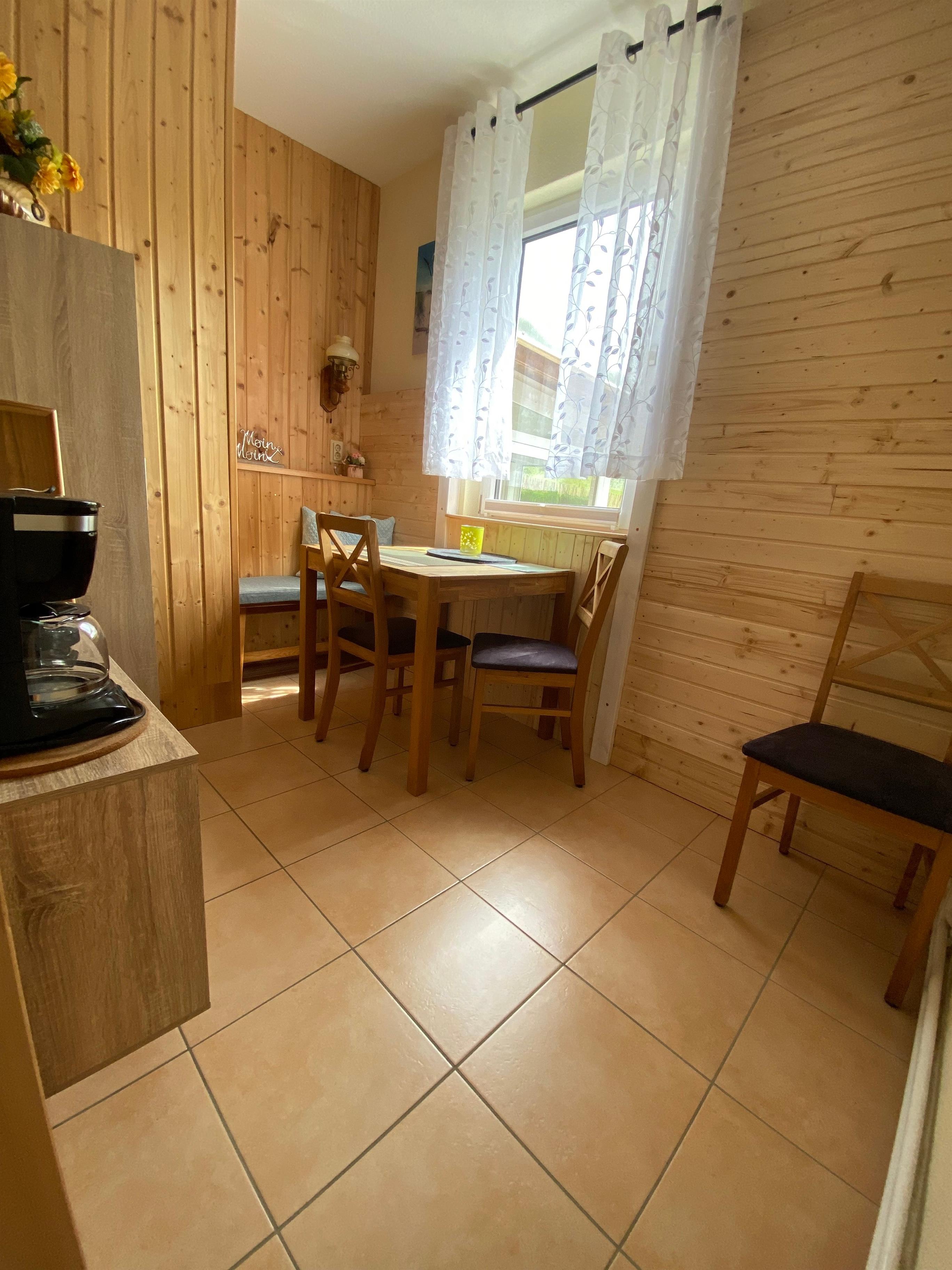 Unsere 43qm große 2,5 Raum-Wohnung bietet Ihnen viel Platz für Ihren wohlverdienten Urlaub. Der Wohn- und Essbereich mit Veranda bietet ausreichend Sitzmöglichkeiten mit Fachbild-SAT-TV, Radio und WLAN. Die große Wohnküche mit Küchenzeile und dem gemütlichen Esstisch lassen jeden Morgen gemütlich starten. Im Schlafzimmer steht für Ihren geruhsamen Schlaf ein großes Doppelbett (180 x 200 Meter) mit verstellbaren Lattenrosten bereit. Hier ist ein Schlafsessel von Wohnidee der als Schlafgelegenheit ( vorher angeben) umfunktioniert werden kann. Dieser hat eine Liegefläche von 80 x 190 Meter. Die voll ausgestattete Küchenzeile (Kühlschrank mit Gefrierfach, Herd mit 2 Platten, Multifunktionsbackofen mit Grill, Mikrowelle, ist neben Kaffeemaschine und Kapselmaschine (Dulco Gusto), Toaster und Wasserkocher somit gut ausgestattet. Eine eigene Terrasse vor der Wohnung lädt ebenfalls zum sitzen ein. Das Dusch-/Badezimmer ist modern eingerichtet. Der Bodenbelag im Schlafzimmer ist ein Dielenboden dieser sorgt somit für angenehm wohlige Wärme. In den anderen Zimmern ist Fliesenboden. Damit ist die Wohnung ebenfalls Allergiker freundlich.