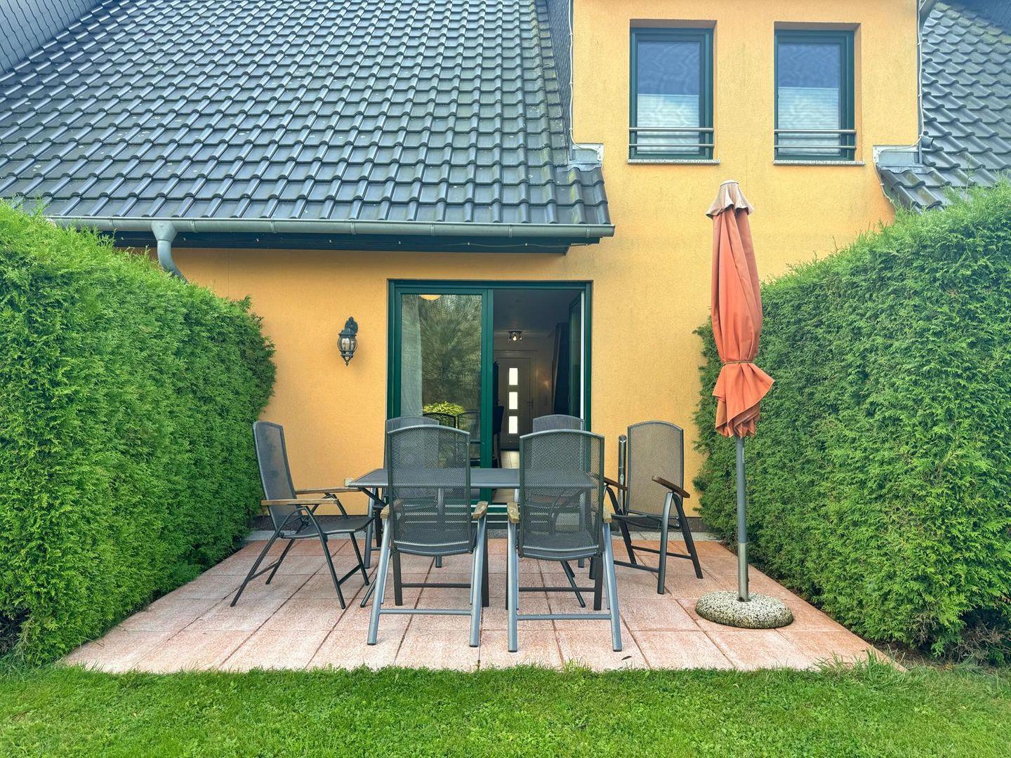Zu jedem Reihenhaus gehört eine separate ca. 14 qm große Terrasse mit Blick in den Garten und auf den Bodden, mit seitlichen hohen Hecken und Gartenmöbeln.