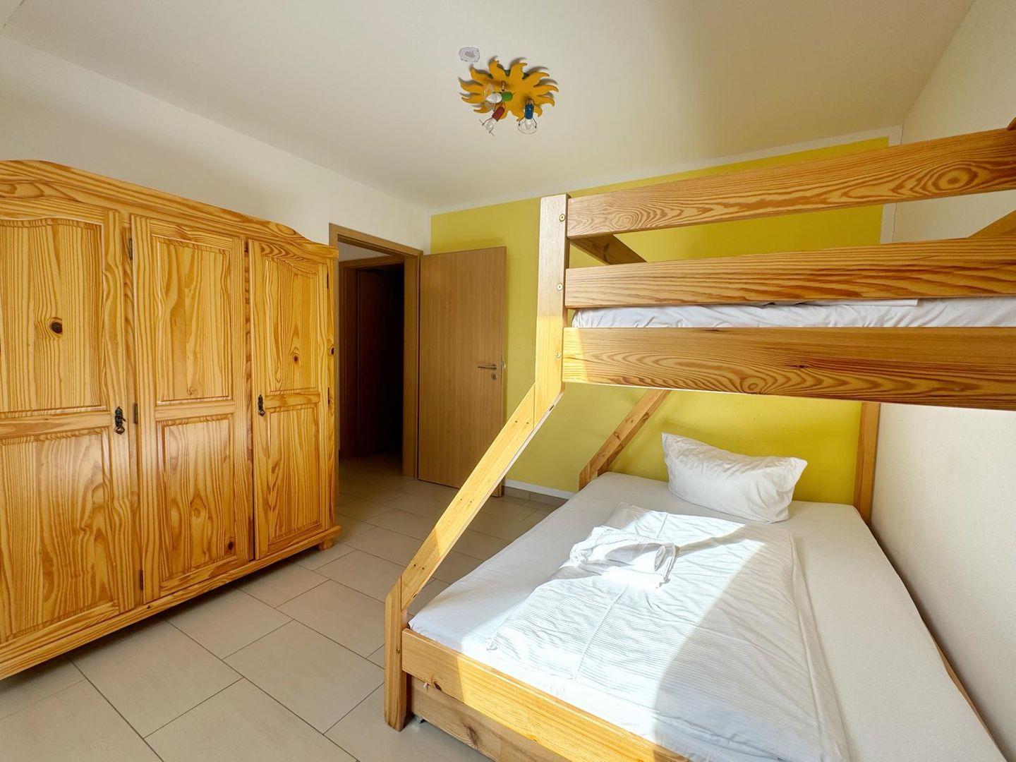 Es gibt ein Schlafzimmer mit Doppelbett und ein zweites Schlafzimmer bzw. Kinderzimmer mit einem Etagenbett. Dieses Etagenbett hat drei Ebenen /Liegeflächen (unter dem unteren Bett befindet sich noch ein weiteres gleich breites Bett zum ausziehen.) Die Kinder haben also viele Schlafmöglichkeiten und auch ein Elternteil kann sich mal mit hinein kuscheln, da die beiden unteren Liegeflächen breiter sind als das obere Bett. Im Wohnzimmer gibt es auf einer Couch mit Bettfunktion eine weitere Schlafmöglichkeit.