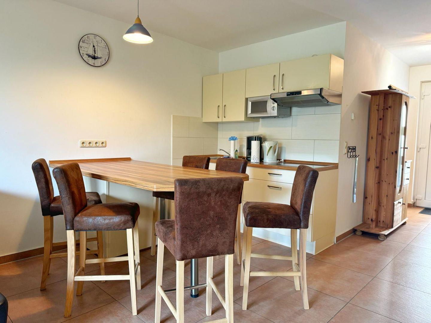 Die 3-Zimmer-Wohnung für 6 Personen erstreckt sich über zwei Etagen mit Wohnbereich, offener Küche und Bad im Erdgeschoß sowie den beiden Schlafräumen im 1. OG.