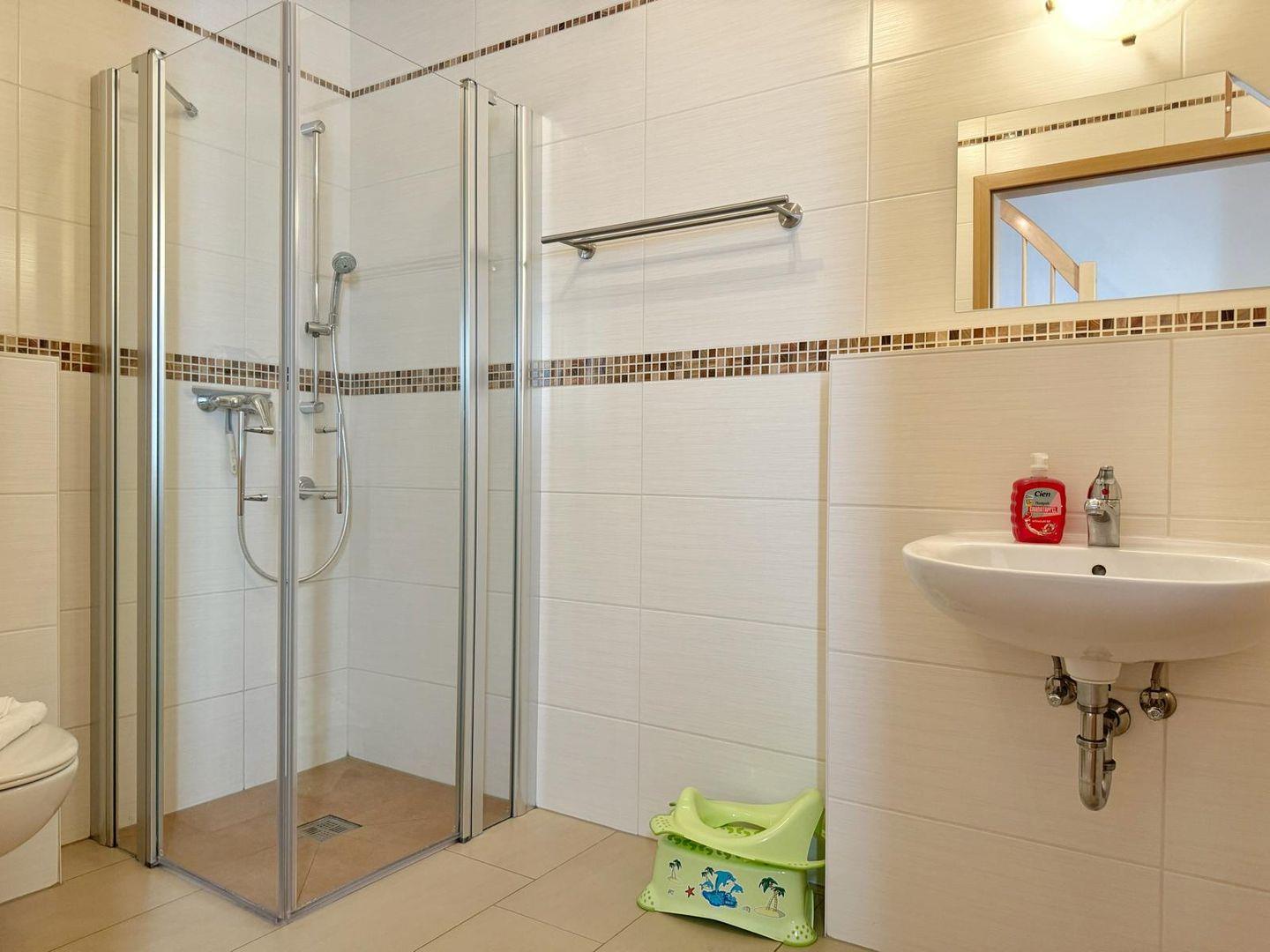 Das Bad bietet eine ebenerdige Dusche.