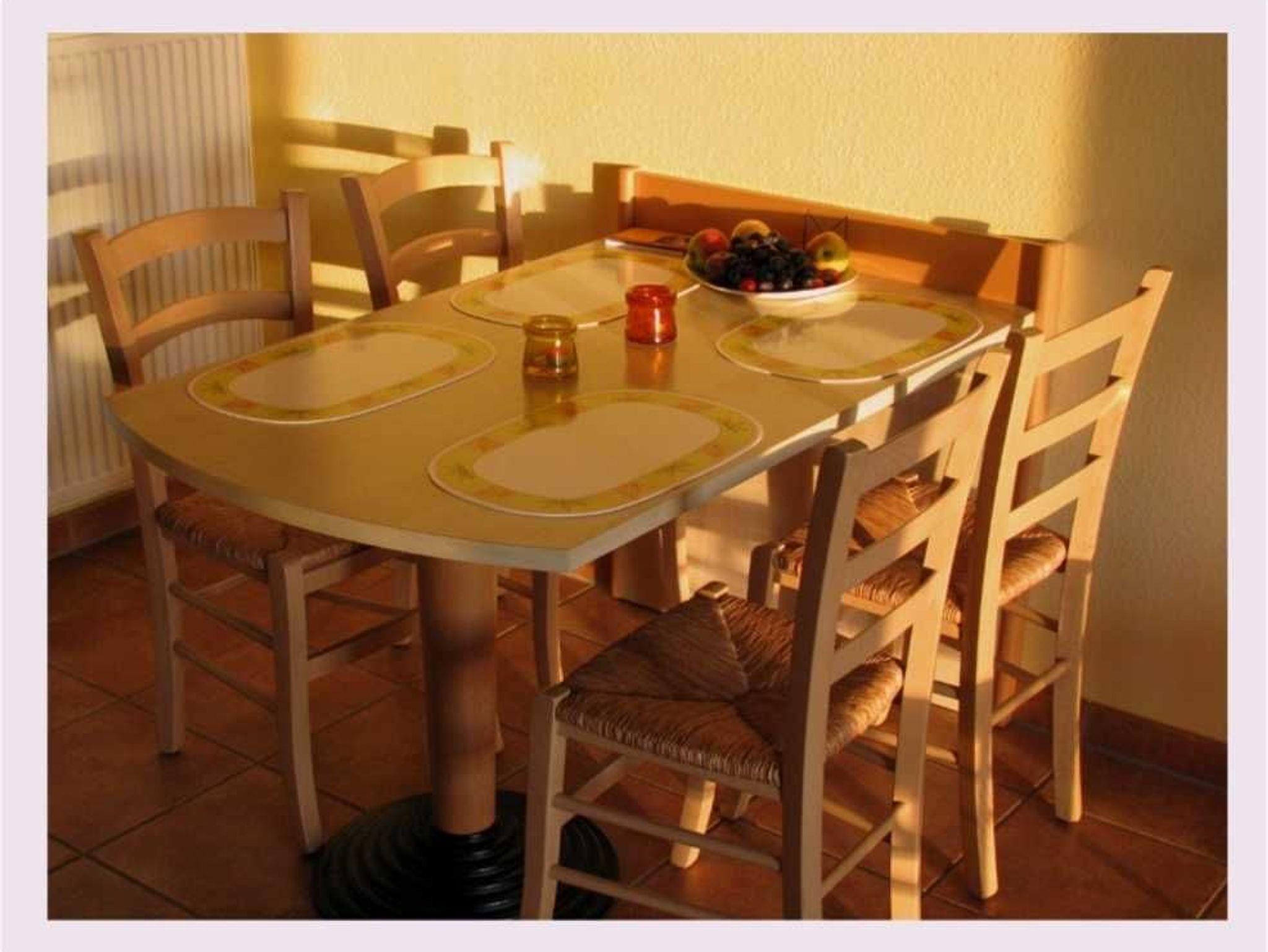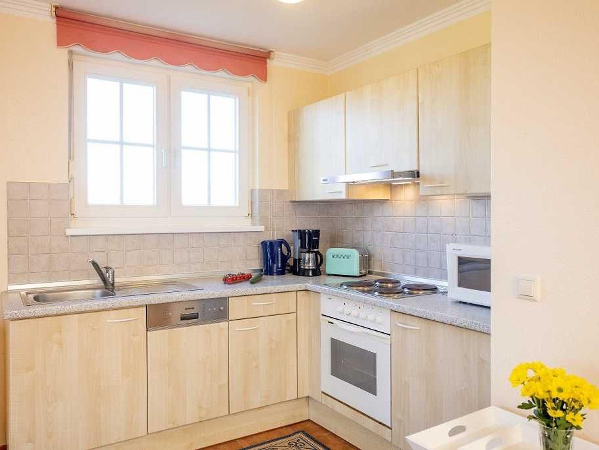 Neben zwei Einzelbetten im Schlafzimmer steht im kombinierten Wohn-/Essraum ein aufbettbares Bettsofa (180 x 200 cm - Kingsize-Doppelbett) mit Relax Rückenlift und Bed Box Ablage zur Verfügung, so daß die Wohnung vier Personen Platz bietet. Zur Wohnung gehören eine Essecke sowie eine vollständig ausgestattete Kochecke (mit E-Herd, Kühlschrank mit Gefrierfach, Geschirrspüler, Mikrowelle, Kaffeemaschine, Wasserkocher, Toaster etc.). Ein Bad mit Dusche und WC, ein zusätzliches Gäste-WC neben dem Schlafzimmer, Sat-TV und Musikanlage im Wohnraum und ein Abstellraum u. a. mit Wäscheständer und Terrassen-Möbeln für eine schöne eigene gut geschützte nach SüdWest liegende Sonnenterrasse runden diese Komfort Ferienwohnung ab.