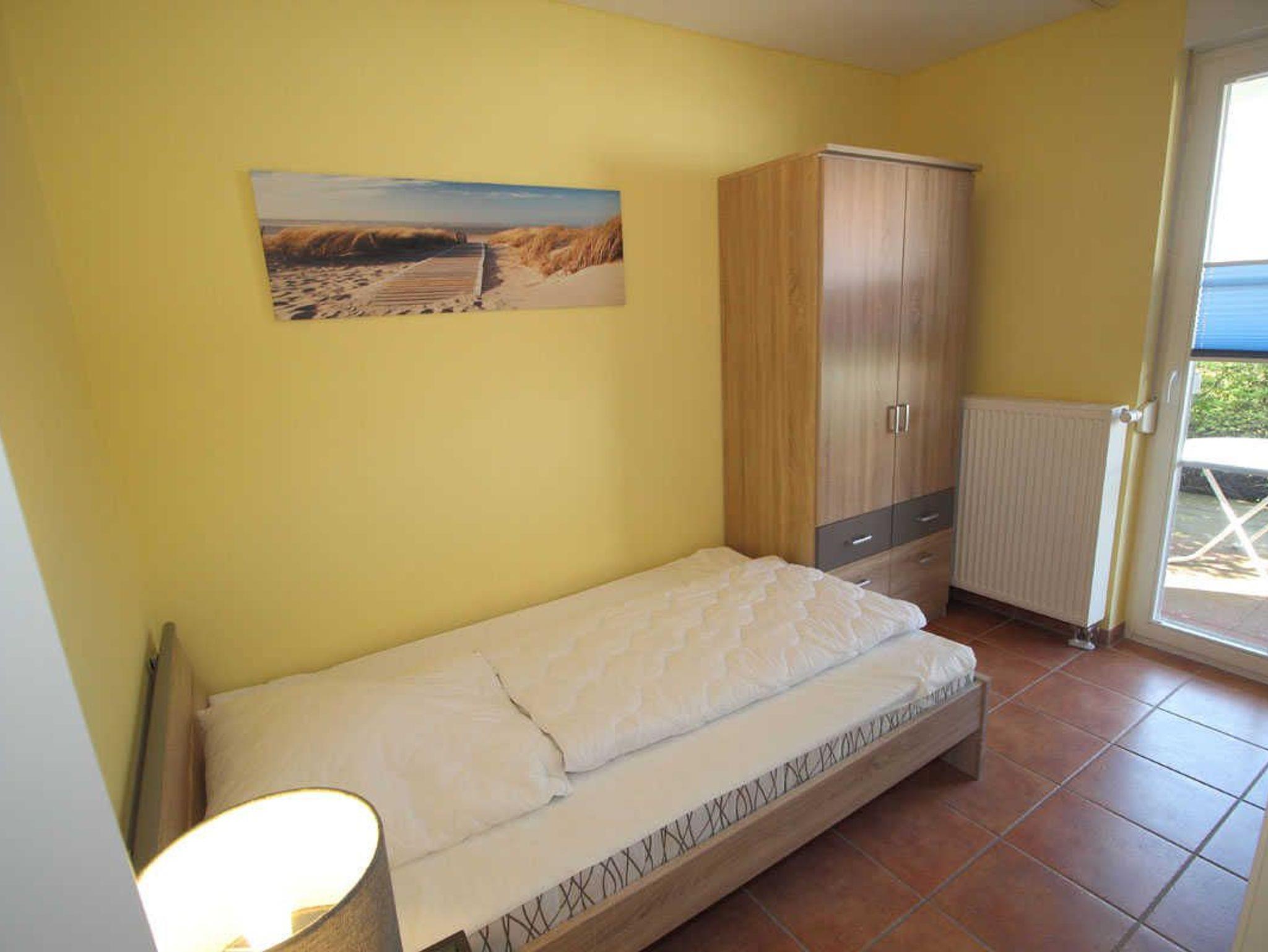 ? Das zweite Schlafzimmer ist mit einem Bett (1,20 x 2,00 m), Nachttisch, Leselampe und Kleiderschrank ausgestattet. Weiterhin verfügt das Zimmer über einen Direktzugang auf die Terrasse.