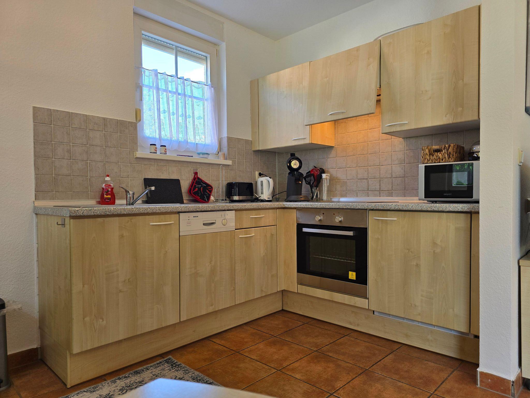 • Die Einbauküche ist offen zum Wohnzimmer und verfügt über einen Kühlschrank mit kleinem TK-Fach, Herd, Backofen, Spülmaschine, Kaffeemaschine, Toaster, Wasserkocher , reichlich Geschirr und anderen Küchenutensilien.