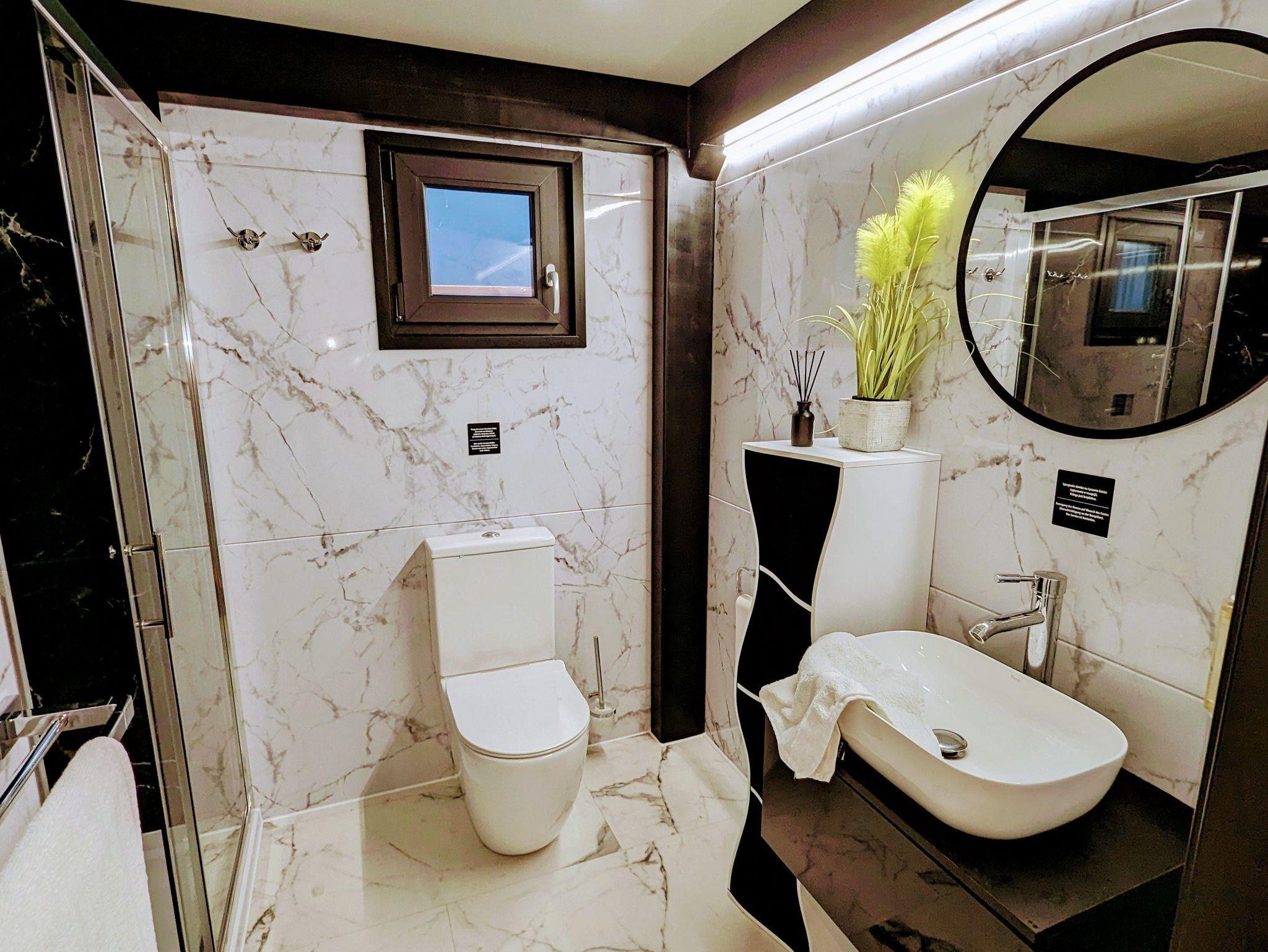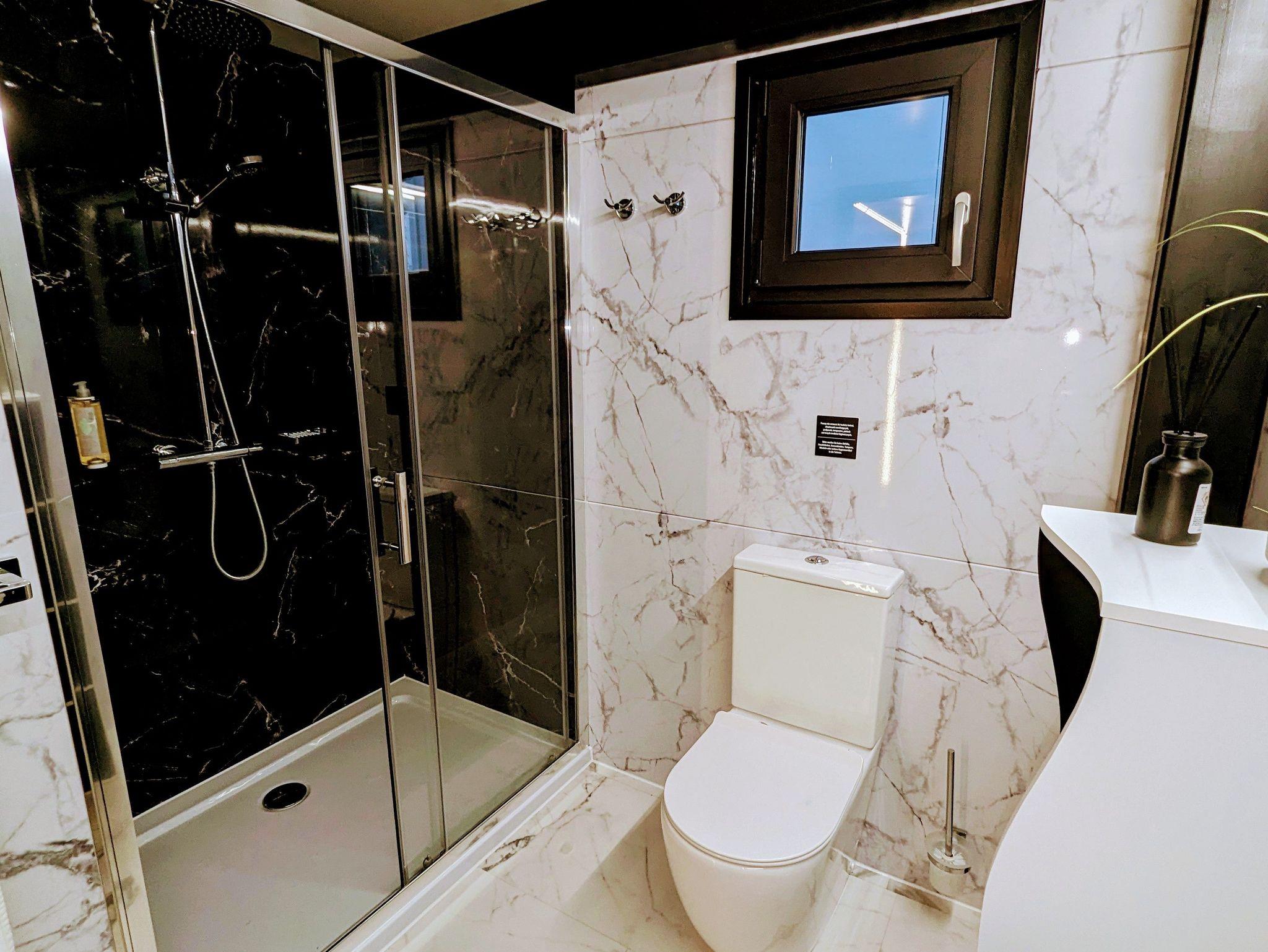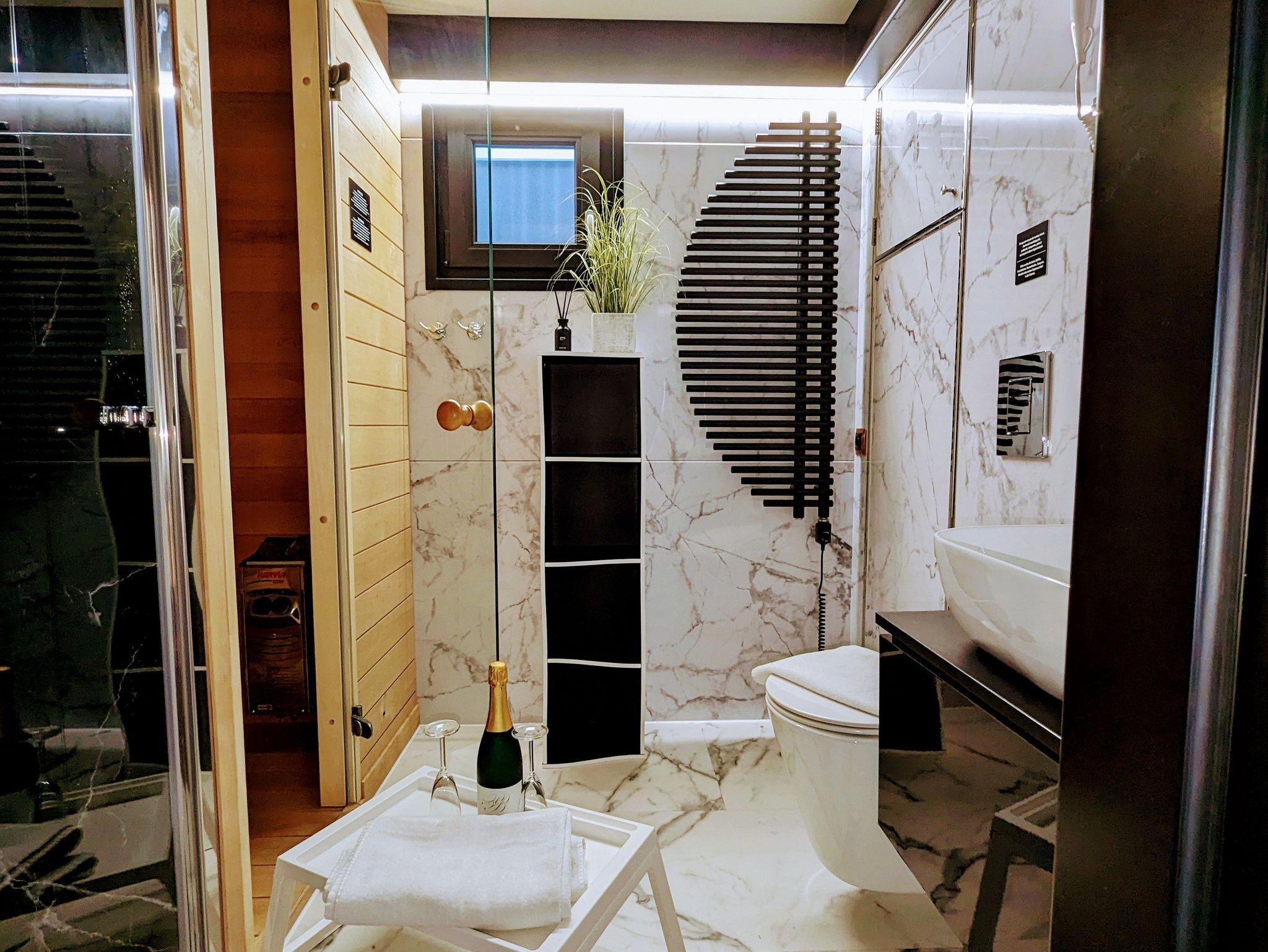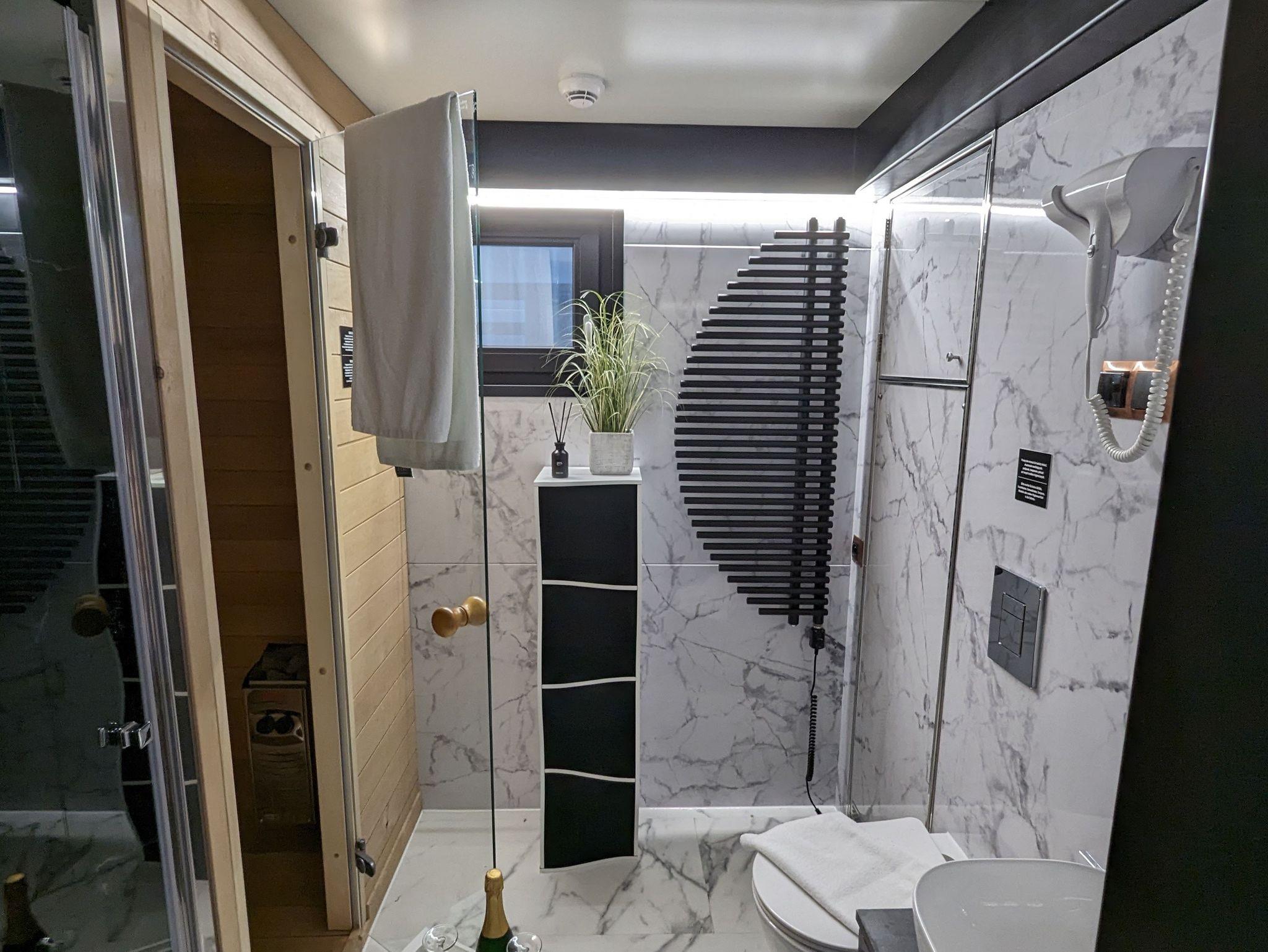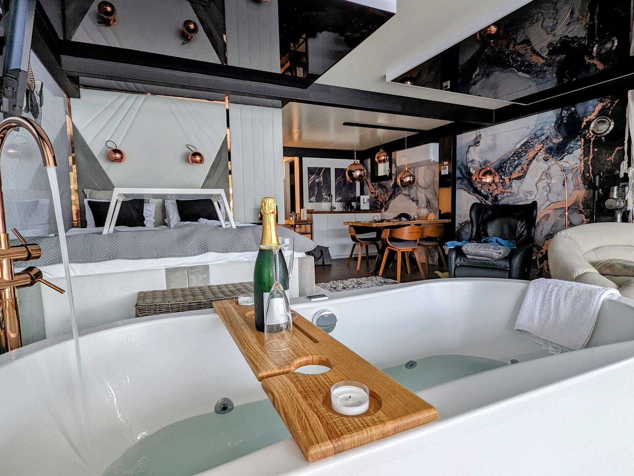 Der offene große Wohn-/Schlafbereich mit Essecke bestimmt den Auftritt des schwimmenden Apartments. Ein klassicher Kamin, eine Whirlwanne vor dem Doppelbett (140 x 200 cm), ein elektrischer Massagesessel und eine kleine Trockensauna bieten die Möglichkeit für ganz persönliche Wellnesszeiten. Eine Essecke mit kleiner Küchenzeile mit Kühlschrank, Spüle, BEKO-Kaffeemaschine, Wasserkocher und Toaster, sowie Eiswürfelmaschine gehören zur Ausstattung um eine Eigenversorgung zu ermöglichen. Frühstück (auch zur Abholung an Bord) und kleine Gerichte können im Hafenbistro gleich um die Ecke genossen werden. Im Wohnbereich gibt es eine Hängematte und 2 Yogamatten. Ferner sorgen eine Klimaanlage mit Heizfunktion im Wohnbereich und das große Panoramafenster mit atemberaubenden Blick auf den Hafen und Boote für Entspannung pur. Eine 2. kleine Kajüte mit Doppelbett (140 x 200) runden den Wohnbereich ab. W-LAN, 2 Smart-TV und eine Bose-Homesound 500-Anlage gehören zur Entertainmentausstattung. 2 Bäder mit großen Duschbereichen, Waschbecken und WC stehen im Sanitärbereich zur Verfügung. Im Eingangsbereich auf einer kleinen Terrasse befindet sich eine kleine Sitzecke. Darüber hinaus befindet sich auf dem Dach der Hausboot-Suite noch eine zusätzliche Sitzgruppe mit Blick auf den Jasmunder Bodden.