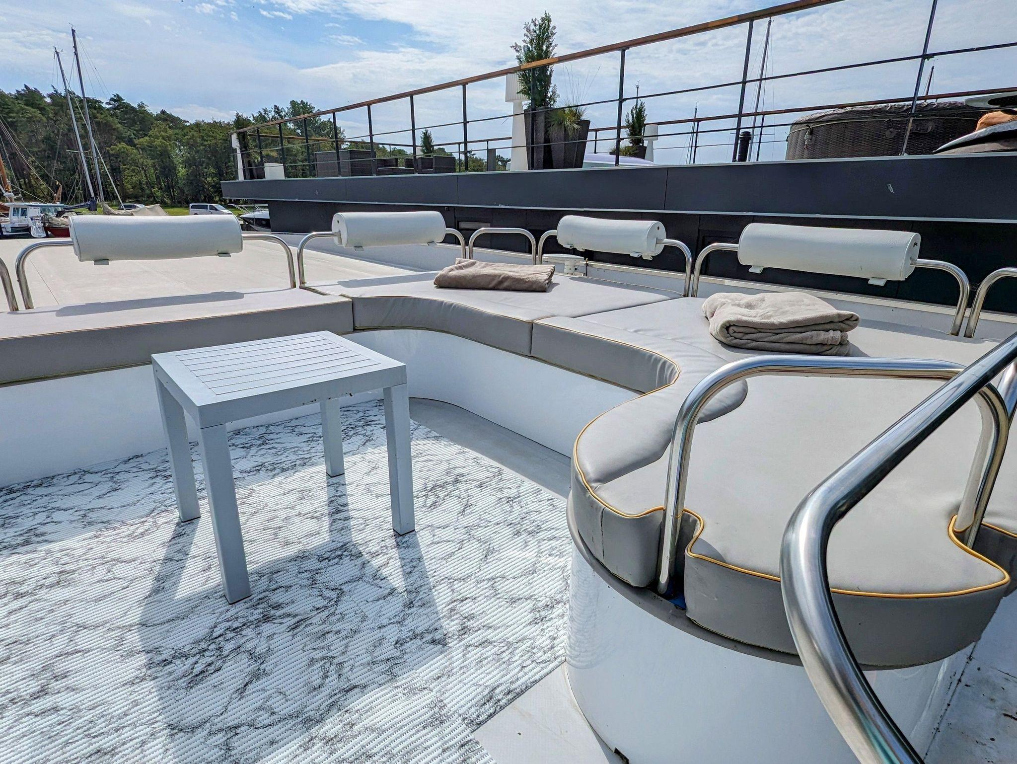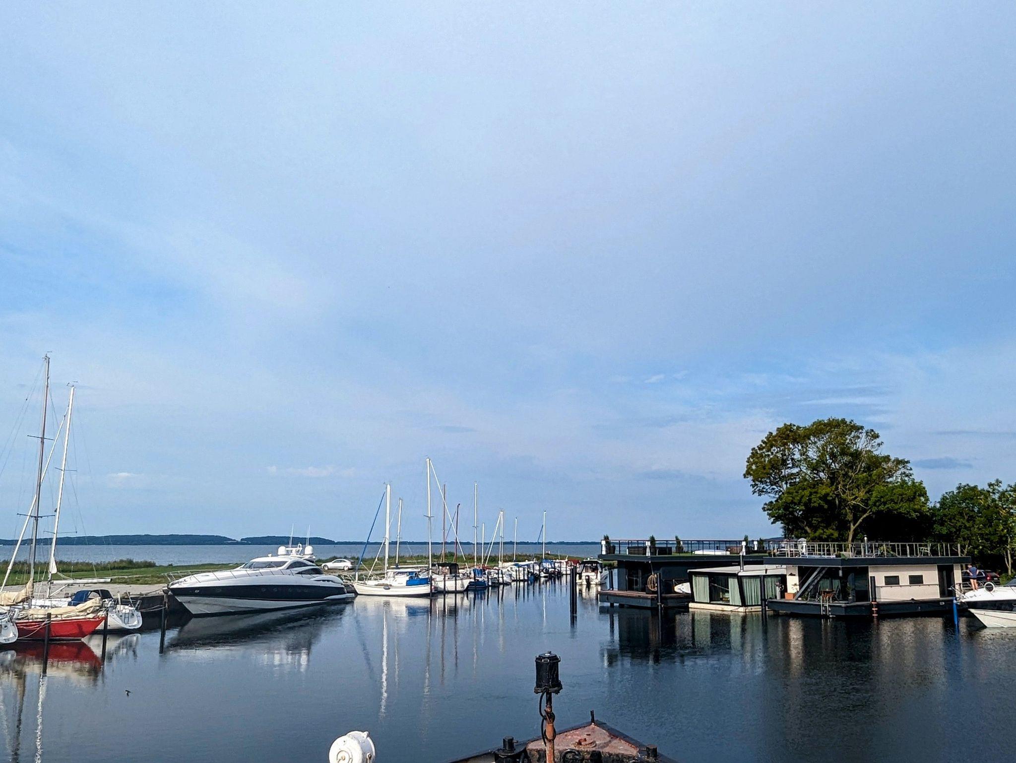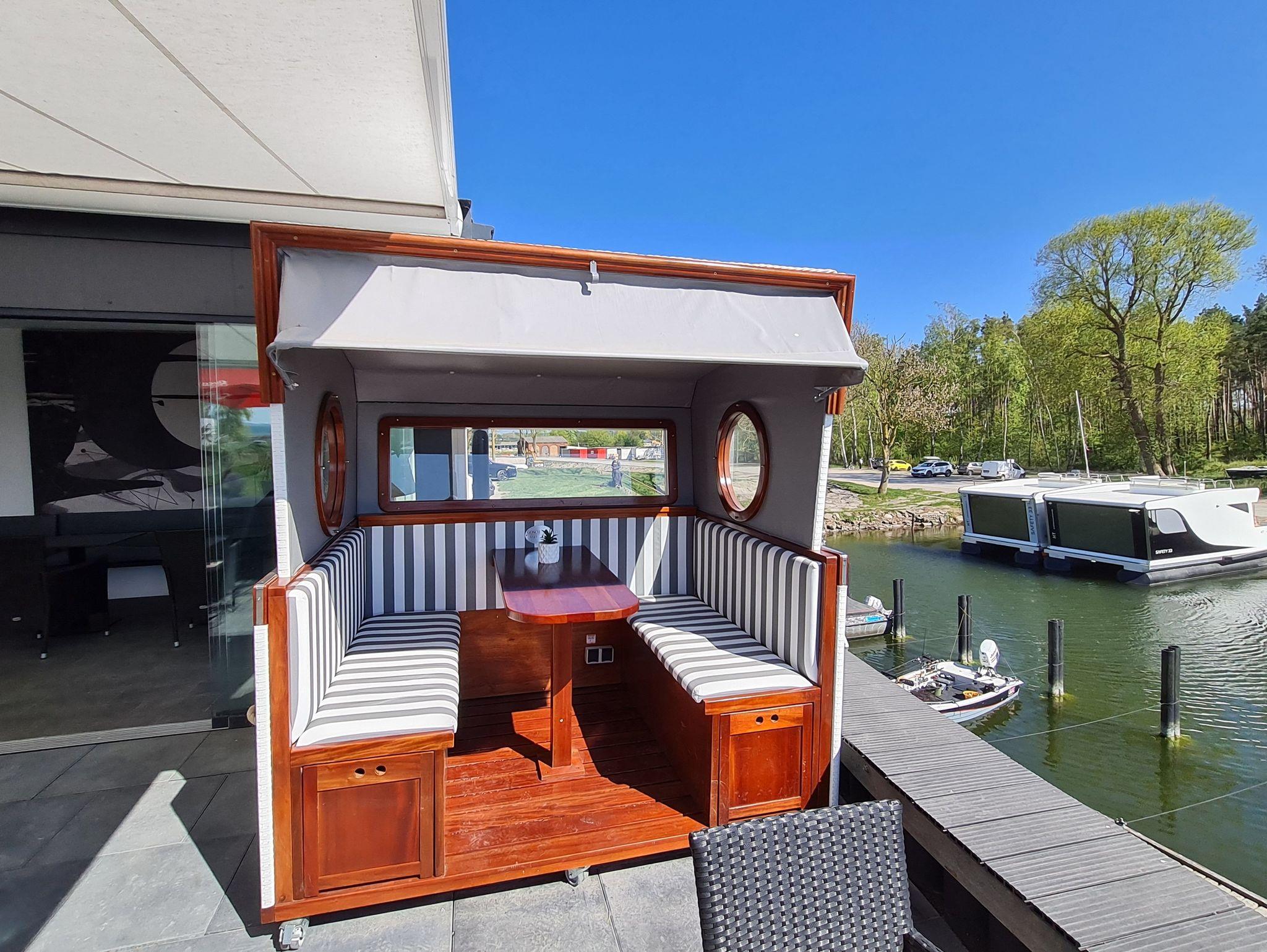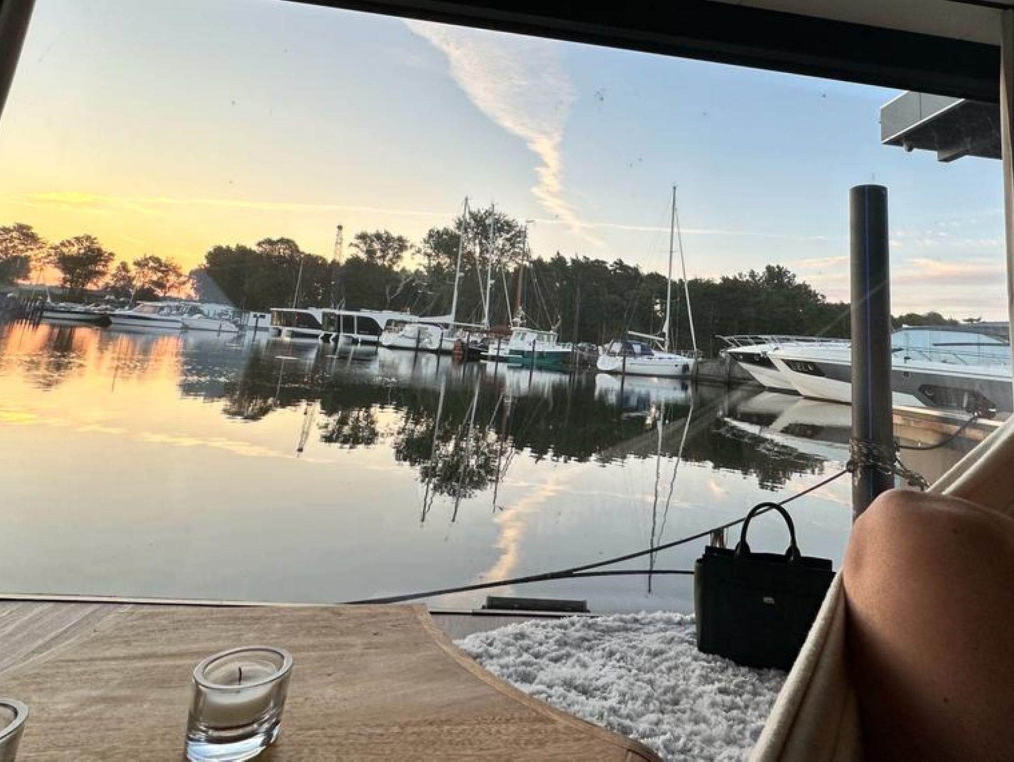 Luxus-Hausboot in der Marina Martinshafen mit Sauna, Whirlpool, Kamin und Panoramablick auf Rügens Hafen.