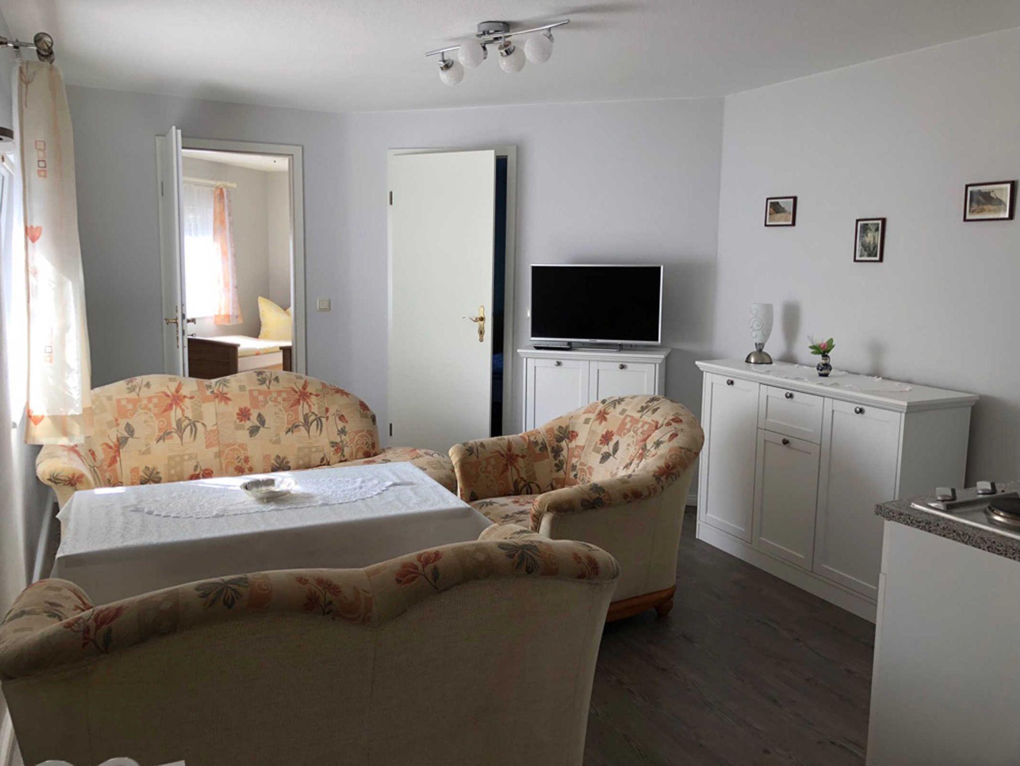 - Wohnzimmer mit Flachbild-TV, freies W-LAN, gemütlicher Sitzecke und integrierter Pantryküche
