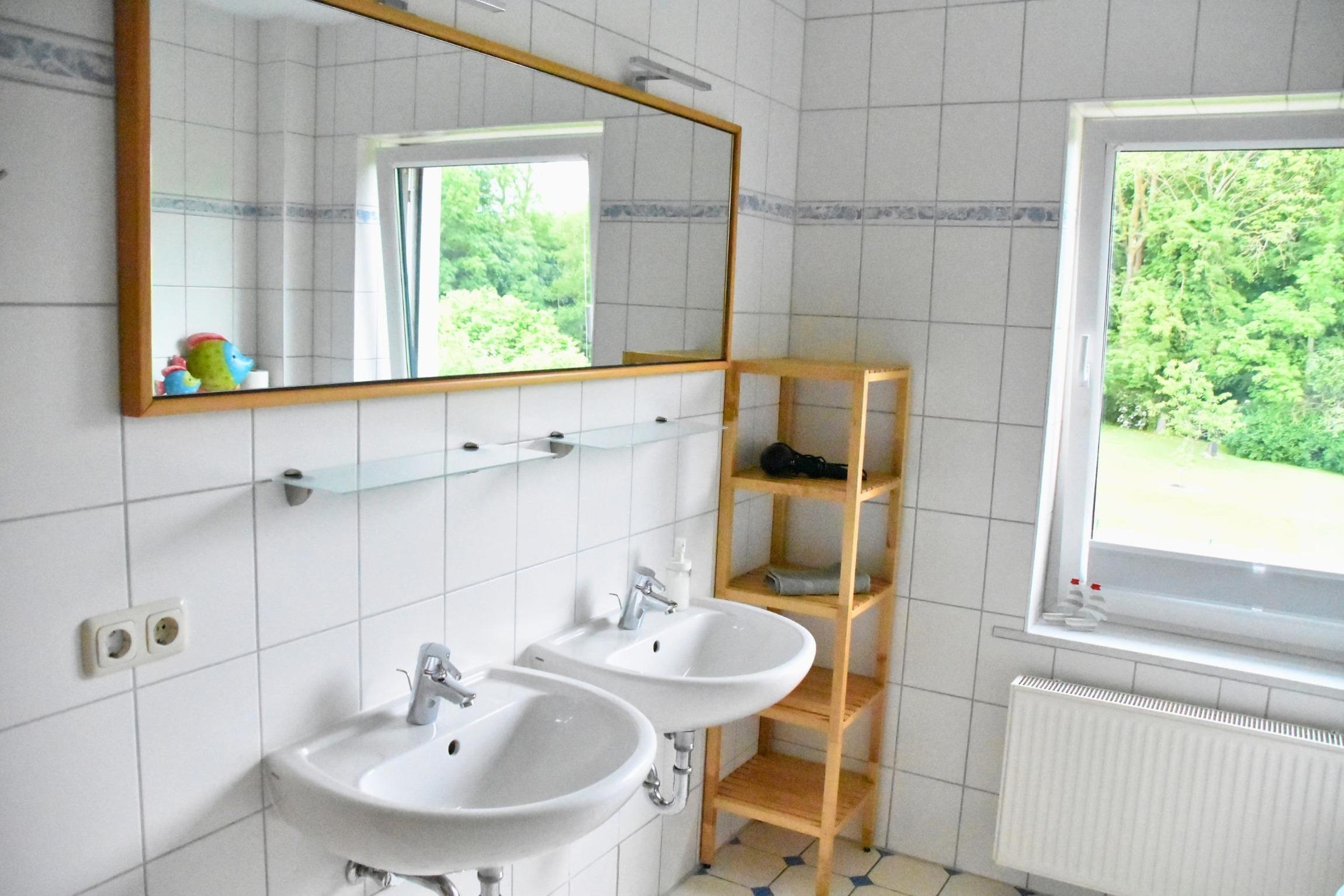 Auf dieser Etage gibt es ein geräumiges Schafzimmer (ca 20 qm) mit Zwei Einzelbetten und einem Eragenbett, dazu ein weiteres Elternschlafzimmer mit Doppelbett mit ca 15 qm mit Blick in den Garten/Brunnenaue. Ein weiteres Kinderschlafzimmer bietet Platz mit ca. 15 qm für weitere 2 Gäste (Doppelbett). Ausserdem haben Sie ein großes Bad ( ca. 9 qm) mit Badewanne, Dusche, 2 Waschbecken. Alle Zimmer haben Fenster mit Sonnenschutz bzw. Insektenschutz.