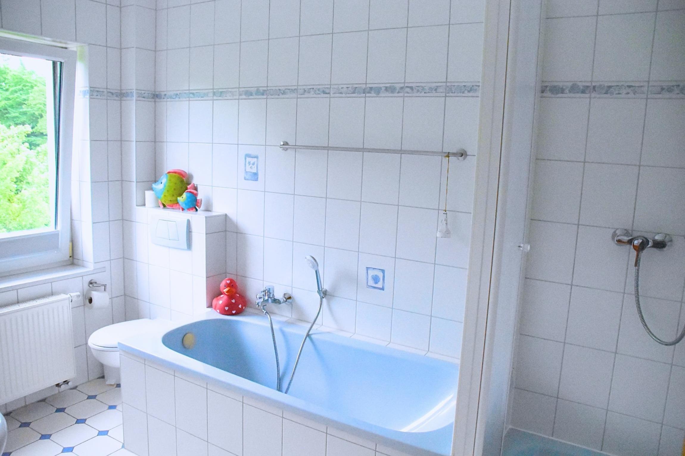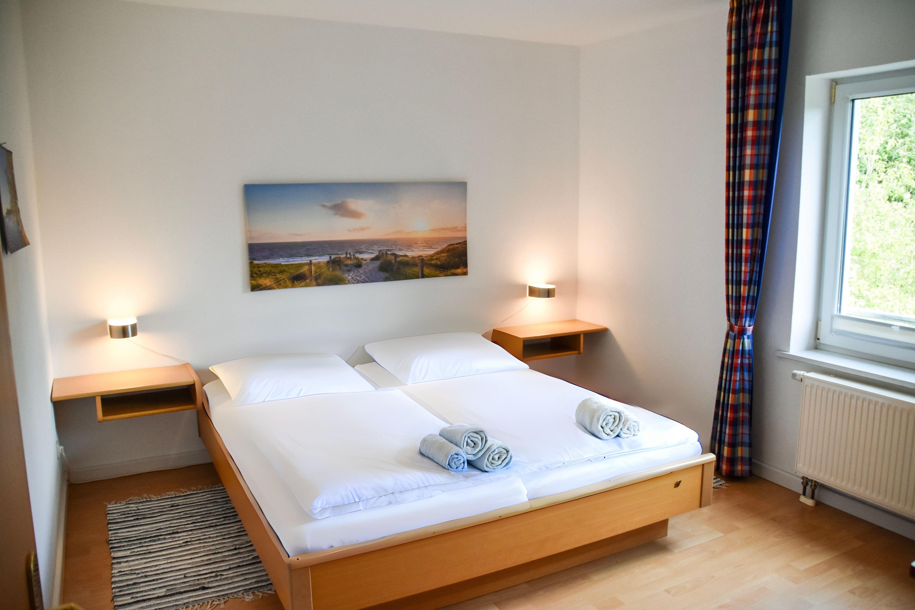 Auf dieser Etage gibt es ein geräumiges Elternschlafzimmer mit 2 Einzelbetten (90 x 200 cm) und einem Etagenbett (90x200cm). Ein weiteres Elternschlafzimmer ( Doppelbett 180x200 cm) mit Blick in den Garten Richtung Parkanlage "Brunnenaue". Ein weiteres Schlafzimmer für weitere 2 Gäste (Doppelbett 180x200 cm). Auch haben Sie auf dieser Etage ein großes Bad mit Badewanne, Dusche, zwei Waschbecken und Fön zur Verfügung. Alle Wohn- und Schlafzimmer haben Fenster mit Sicht- und Insektenschutz.
