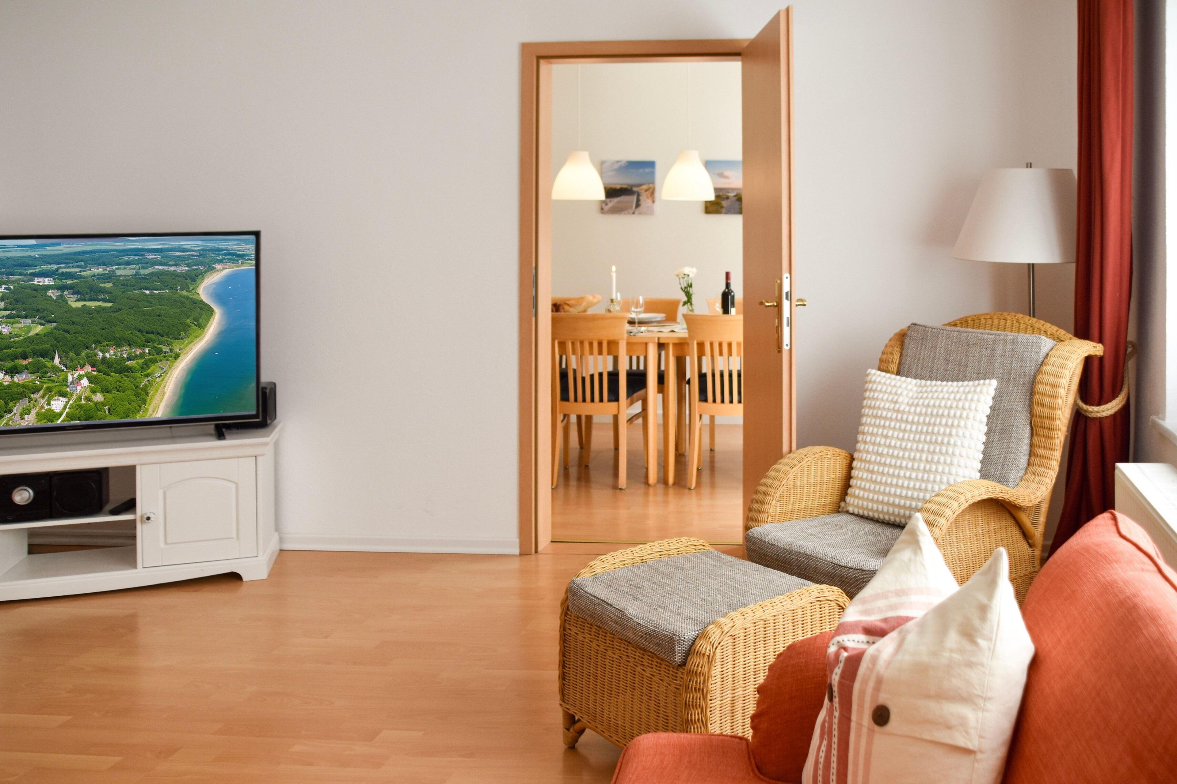 Der angrenzende helle und lichtdurchflutete Wohnbereich ( ca 25 qm) mit großen Fenstern bietet viel Geräumigkeit, bequeme Sitzmöbel, 55 Zoll Smart - TV. In diesem Geschoss finden Sie auch ein Gäste WC.