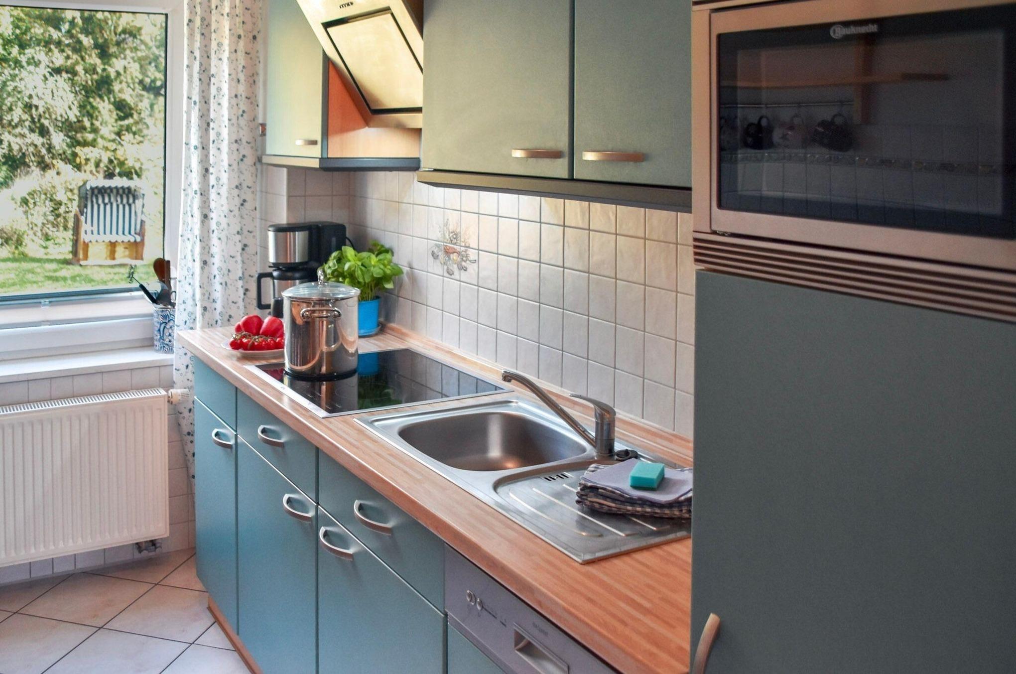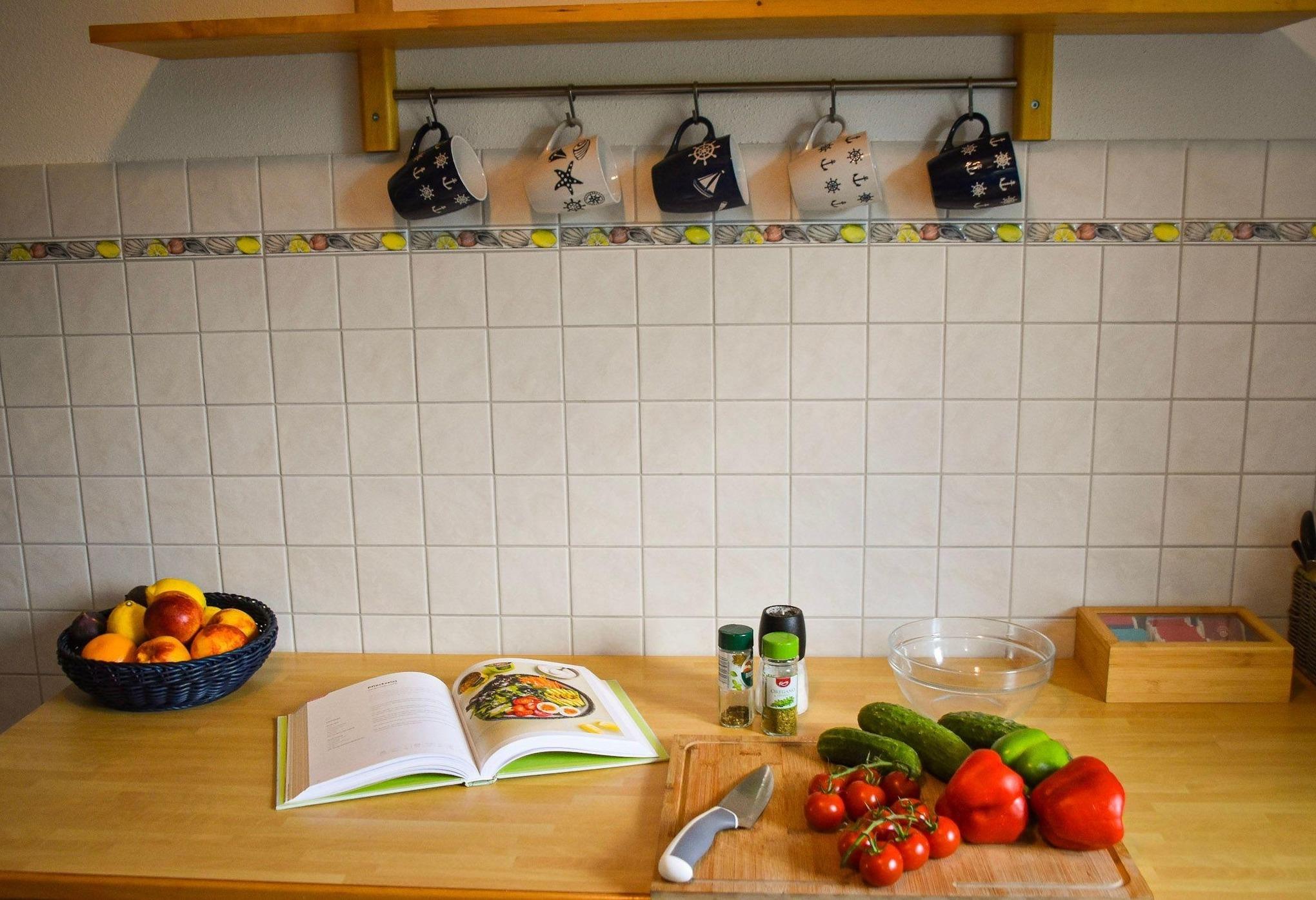 Großer Flur, Küche mit angrenzendem Essbereich für bis zu 8 Gäste. Ausgestattet ist die Küche z.B. mit einem Geschirrspüler, einer Mikrowelle, einem Toaster, einem Wasserkocher, einem Kühlschrank, einer Filterkaffeemaschine, einem modernen Cerankochfeld. Jede Menge Stauraum ist vorhanden.