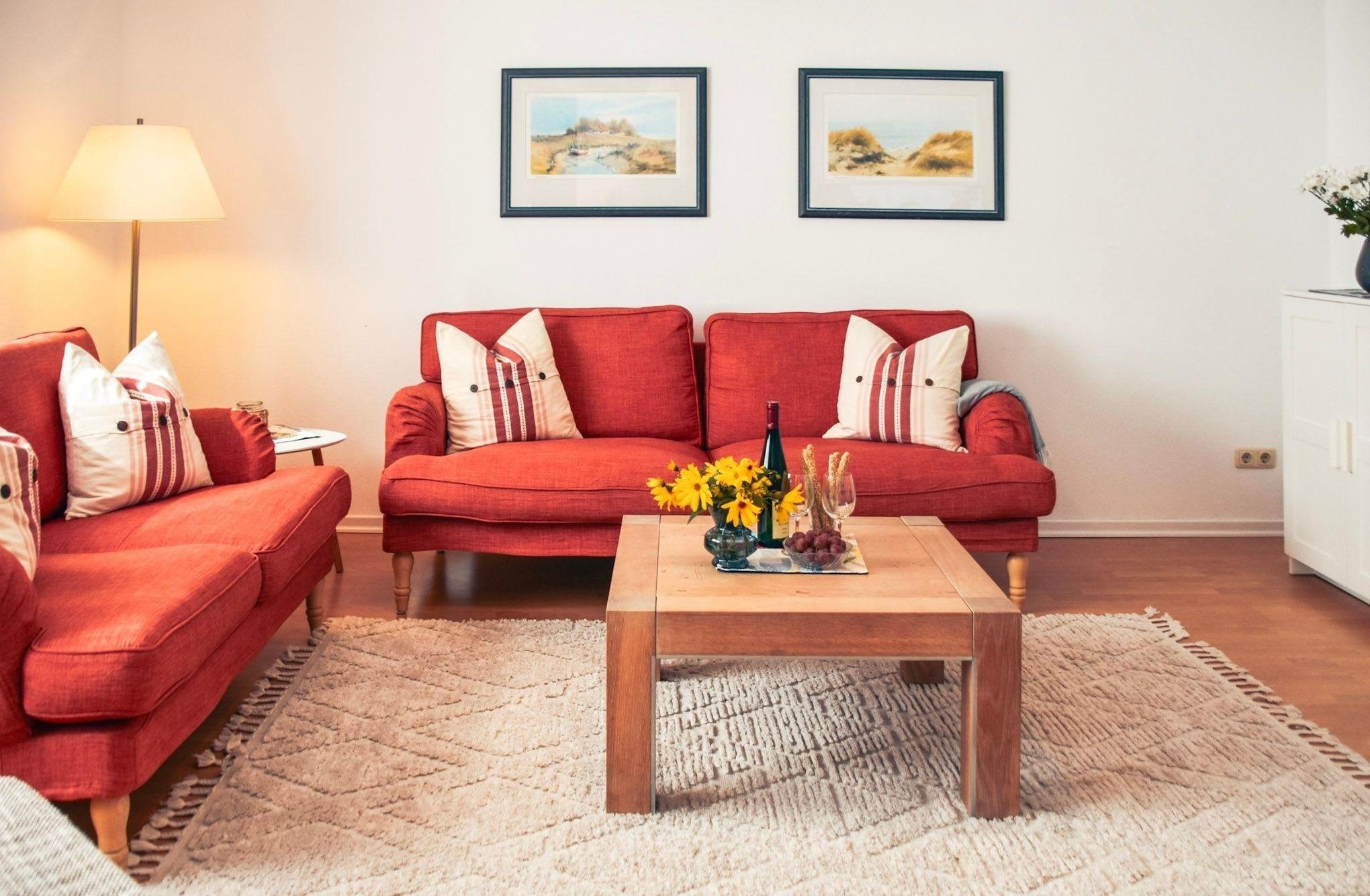 Der angrenzende helle und lichtdurchflutete Wohnbereich mit den großen Fenstern bietet viel Geräumigkeit, bequeme Sitzmöbel und einen 55 Zoll Smart - TV. In diesem Geschoss finden Sie auch ein Gäste-WC.