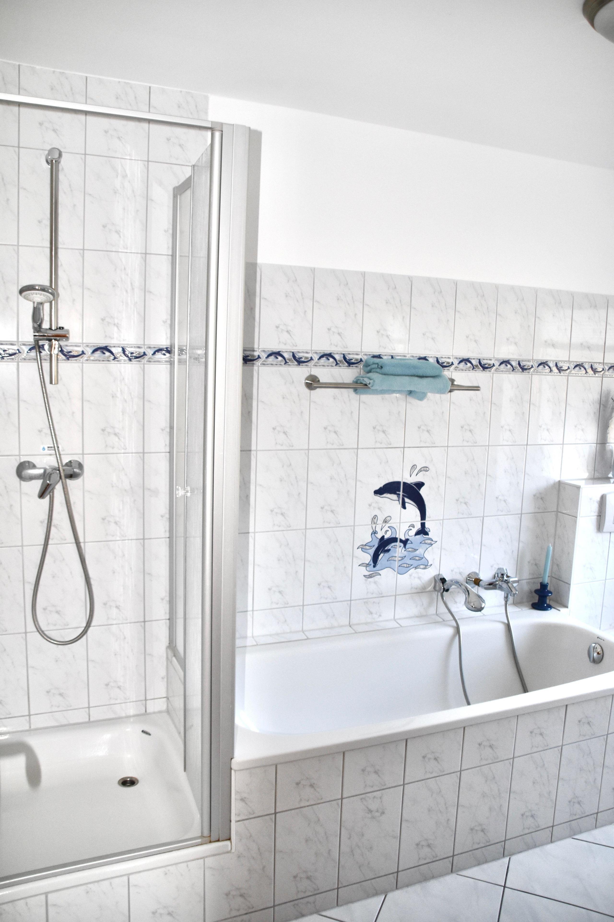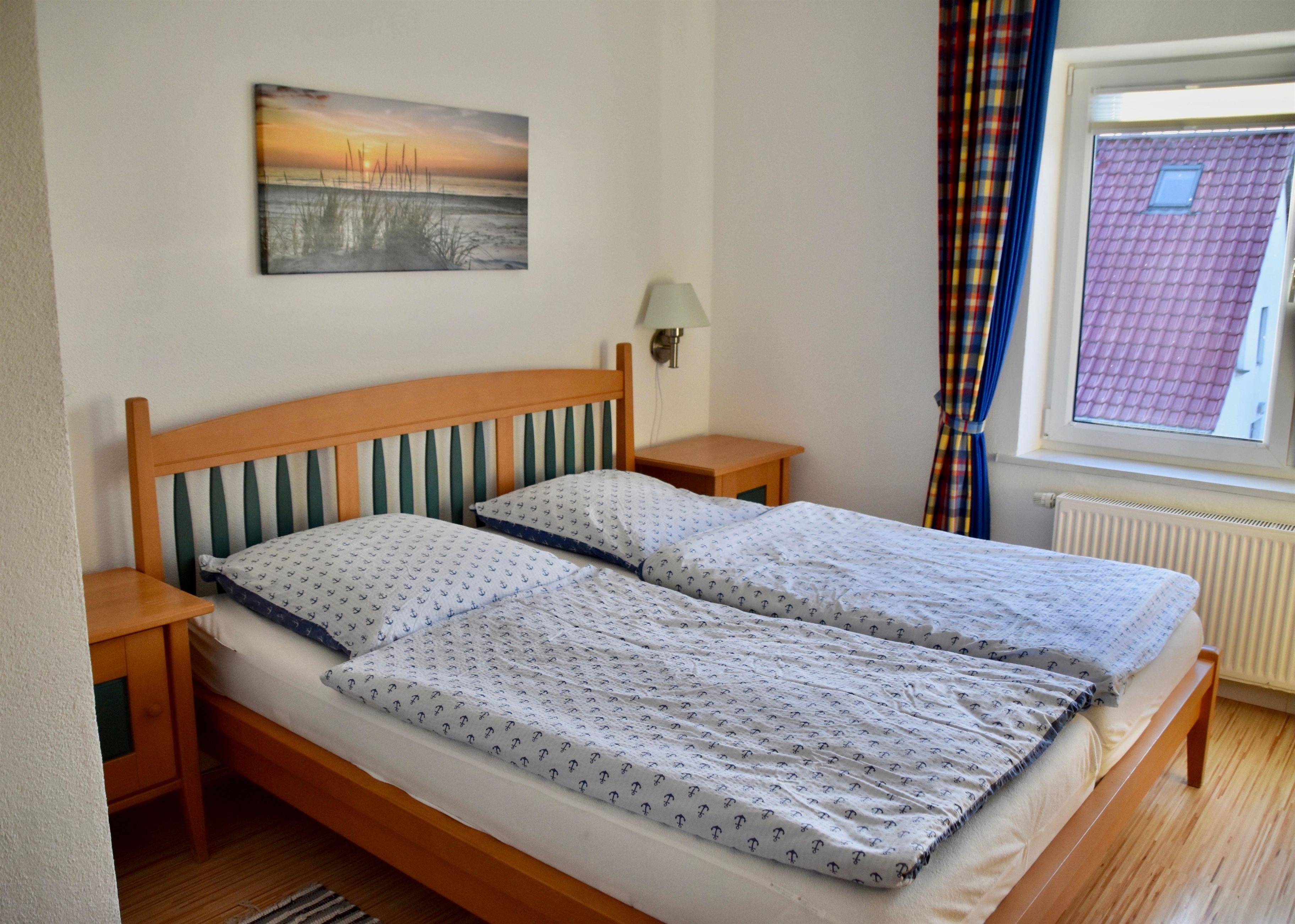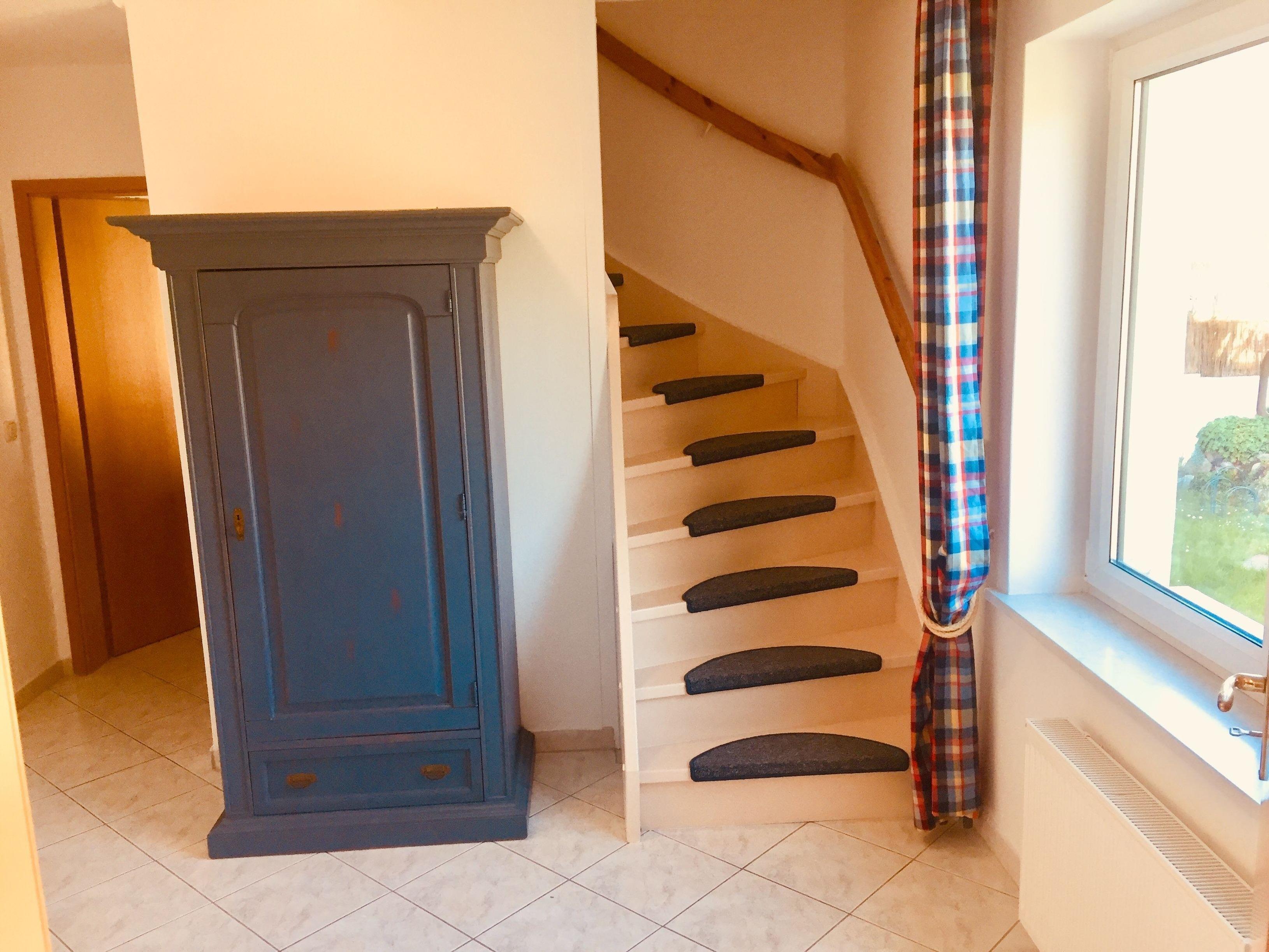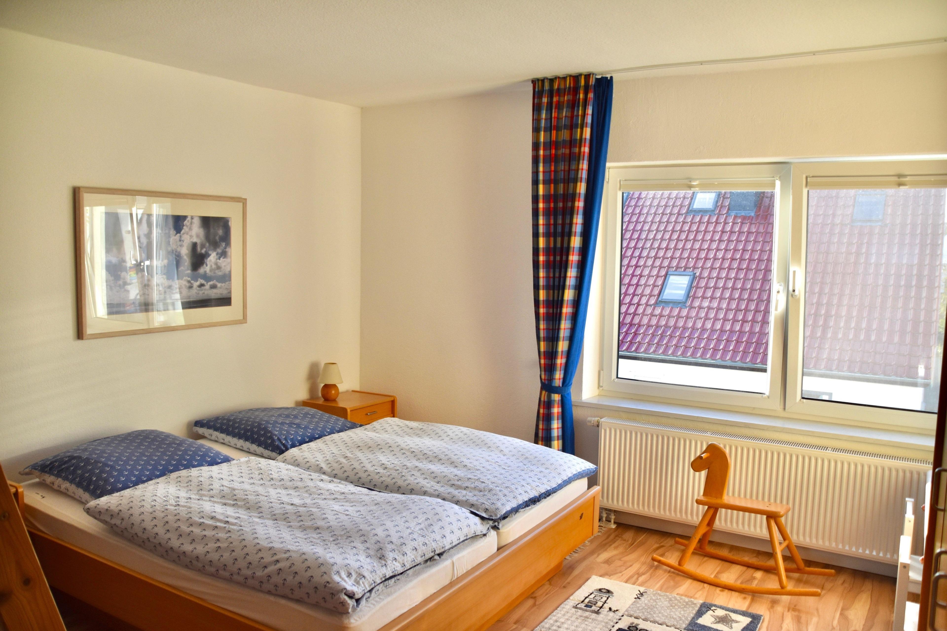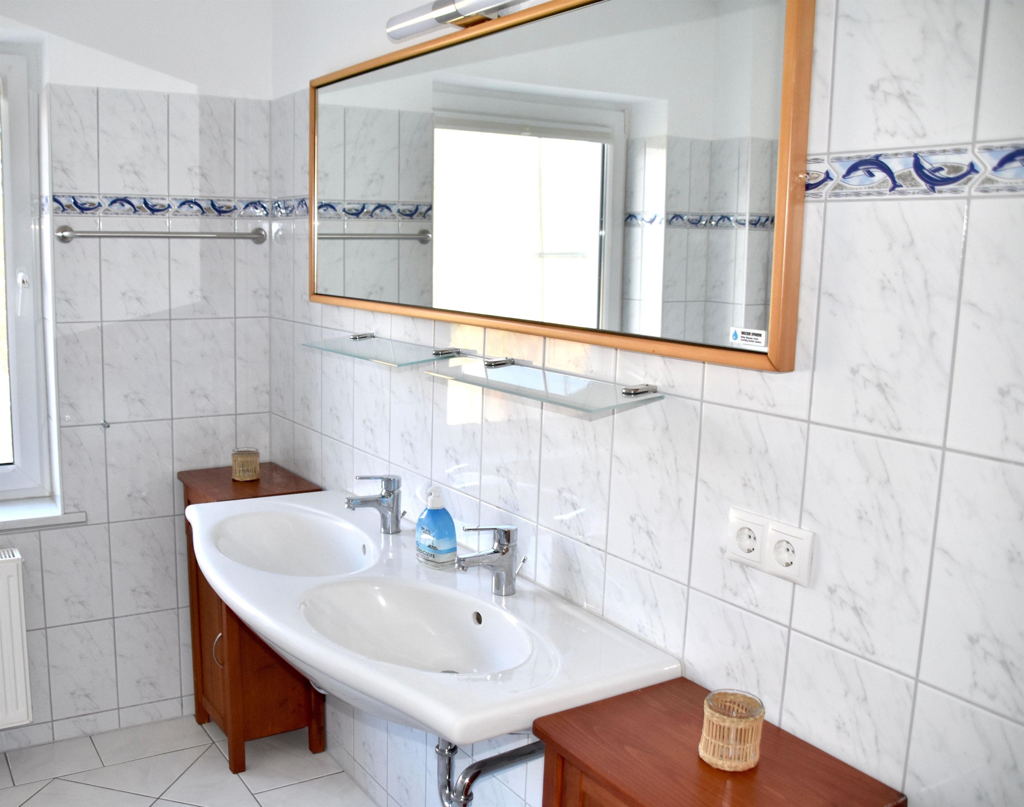 Auf dieser Etage gibt es ein geräumiges Elternschlafzimmer mit einem Doppelbett (180 x 200 cm) und einen Etagenbett (90 x 200 cm). Ein weiteres Elternschlafzimmer ( Doppelbett 180 x 200 cm) mit Blick in den Garten Richtung Parkanlage "Brunnenaue". Ein weiteres Schlafzimmer für weitere 2 Gäste (Doppelbett 180x200 cm). Auch haben Sie ein großes Bad mit Badewanne, Dusche, zwei Waschbecken und Fön. Alle Wohn- und Schlafzimmer haben Fenster mit Sonnen- und Insektenschutz.