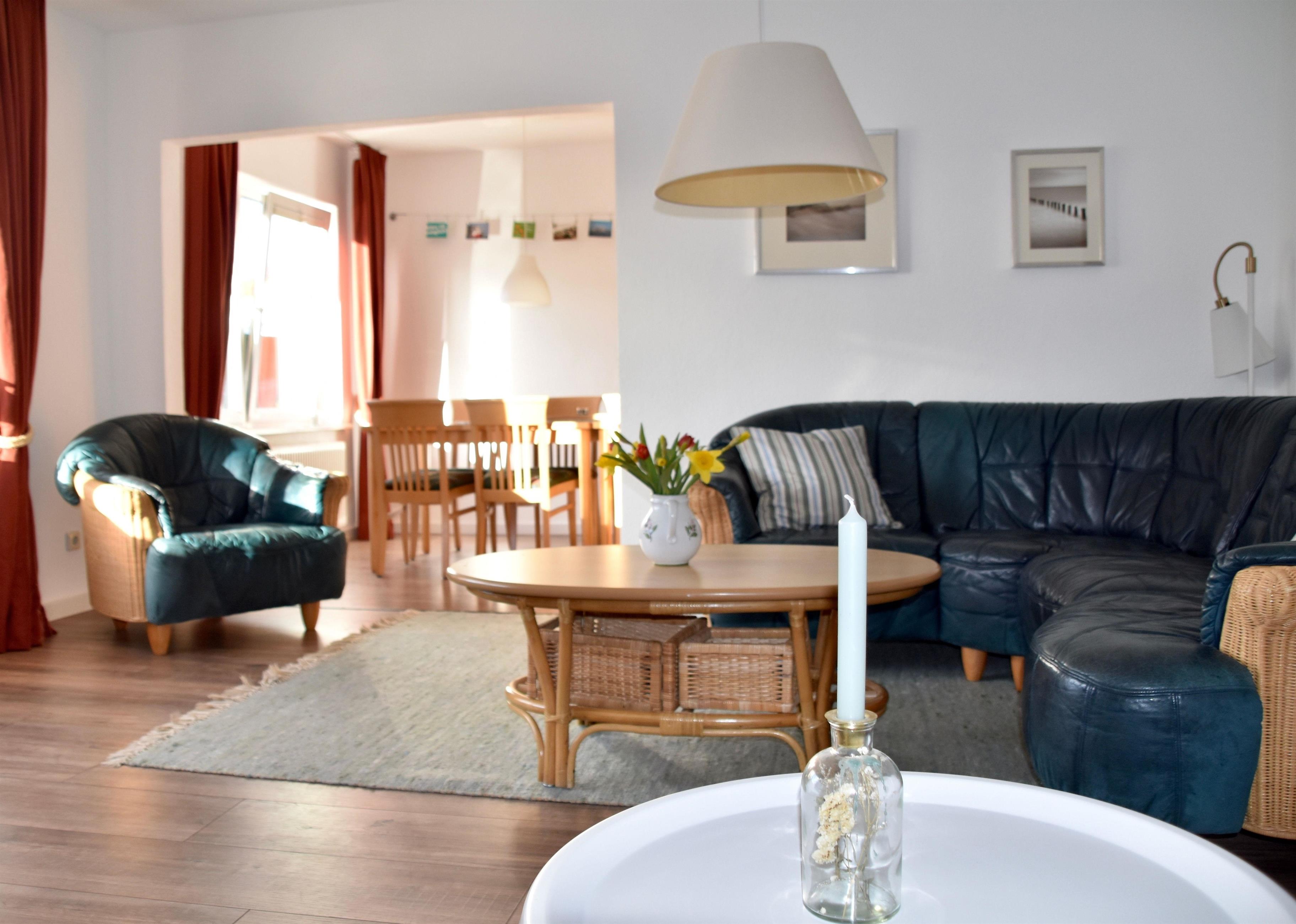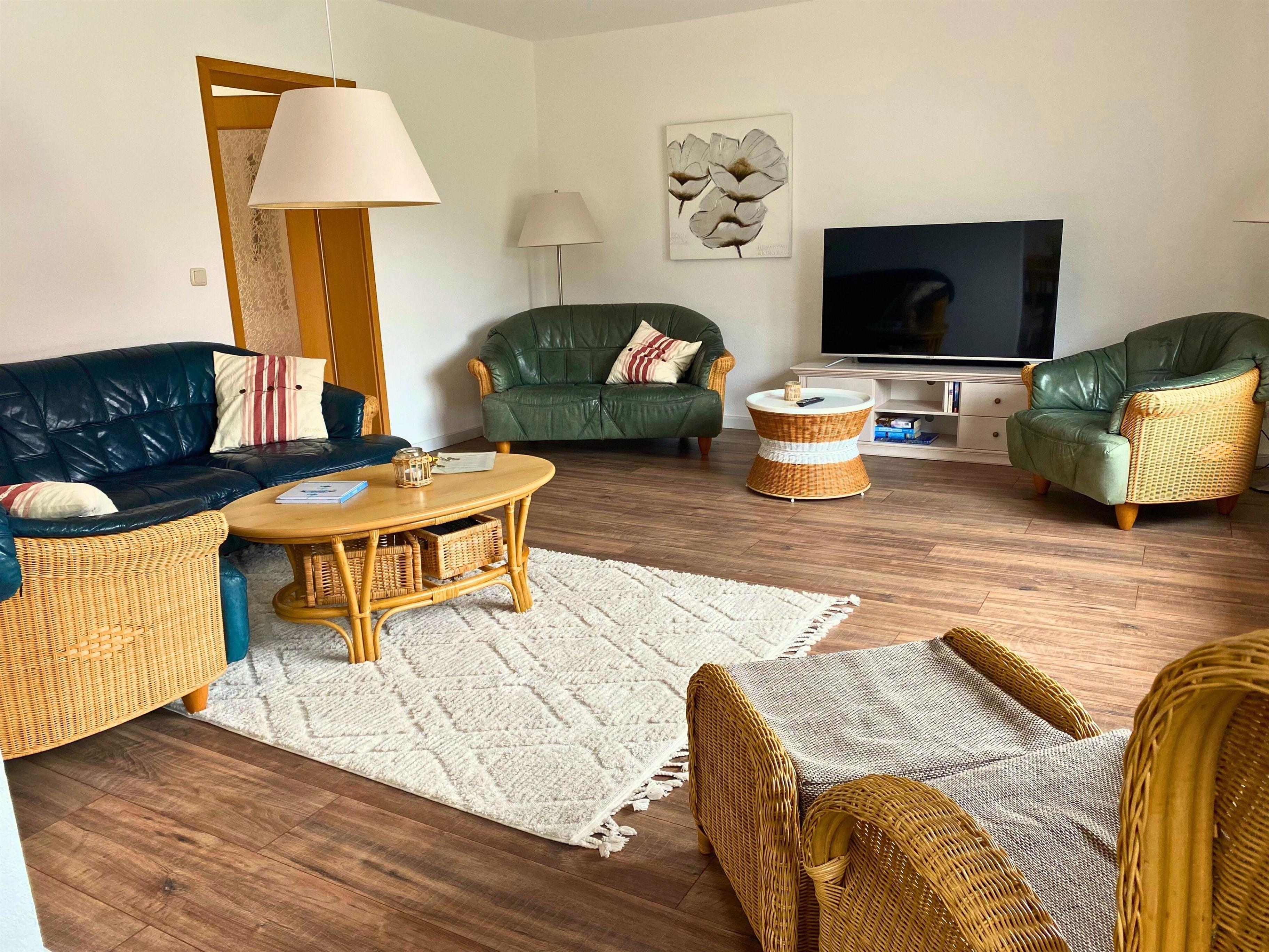 Der angrenzende helle und lichtdurchflutete Wohnbereich ( ca 25 qm) mit großen Fenstern bietet viel Geräumigkeit, bequeme Sitzmöbel, 55 Zoll Smart - TV. In diesem Geschoss finden Sie auch ein Gäste WC.