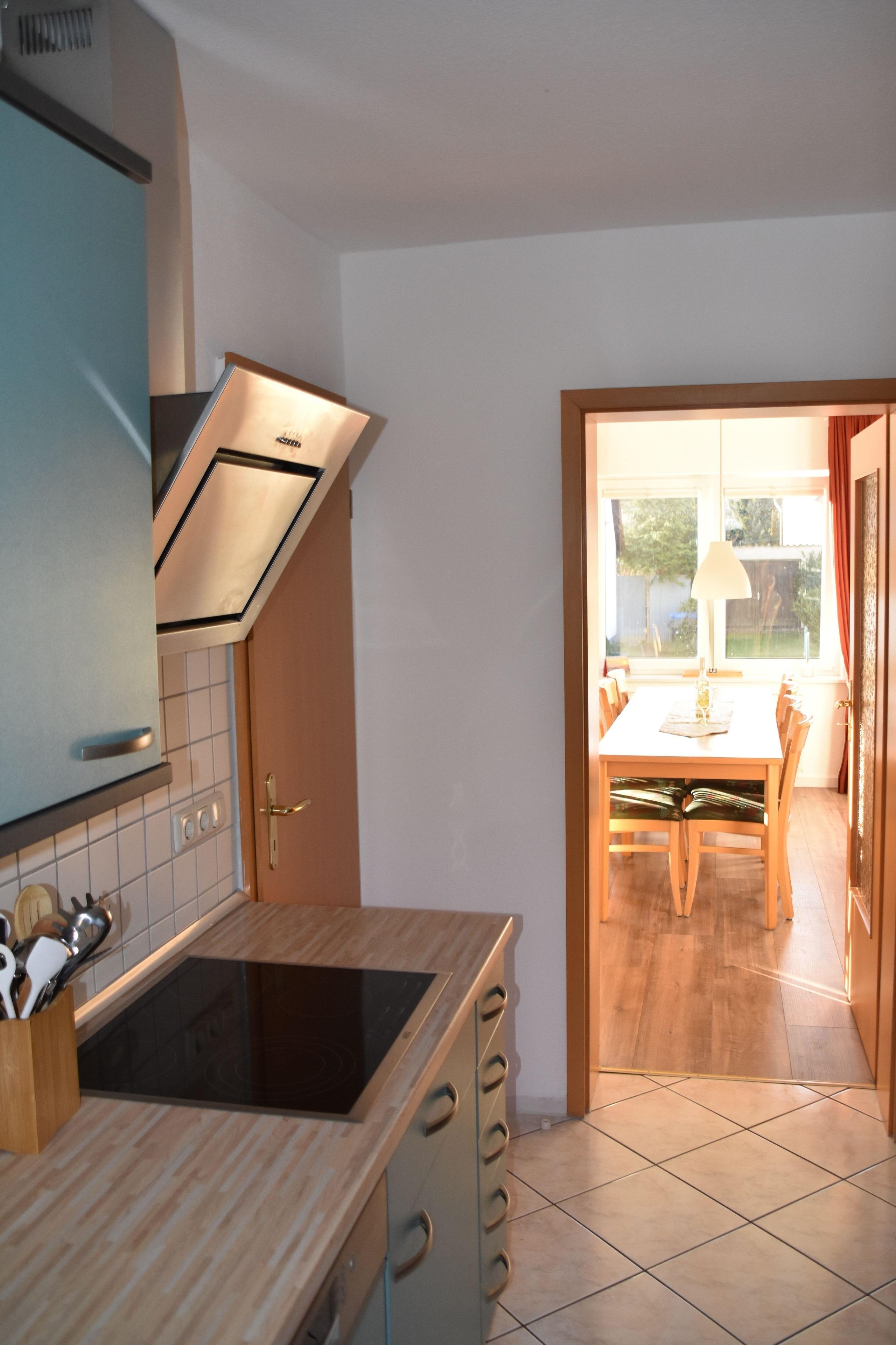 Großer Flur, Küche mit angrenzendem Essbereich für bis zu 8 Gäste. Ausgestattet ist die Küche z.B. mit einem Geschirrspüler, einer Mikrowelle, einem Toaster, einem Wasserkocher, einem Kühlschrank, einer Filterkaffeemaschine, einem modernen Cerankochfeld. Jede Menge Stauraum und Arbeitsfläche sind vorhanden.